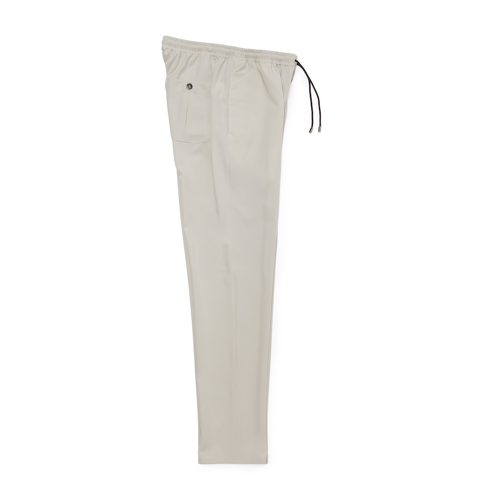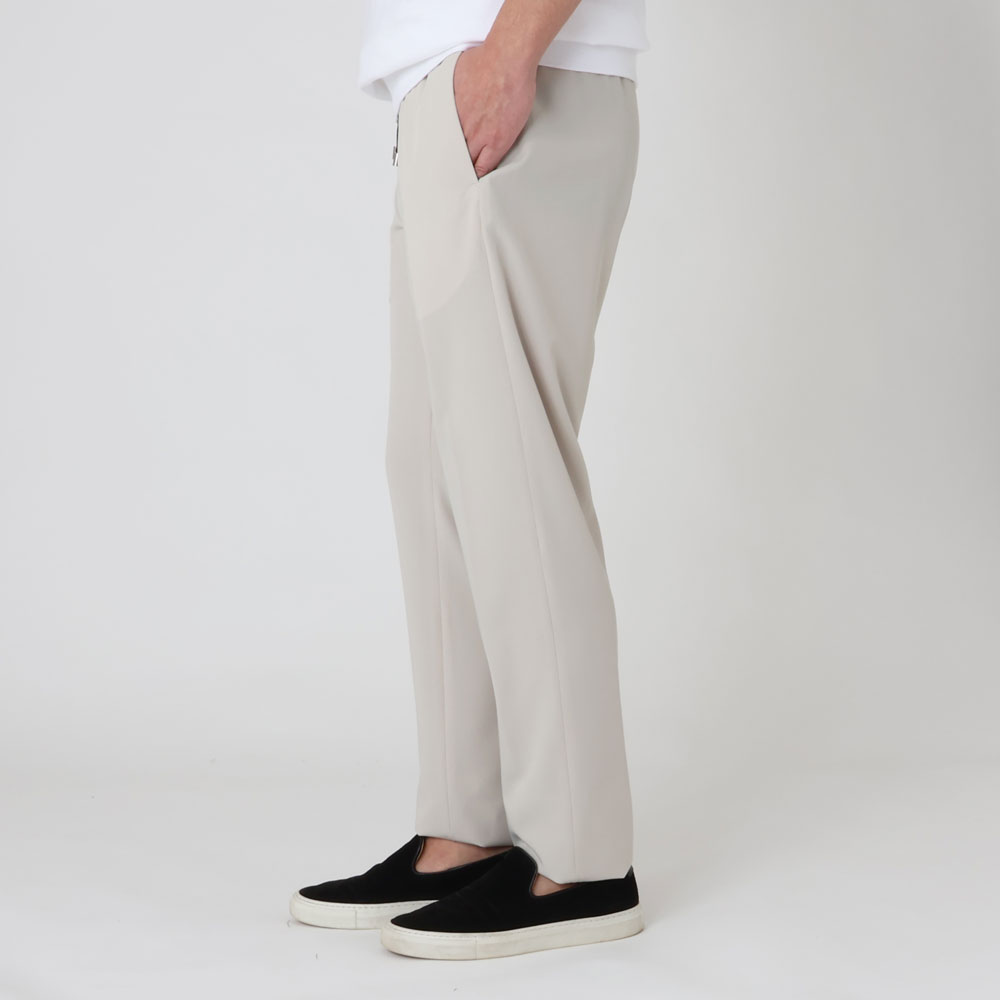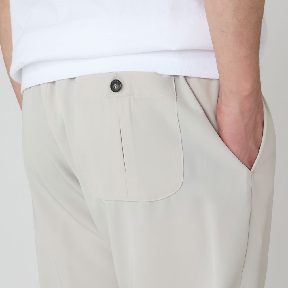 ・かなりスポーティなデザインでありながら「giabsarchivio(ジャブスアルキヴィオ)」ならではのエレガントなシルエットは健在。緩やかで美しいテーパード具合がリラックス感を醸します。フロントのドローコード、ボタン付きでプリーツの入った後ろポケットがアクセント。