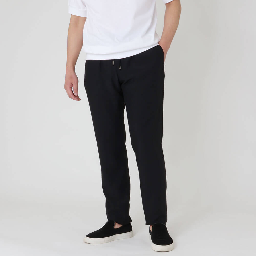 サラッとしたタッチで、まるで“はいていない”かのような軽快なはき心地。ゆとりのあるシルエットながら程よいテーパードによりきれいなラインを描き、生地の落ち感も実にエレガントです。ウエストの締め付けがなく、長時間の移動やデスクワークでも快適。サイズ44を着用し、ちょうど良いサイズ感でした。