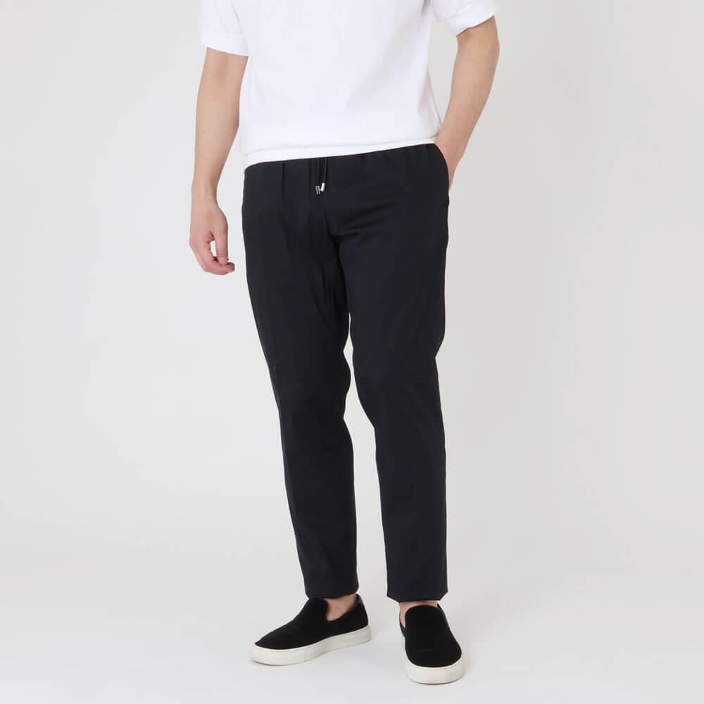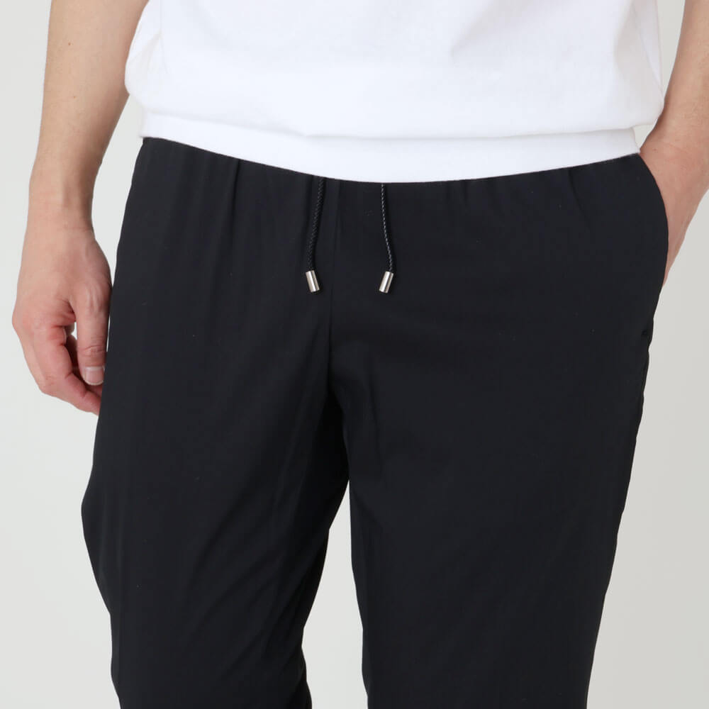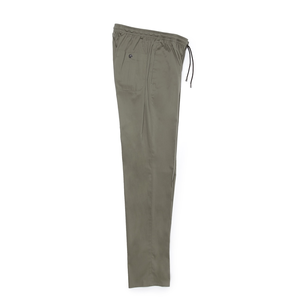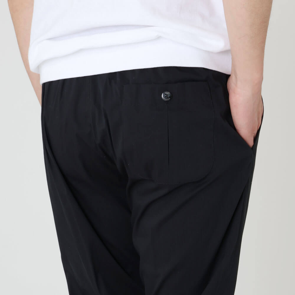 ・かなりスポーティなデザインでありながら「giabsarchivio(ジャブスアルキヴィオ)」ならではのエレガントなシルエットは健在。緩やかで美しいテーパード具合がリラックス感を醸します。フロントのドローコード、ボタン付きでプリーツの入った後ろポケットがアクセント。