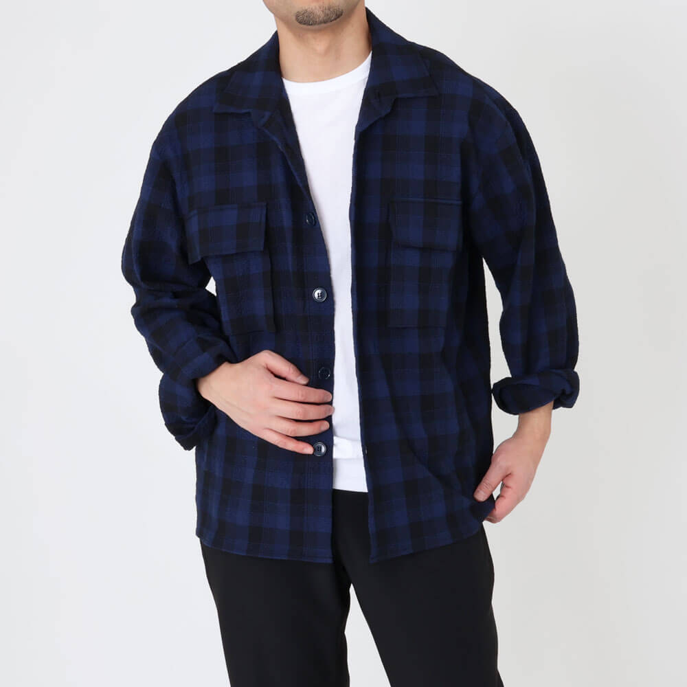 カモ / ストレッチ シアサッカー チェック シャツジャケット/NEEDLES NEW MAXI SHIRT SEERSUCKER NAVY CHECK