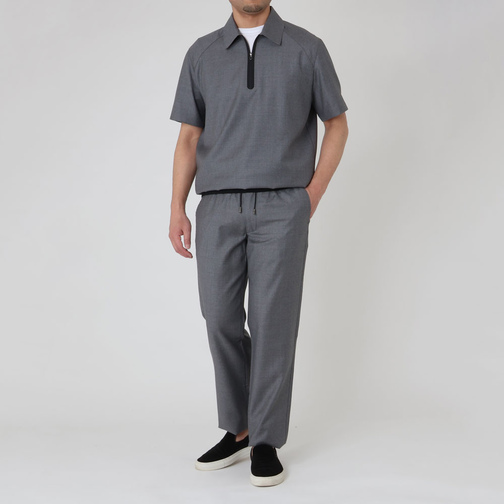 ・極細系を用いた先染めヴァージンウールのハーフジップポロとセットアップとなるリラックスパンツ。