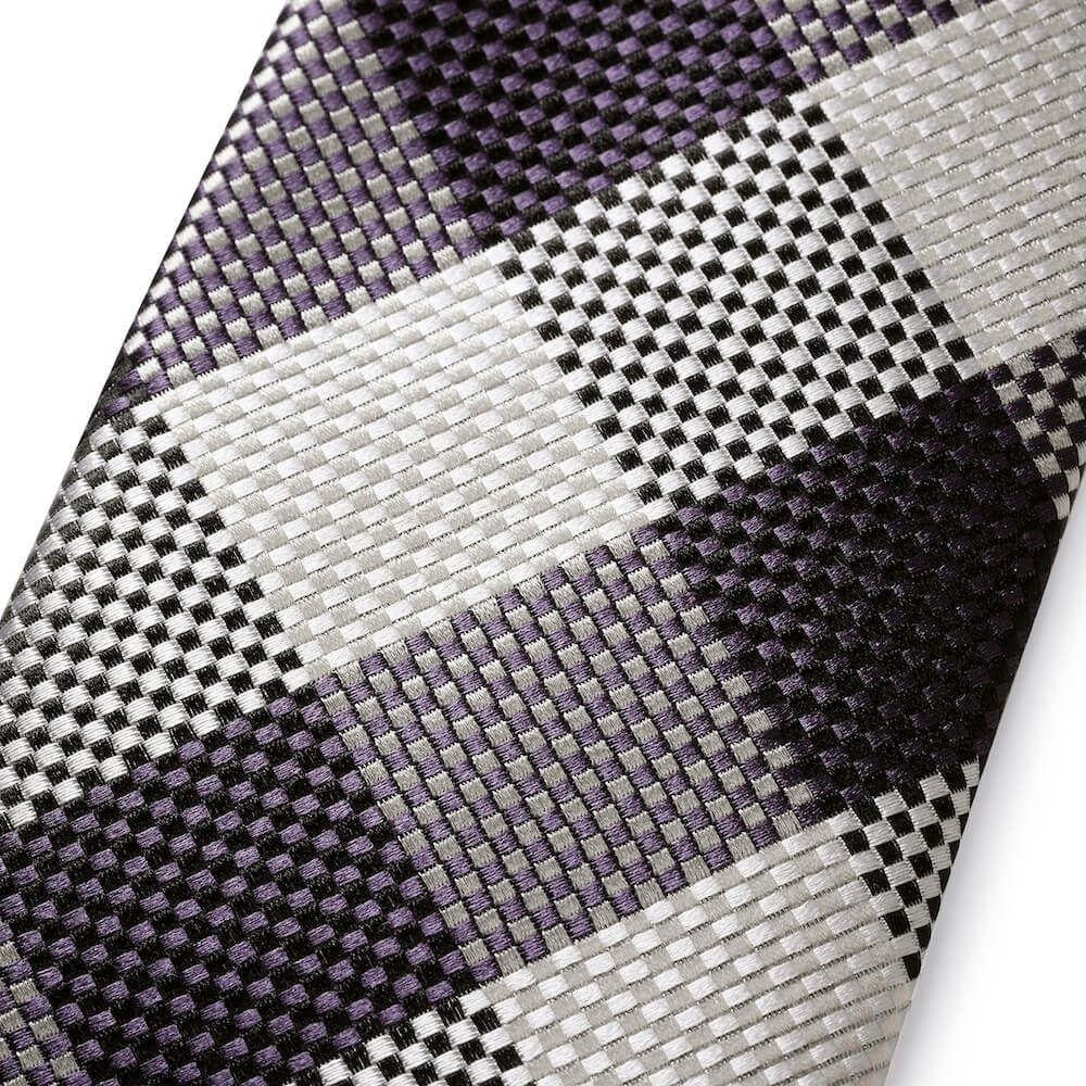 ・パープルがほんのりブリティッシュ味を、シルバーが軽やかさを醸すチェックタイ。光沢感あるシルク、はっきりとした柄と配色により、清潔感のある一本です。