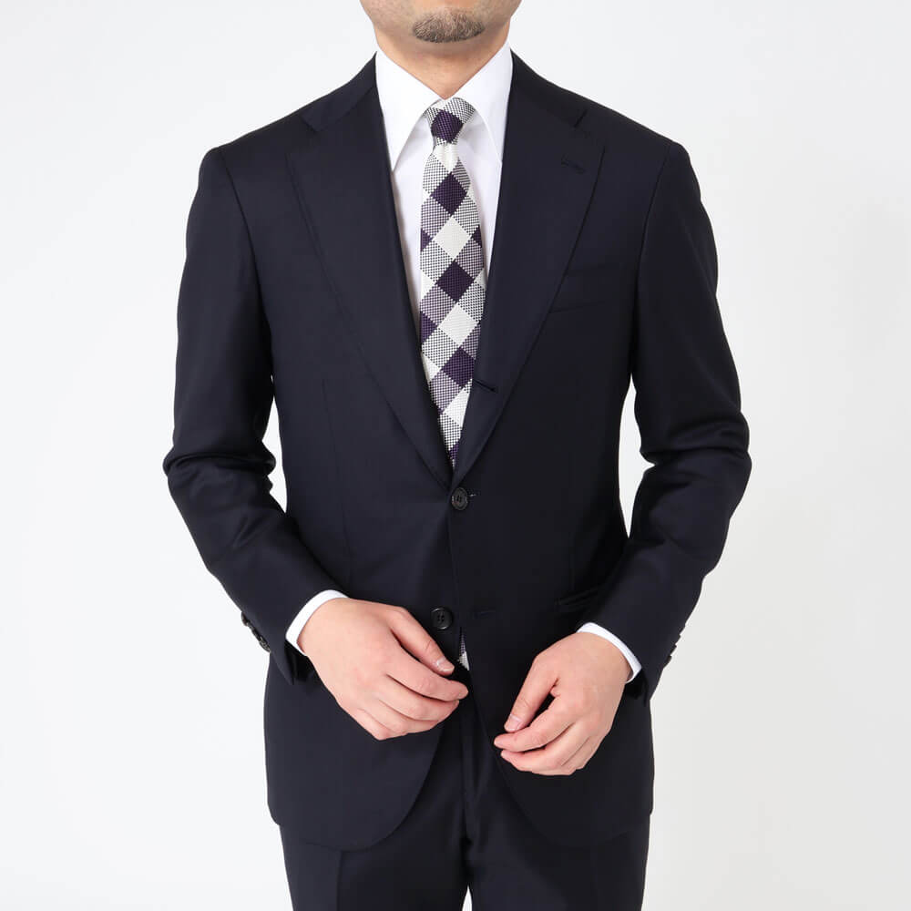 織りによる大きめのチェックであまり他では見ないデザイン。無地シャツはもちろん、細ストライプとの合わせも綺麗に決まり、Vゾーンを明るく上品に演出できます。程よいコシがあり、結びやすさも魅力です。