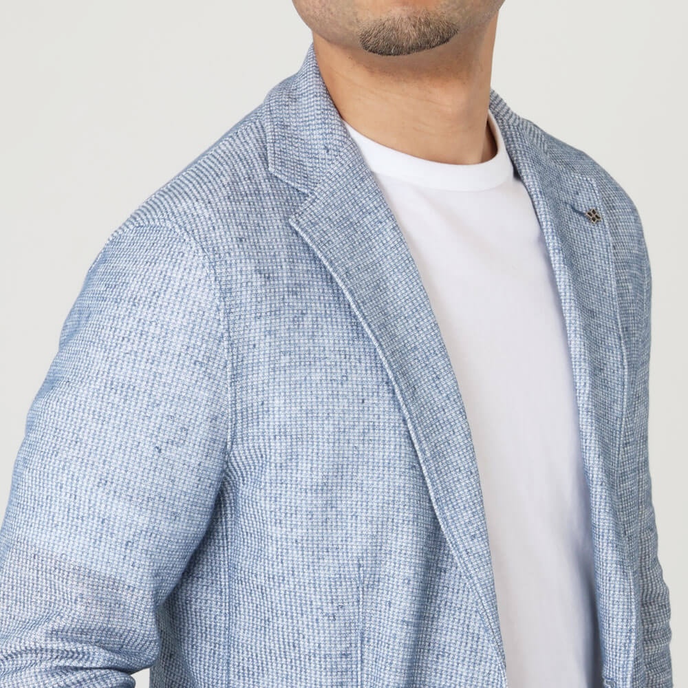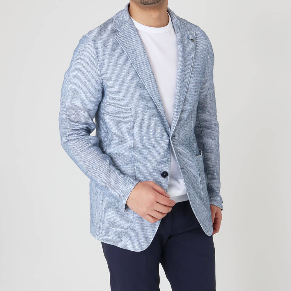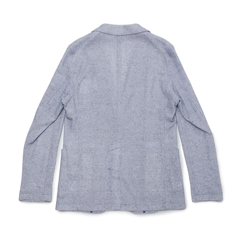 • 見返しあり(前身頃)、背・袖裏地なし、筒袖ステッチあり、センターベント、パッチポケット2つ、内ポケット2つ