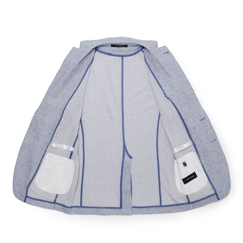 形状保持と立体感、そし着心地を良くするためにジャケットのキモとも言える襟と(前身頃の)見返し以外は一枚仕立て。裏地と胸ポケットを省き、筒袖が採用されています。袖丈が合えば、お直し無しで着られるお手軽な一着。極めて軽く柔らかな着心地が特徴です。
