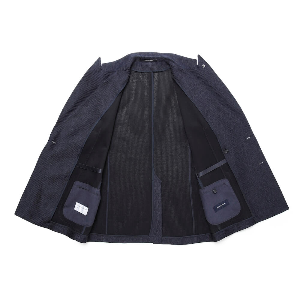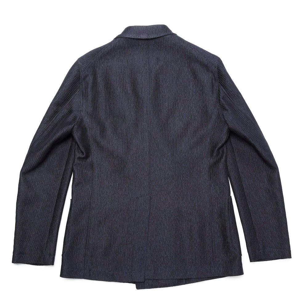 形状保持と立体感、そし着心地を良くするためにジャケットのキモとも言える襟と(前身頃の)見返し以外は一枚仕立て。裏地と胸ポケットを省き、筒袖が採用されています。袖丈が合えば、お直し無しで着られるお手軽な一着。極めて軽く柔らかな着心地が特徴です。