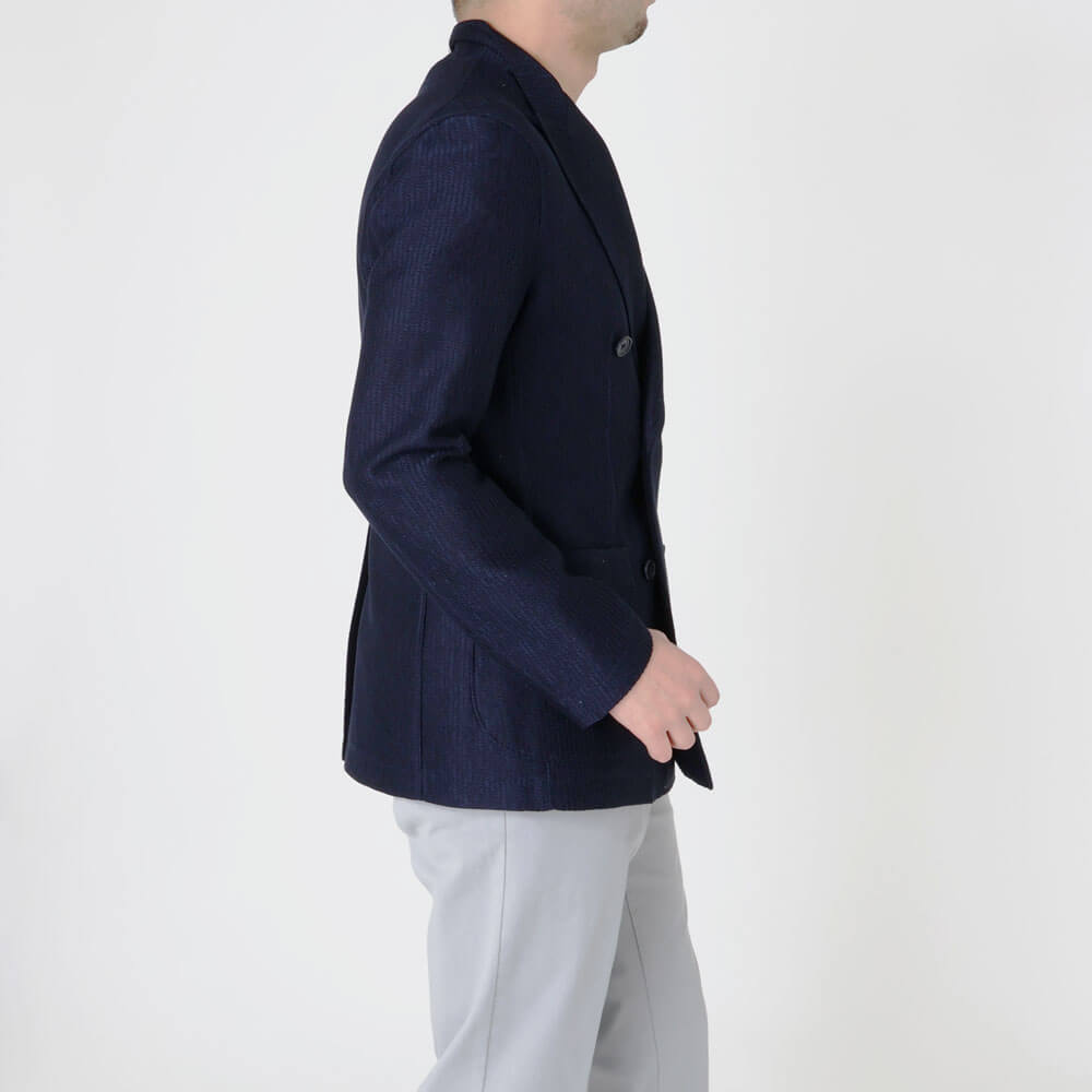 • 見返しあり(前身頃)、背・袖裏地なし、筒袖ステッチあり、センターベント、パッチポケット2つ、内ポケット2つ