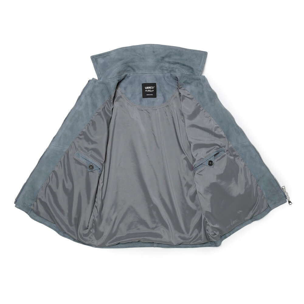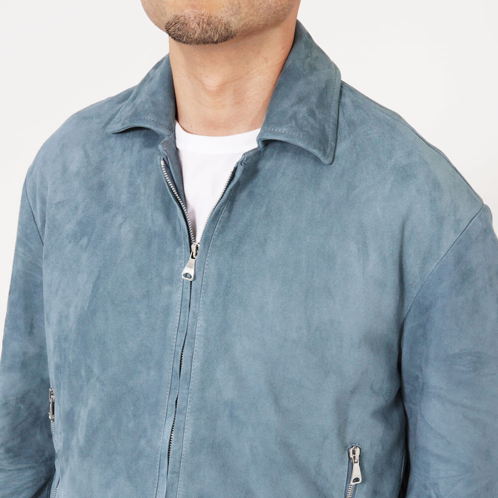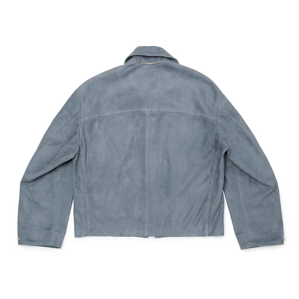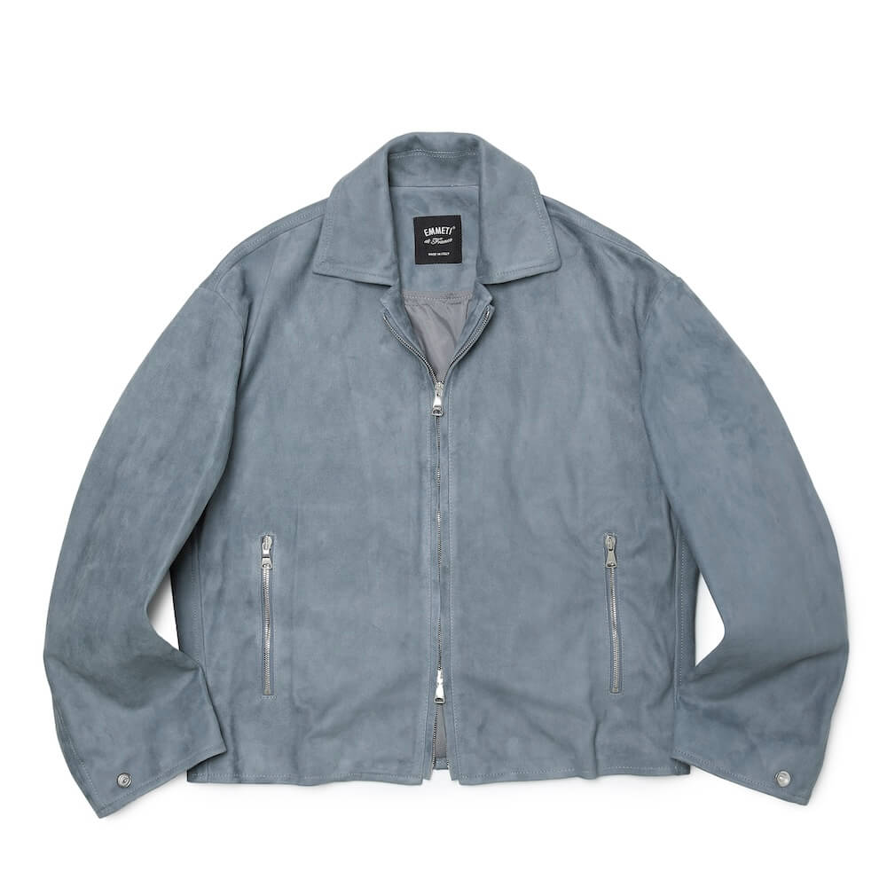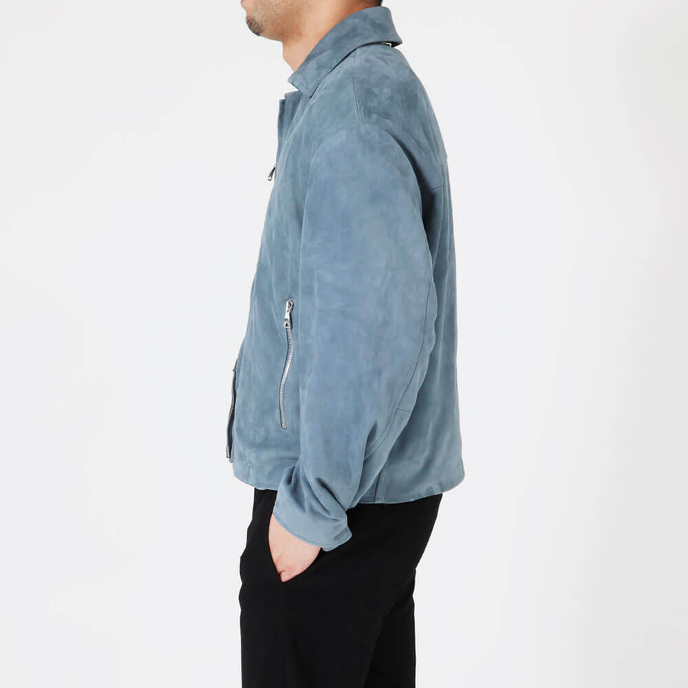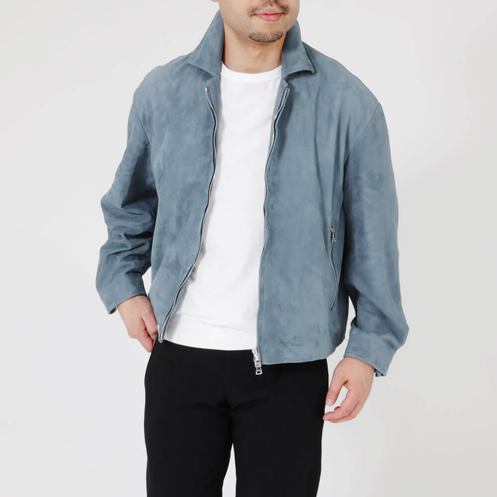肩がドロップした丸みのあるフォルムに、着丈はあえて短めに設定。袖口はスナップボタン仕様で、シルエットに強弱をつけられるデザインです。オーバーサイズではなく、程よいメリハリが効いたバランスで、大人の色気を感じさせるのがこのブルゾンの魅力。スウェードの質感も非常にソフトで、見た目から上質さが伝わります。カットソーやニットの上から44サイズを着用し、ちょうど良いサイズ感でした。