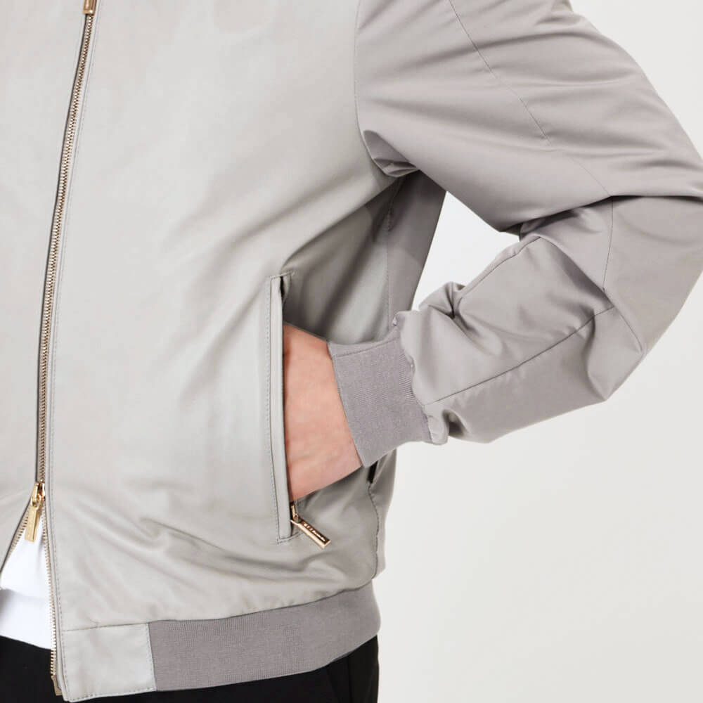 ・何よりも目を惹くのは、前身頃の全面に配されたナッパレザーの存在感。袖と背面の撥水性/形状記憶を備えたポリエステルとカラートーンを合わせることで悪目立ちせずスマートに映ります。