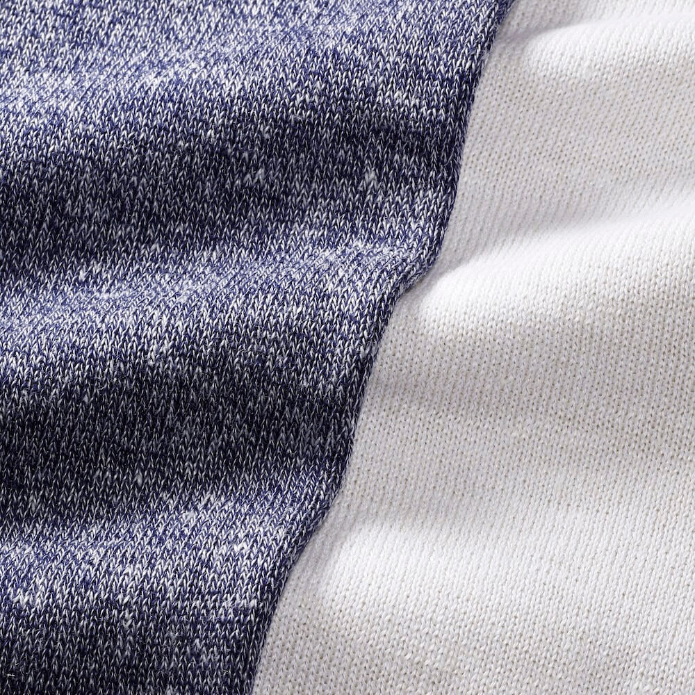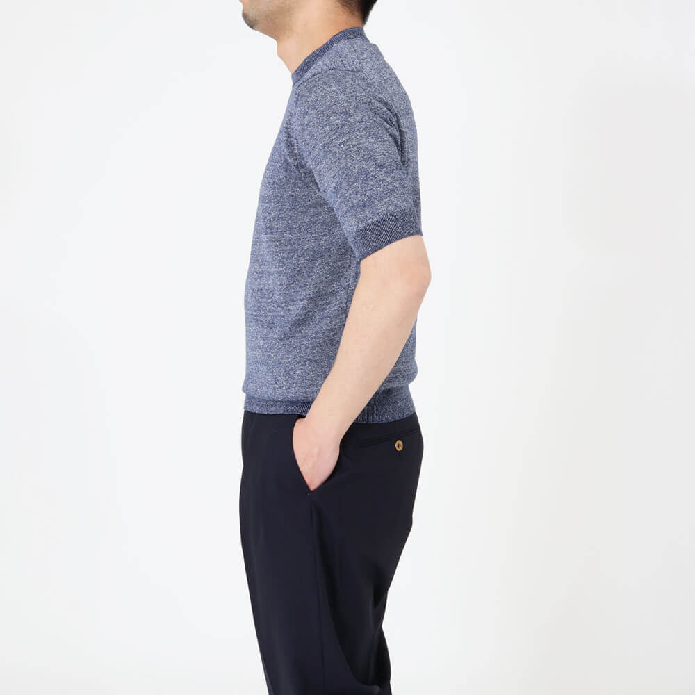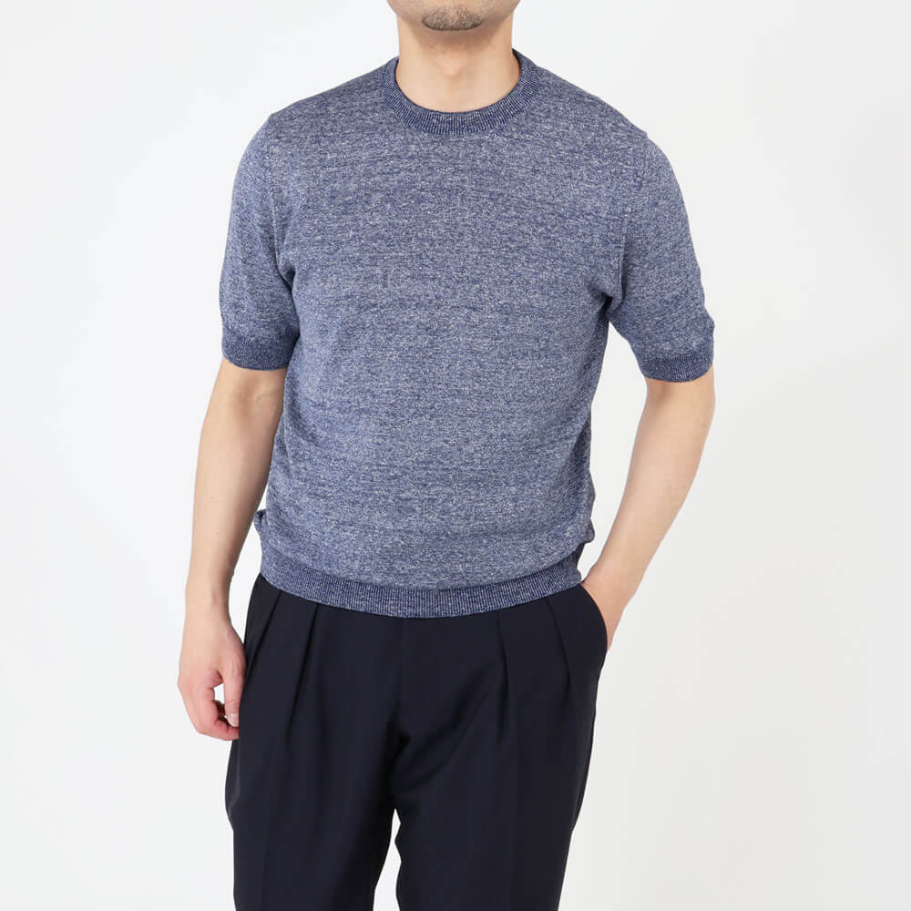 ・表はリネンの清涼感が際立つメランジ調、裏は肌当たりが良いように滑らかに編み立てられており、ハイゲージながら薄過ぎない編み地です。