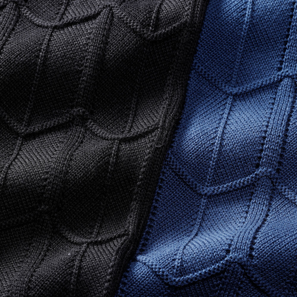 ・編み柄は前身頃のみに入れられており、同色のため目立ち過ぎない適度なアクセントに。部分的に透け感があり、軽さを演出します。