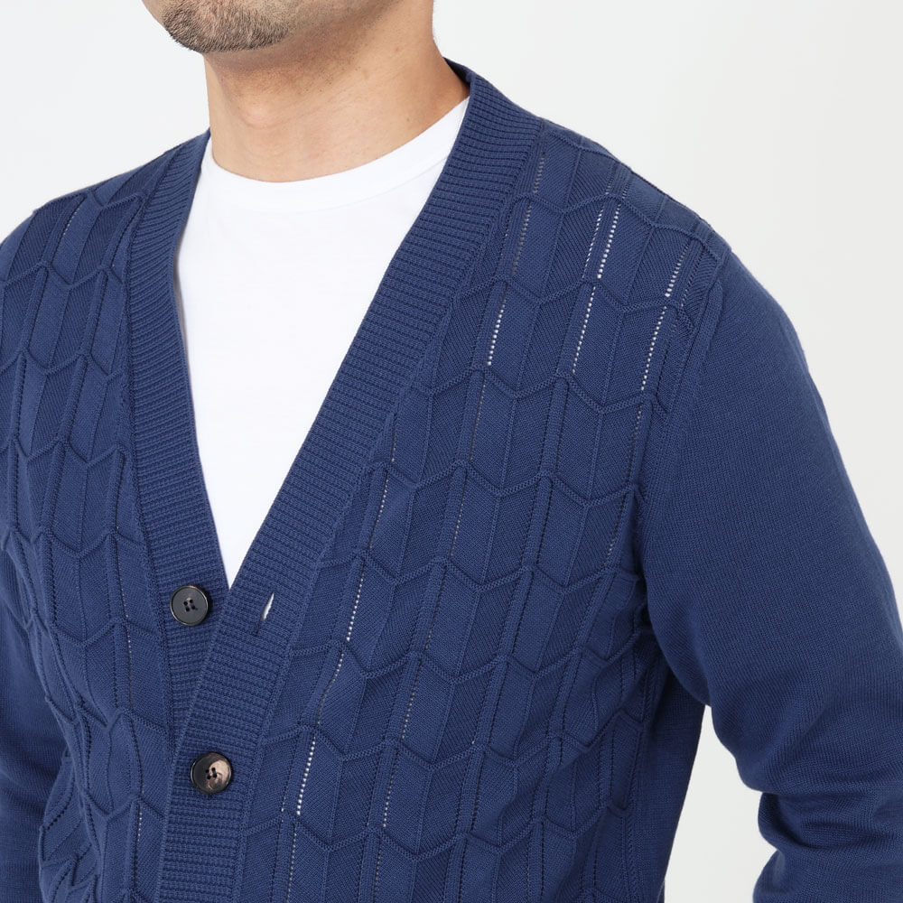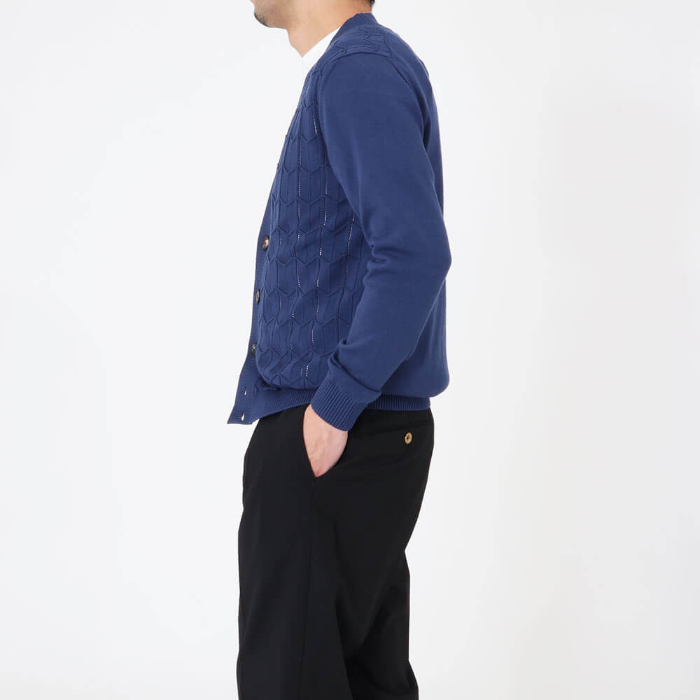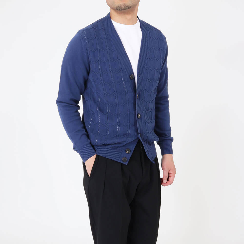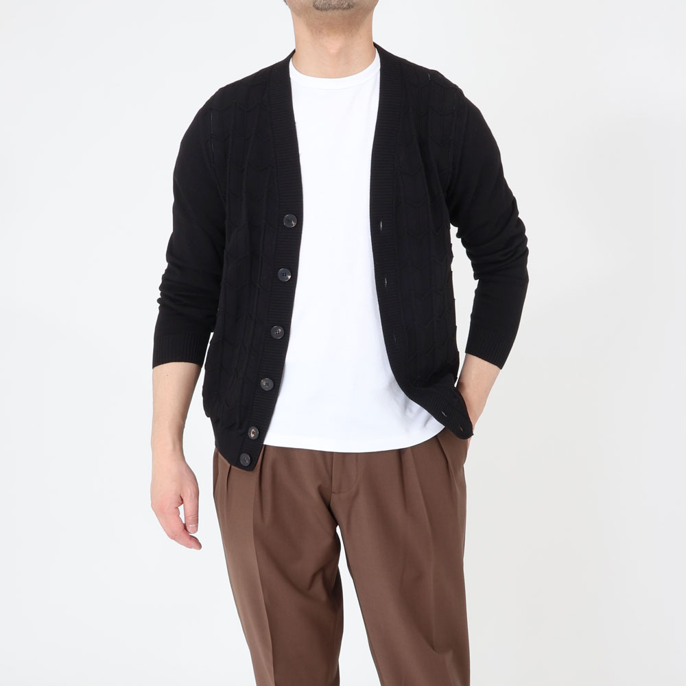 ・フロントの編み柄が目を惹く「LORENZONI(ロレンツォーニ)」のニットカーディガンは、柔らかさはあるものの、少しシャリっとした手触りのEXTRA FINE COTTONを使用。ドライな肌触りゆえ夏の冷房対策にもピッタリです。