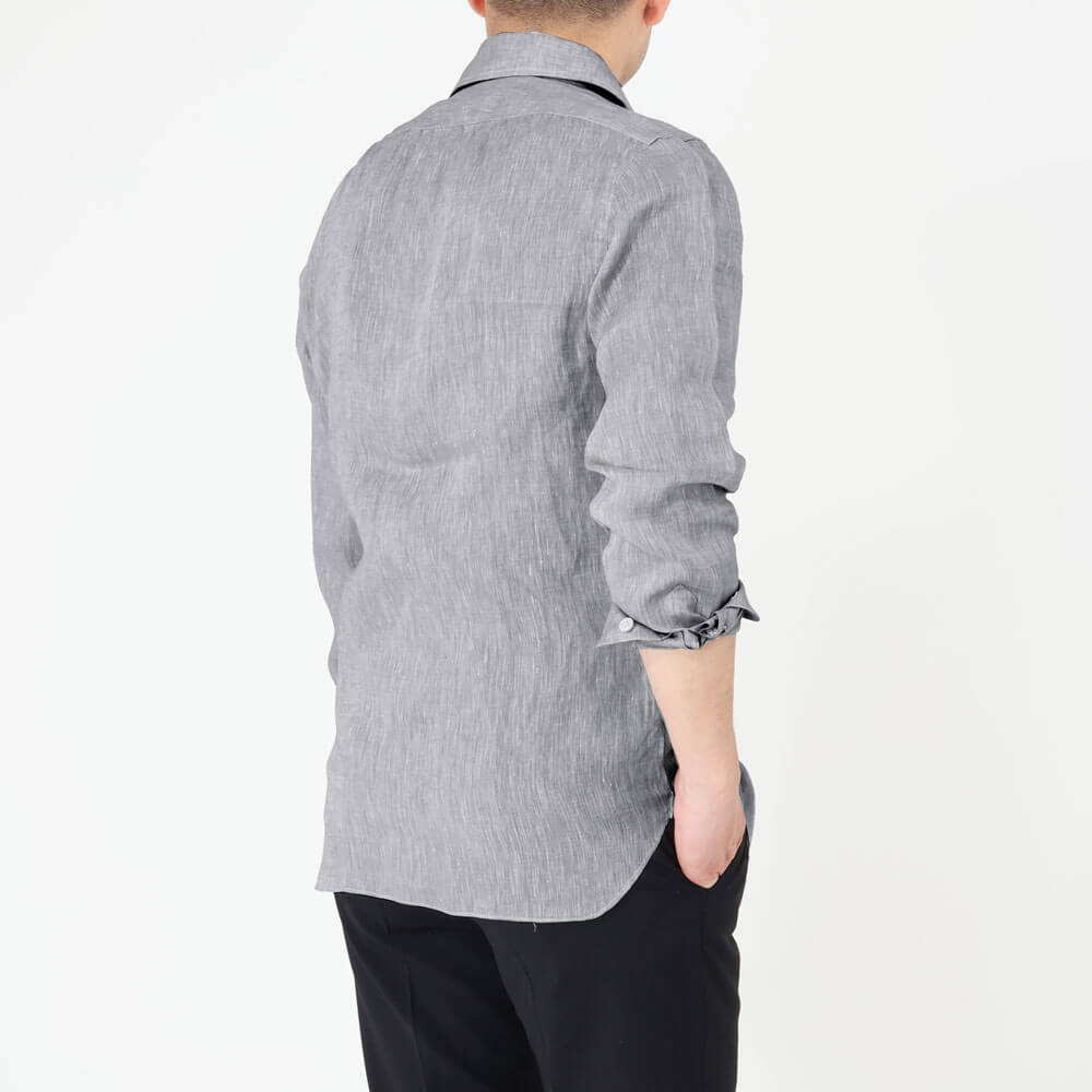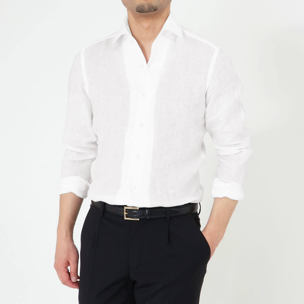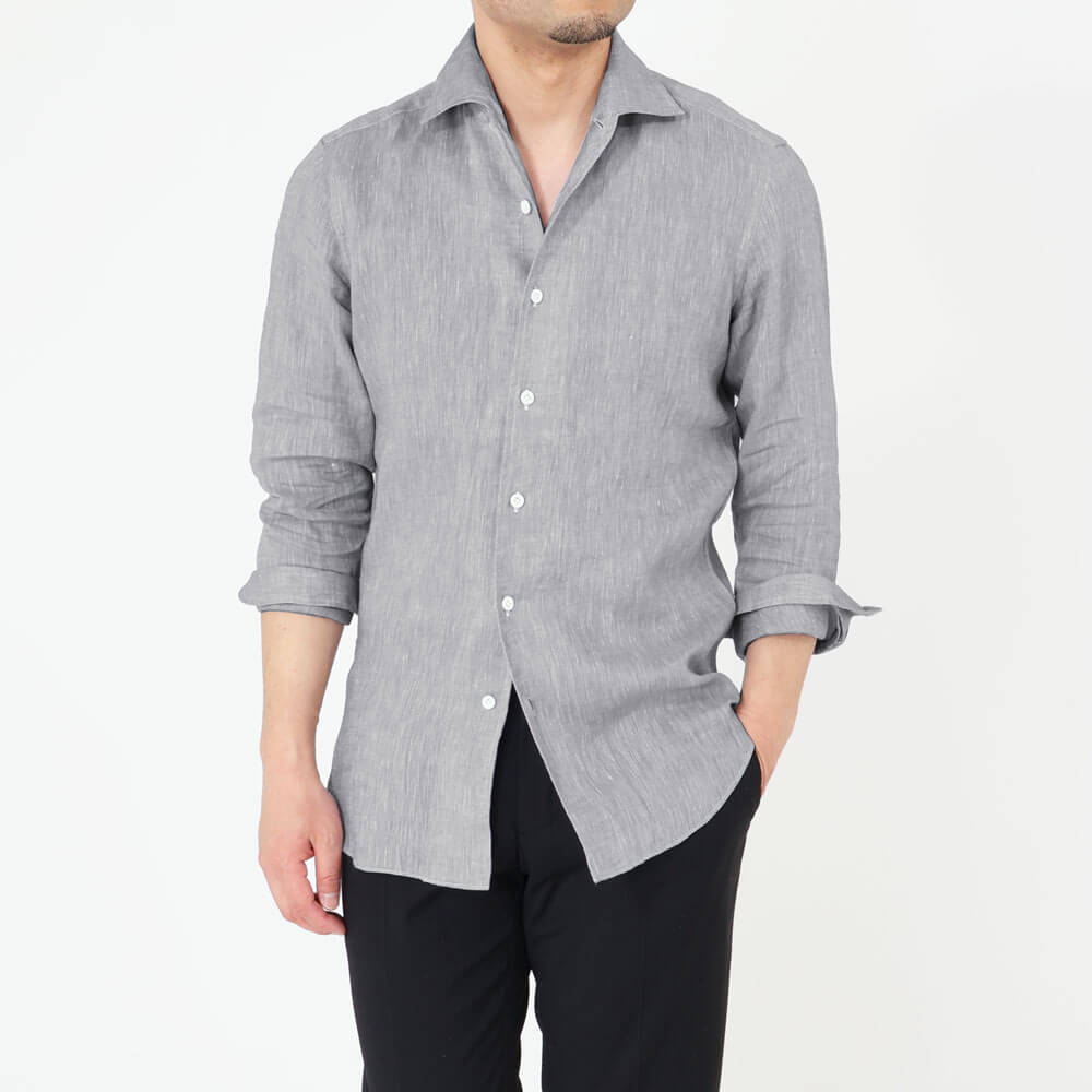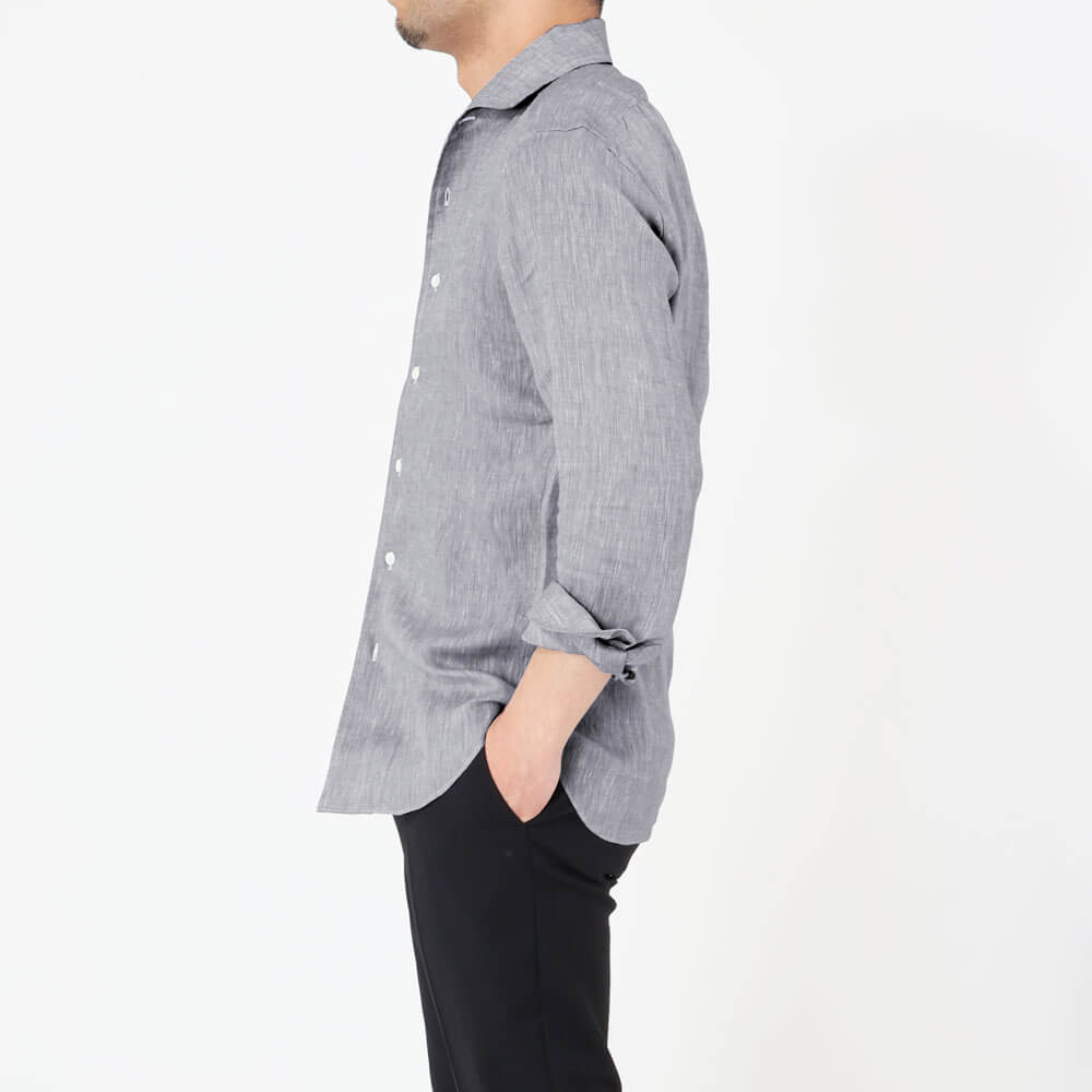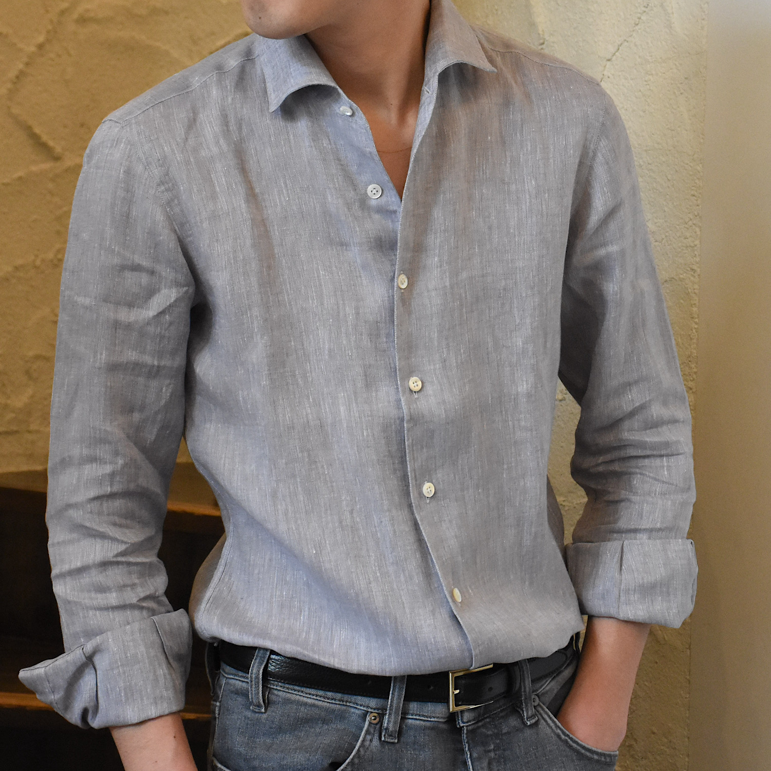・生地は春夏シーズン「Maria Santangelo(マリア・サンタンジェロ)」定番のリネン。ならではの清涼感あるドライなタッチは着込むほどに柔らかくなり、快適さが増します。生地の色によって白と黒の蝶貝ボタンを使い分けている点はB.R.SHOPのこだわり。