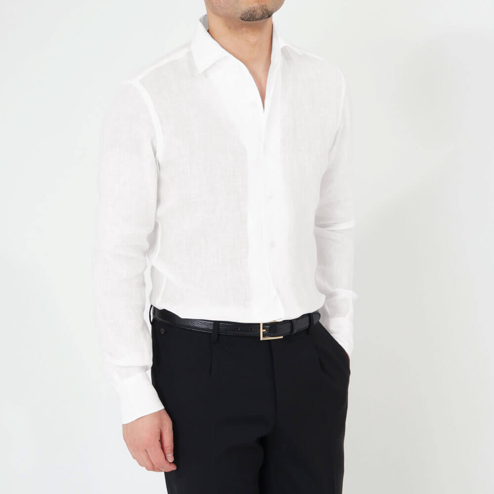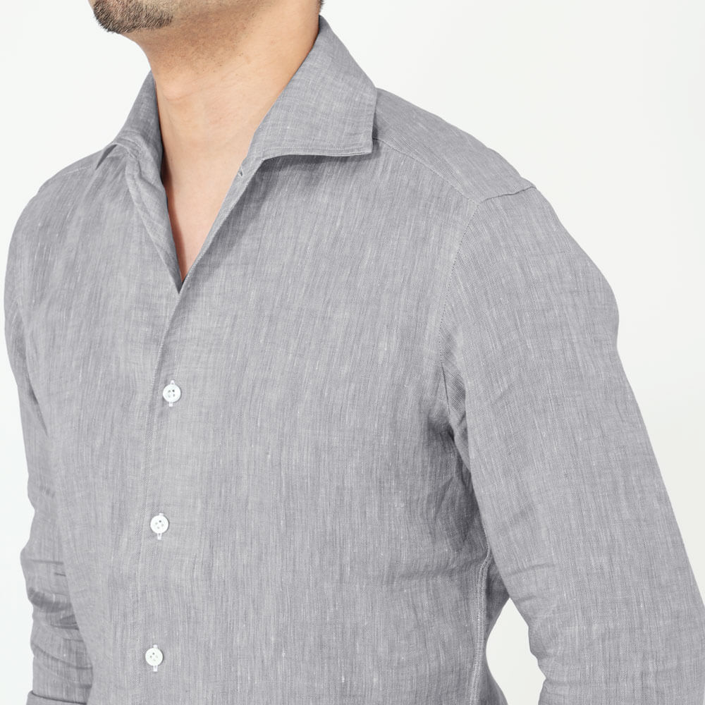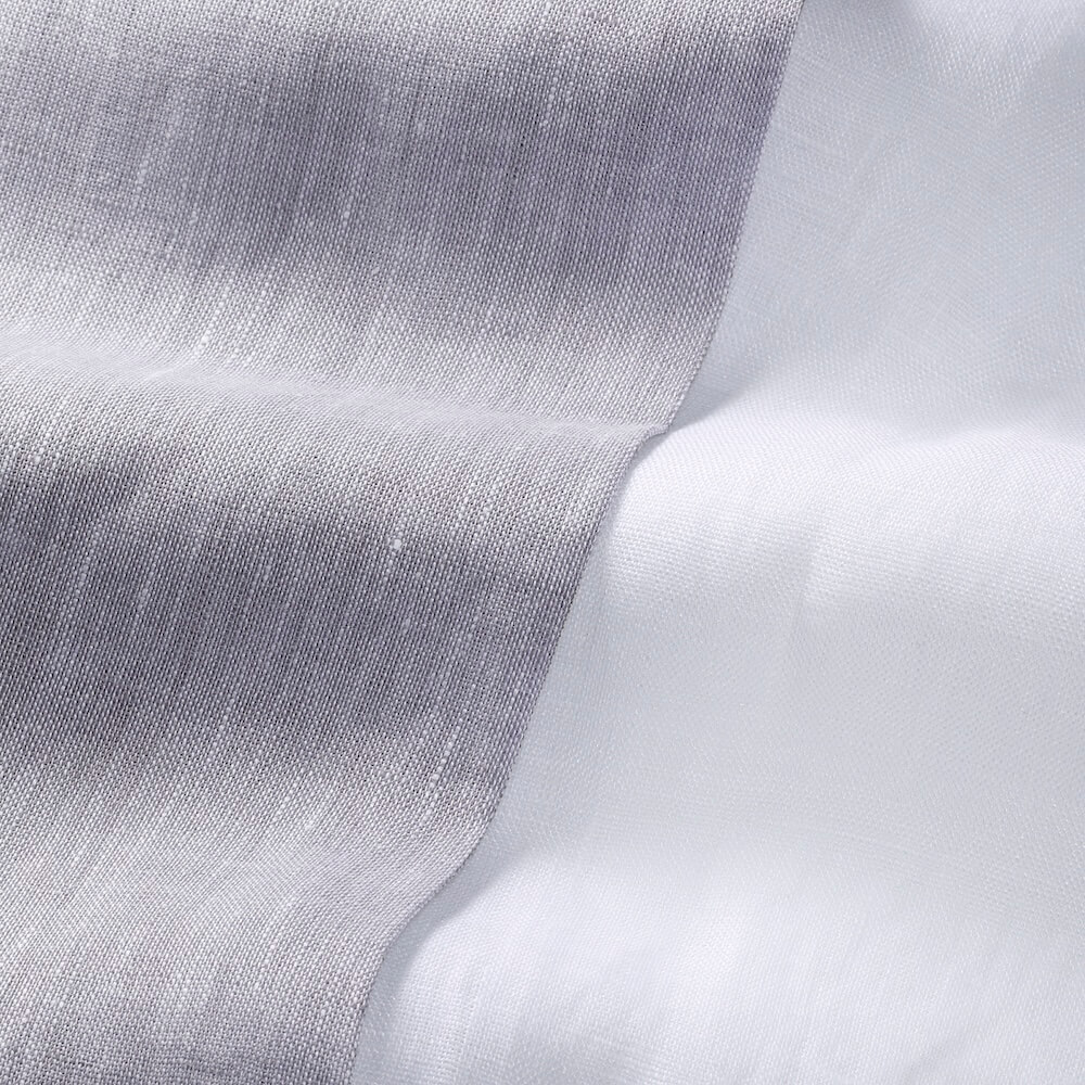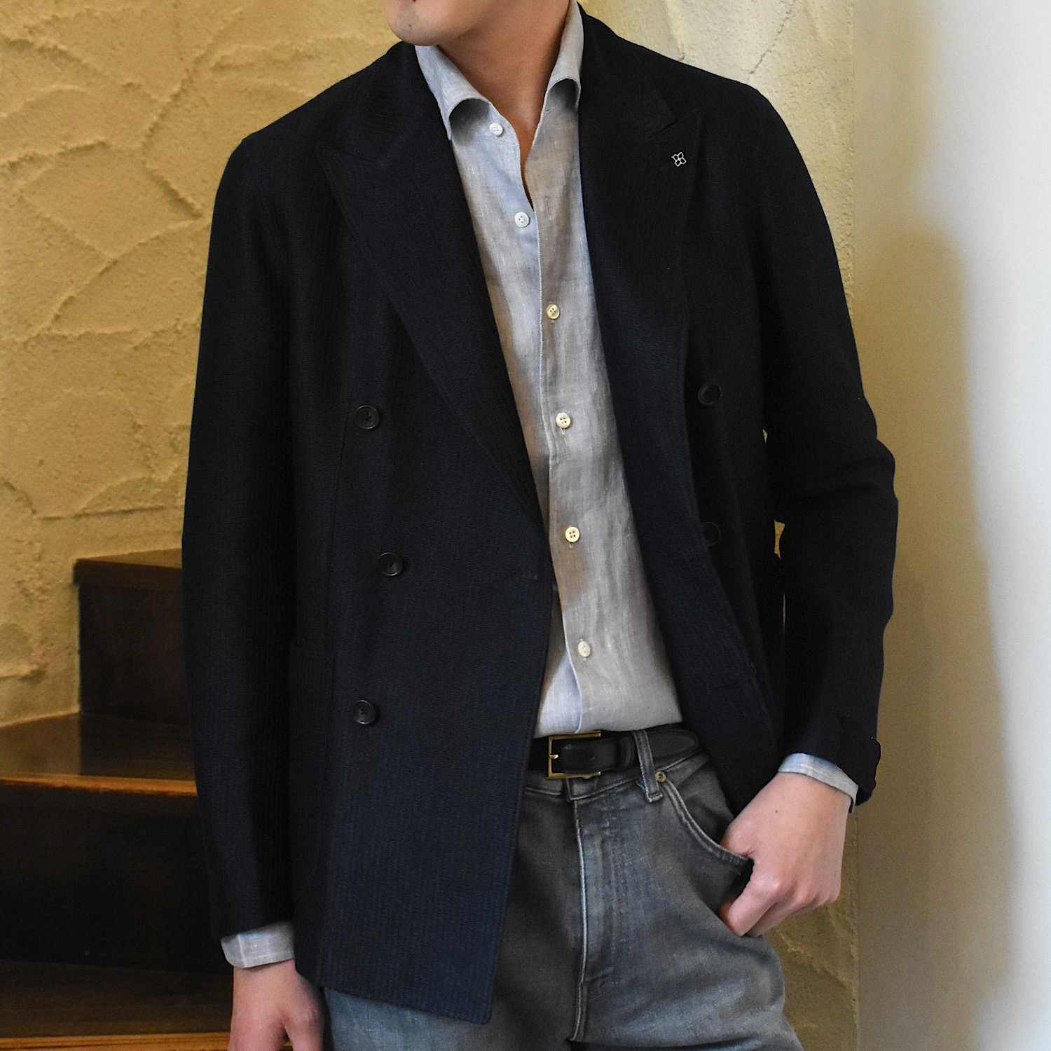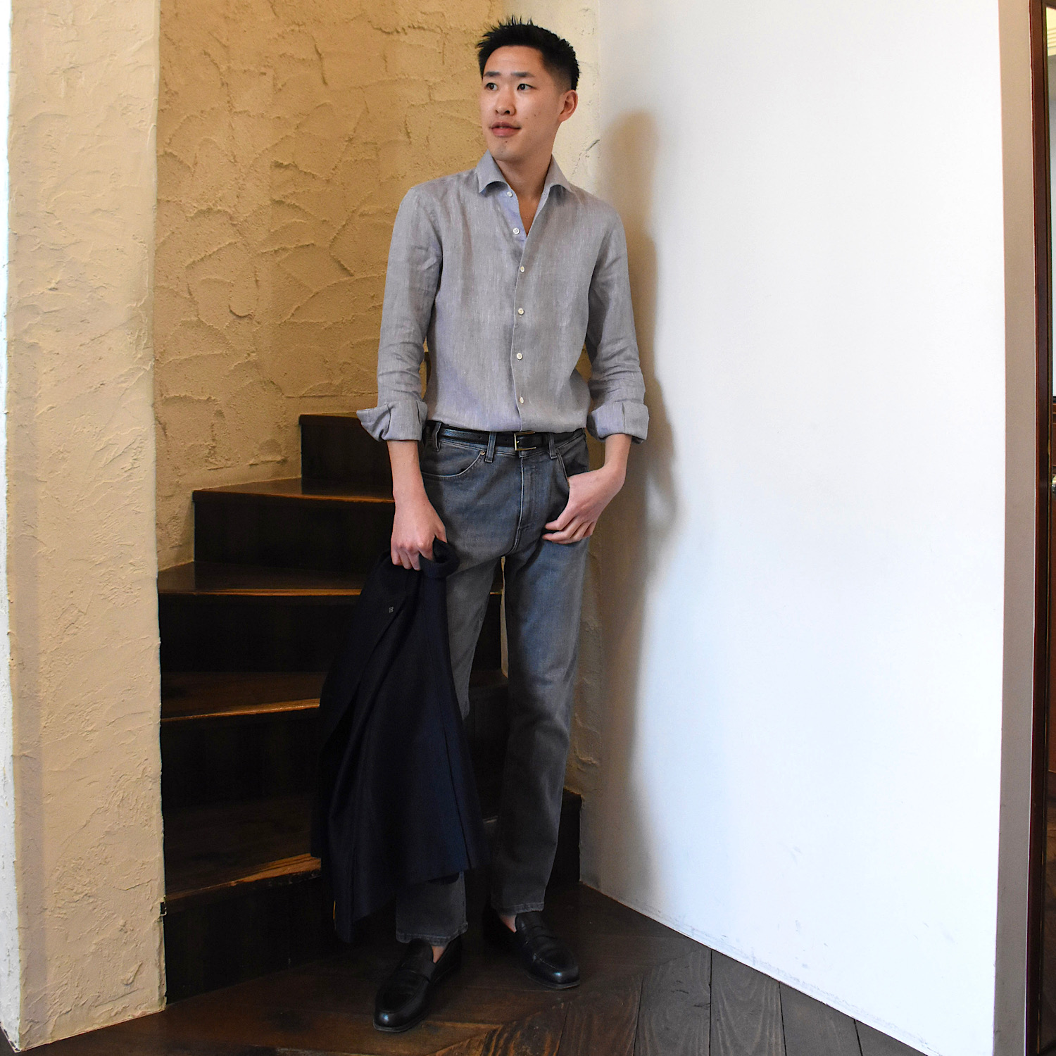 ・生地は春夏シーズン「Maria Santangelo(マリア・サンタンジェロ)」定番のリネン。ならではの清涼感あるドライなタッチは着込むほどに柔らかくなり、快適さが増します。生地の色によって白と黒の蝶貝ボタンを使い分けている点はB.R.SHOPのこだわり。