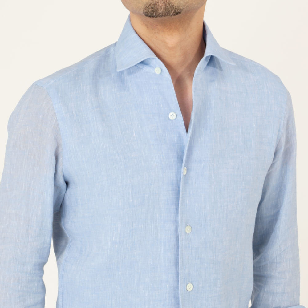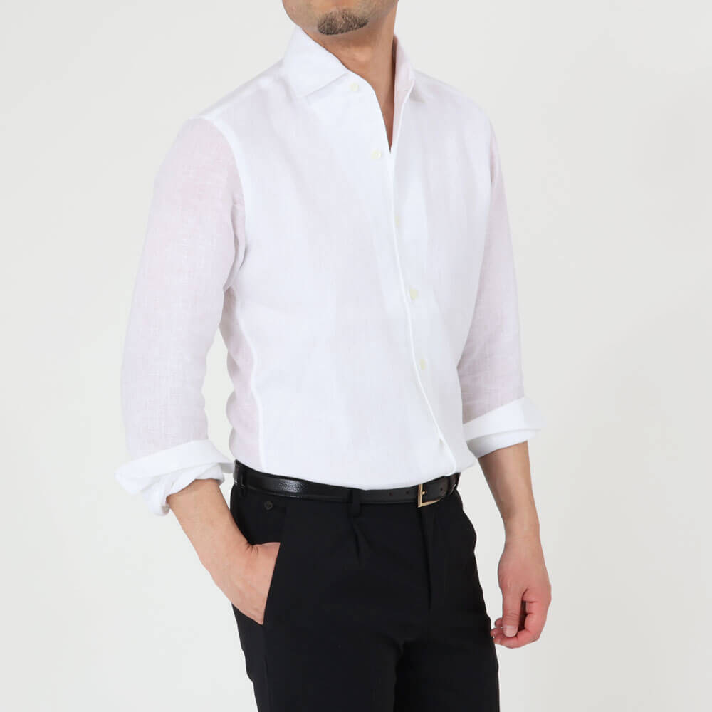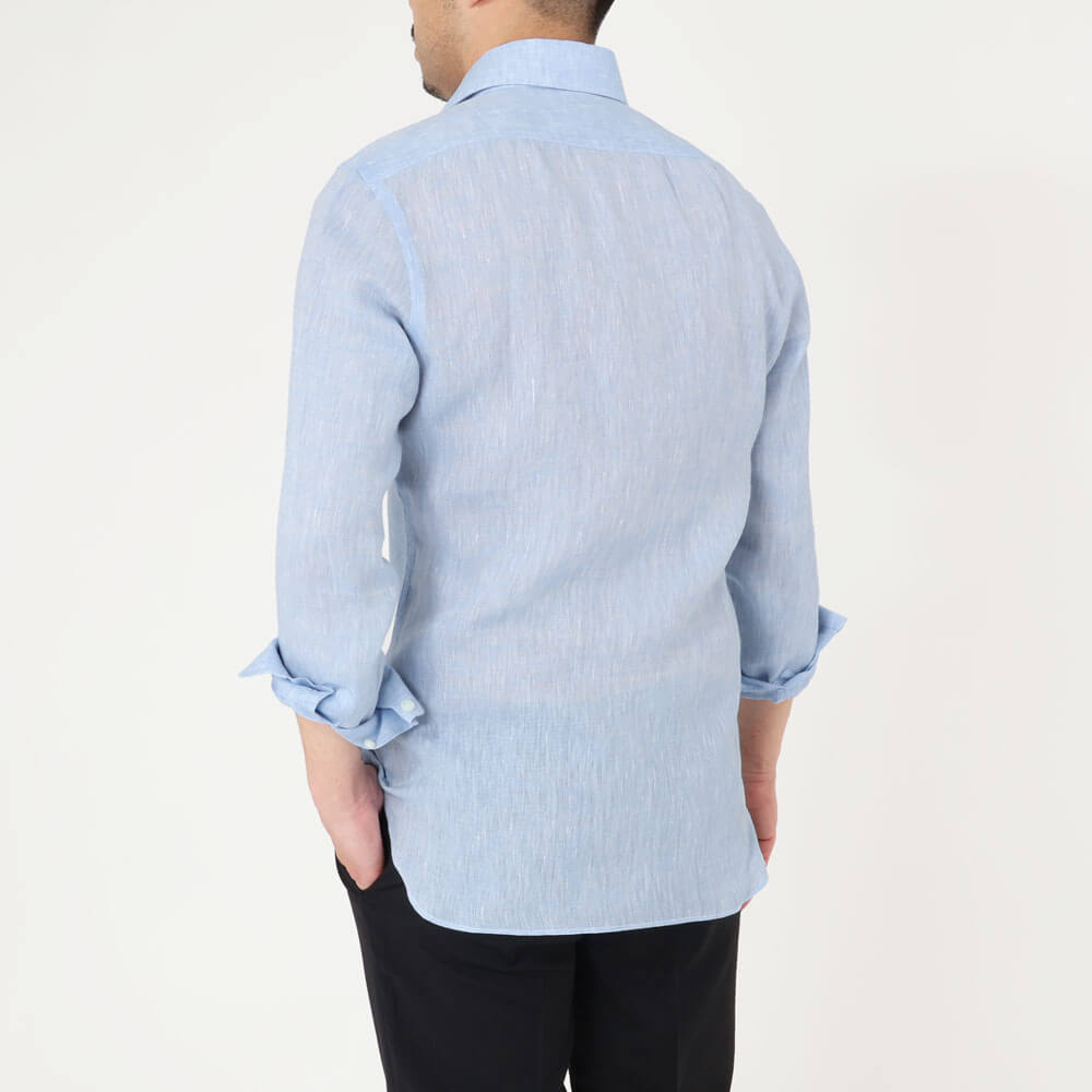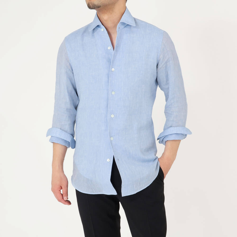 ・襟型"MARCELLO(マルチェッロ)"は、イタリアの名優マルチェッロ・マストロヤンニに由来する名前を持つワンピースカラーです。襟を一枚で作るためフロントボタンの裏側部分に見返しを付ける必要があり、生地を多く使う贅沢な作りが特徴。そしてボタンを開けて着た際に胸元からの曲線が美しく繋がり実にエレガント。タイドアップもできる襟型ですが、B.R.SHOPではキレイめなカジュアルシャツの位置付けとしています。