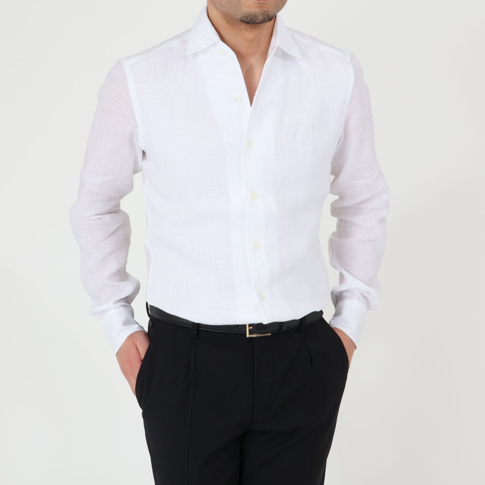 ・オーダーやフォーマルシャツにある仕様を取り入れたこちらは、前身頃のほぼ全面が二重という贅沢仕立て。ゆえに裾をタックアウトしても二重になっていることが気になりません。