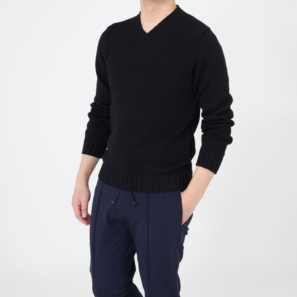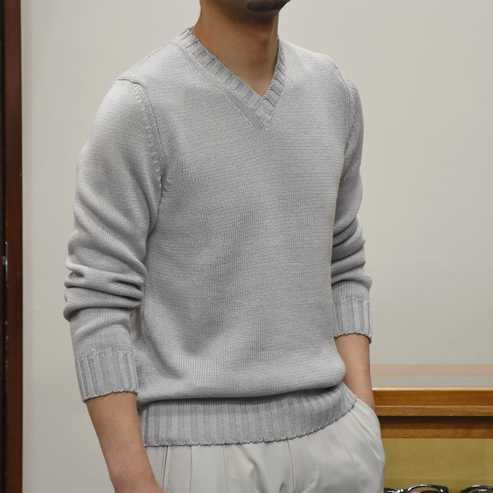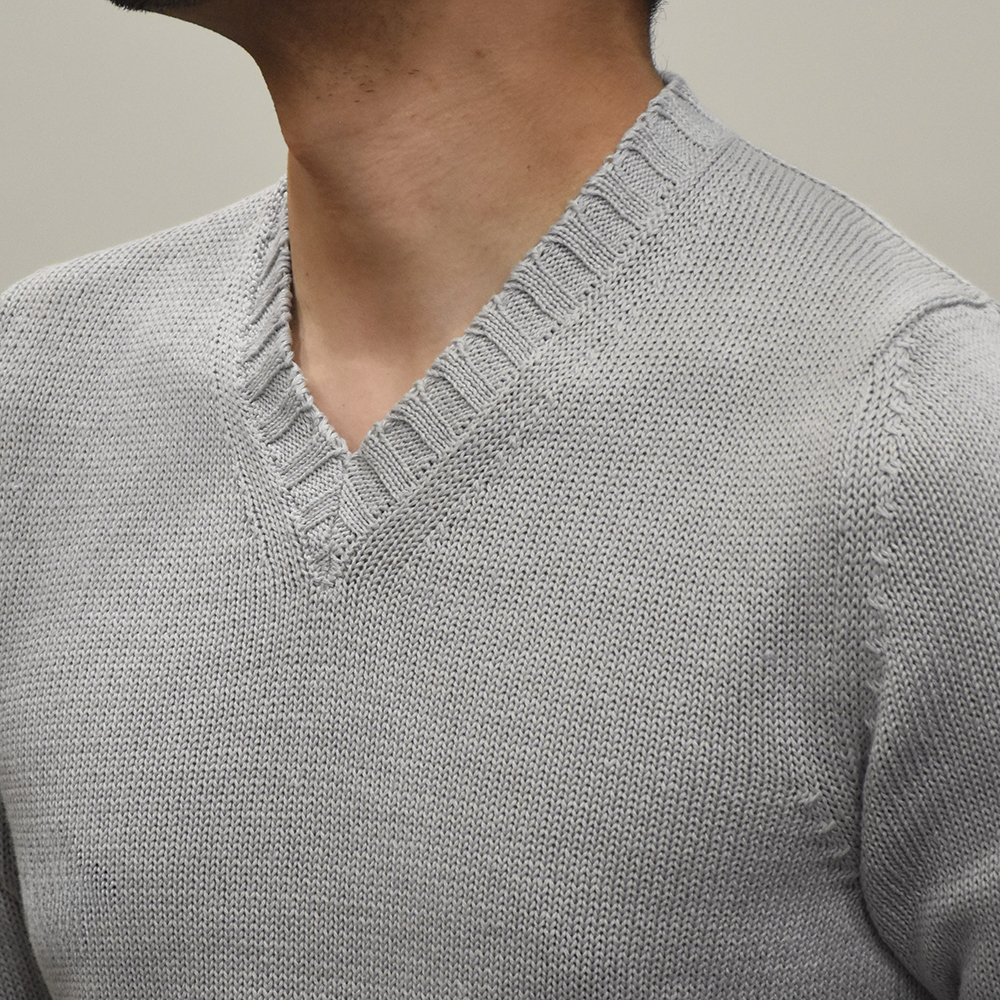・新登場となるVネック自体も別注です。やや浅めでシャープなネックラインをリクエスト。リブはミドルゲージに相応しい幅に設定されており、スタンダードなデザインが特徴。