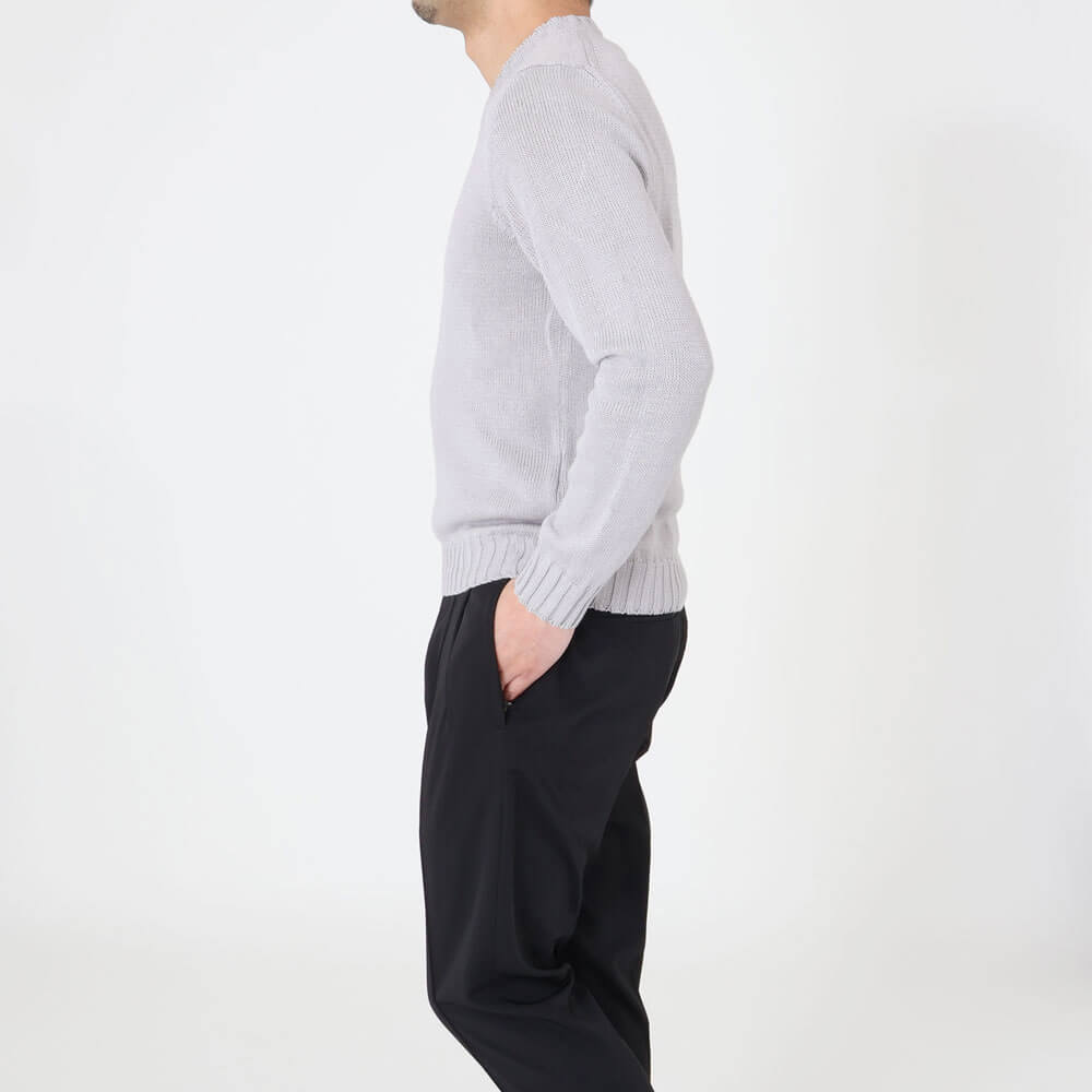 ・素材はリネン&コットンで5本の糸を撚り合わせ編まれたミドルゲージ。リネン特有のザラっと感が少ない柔らかみあるタッチゆえ、素肌に着られるほど快適な着心地です。
