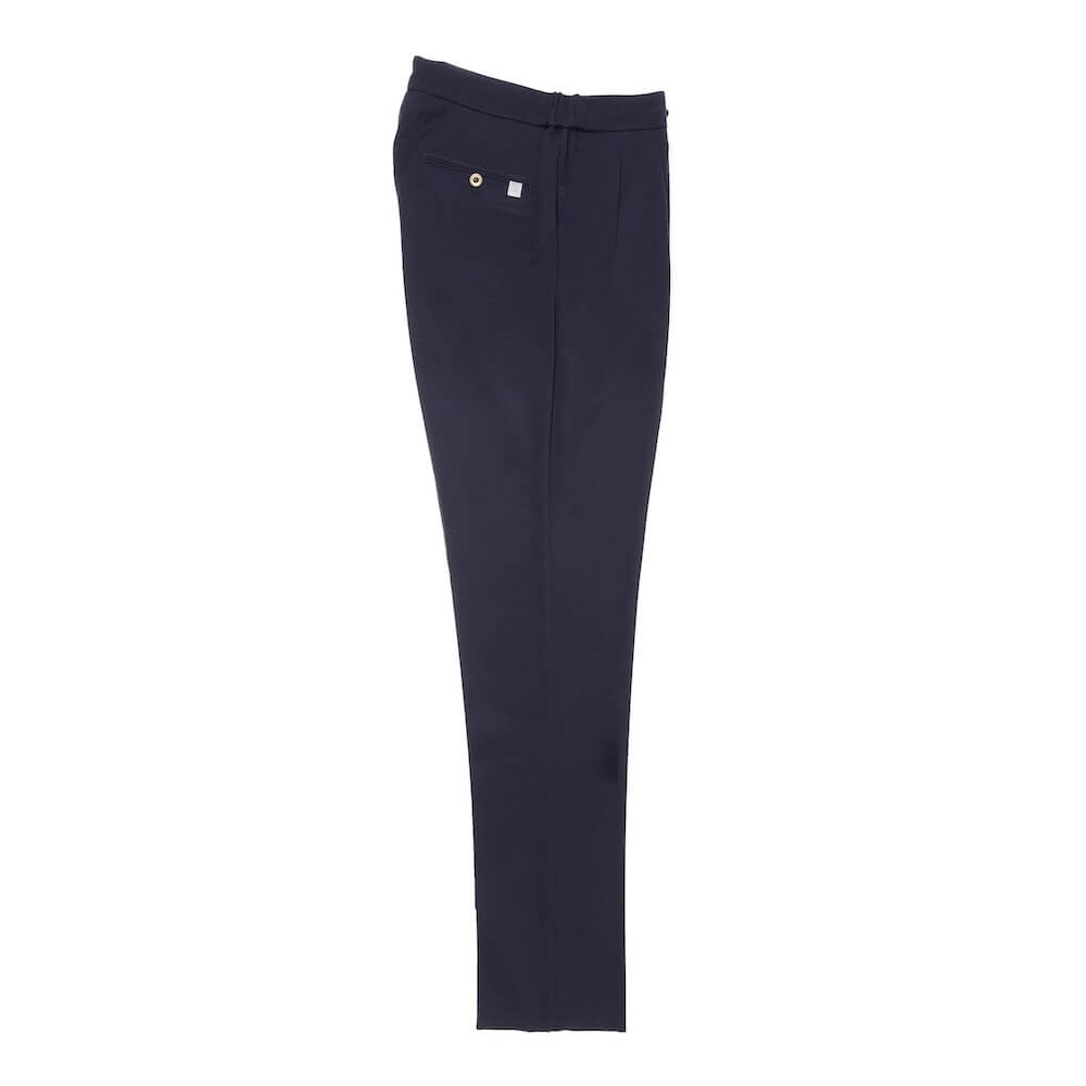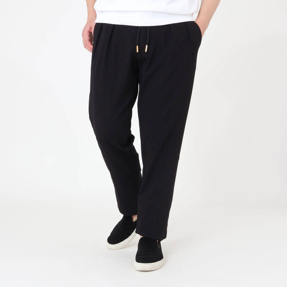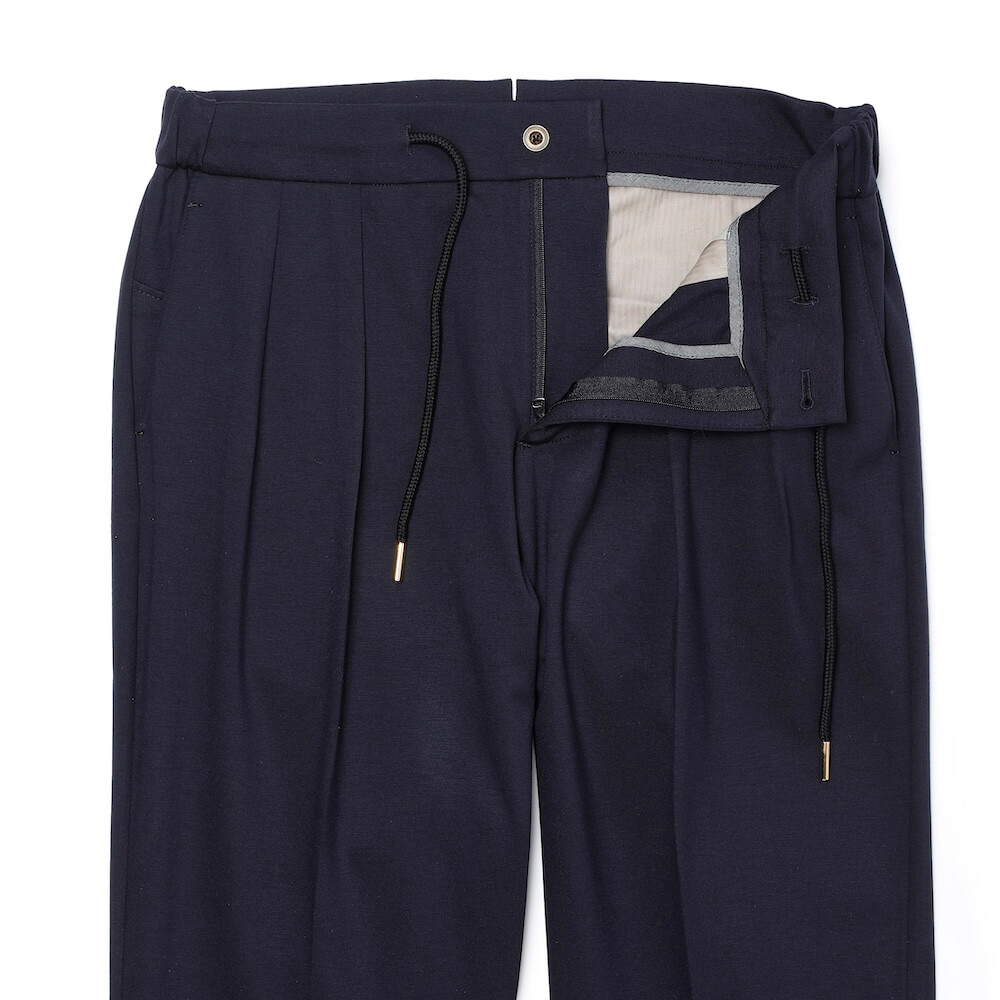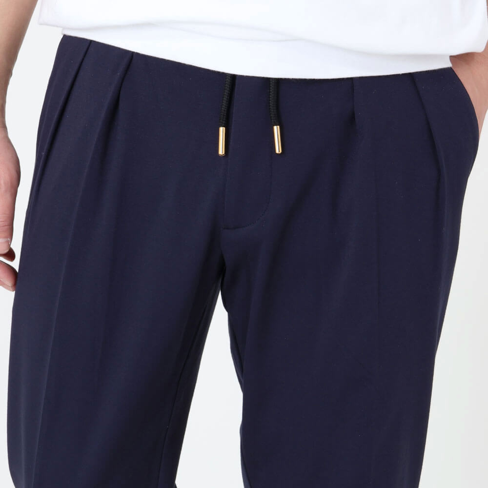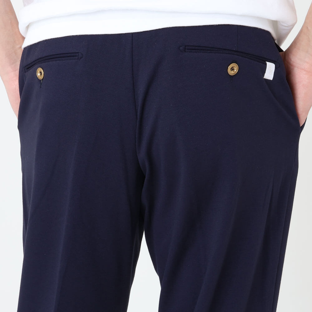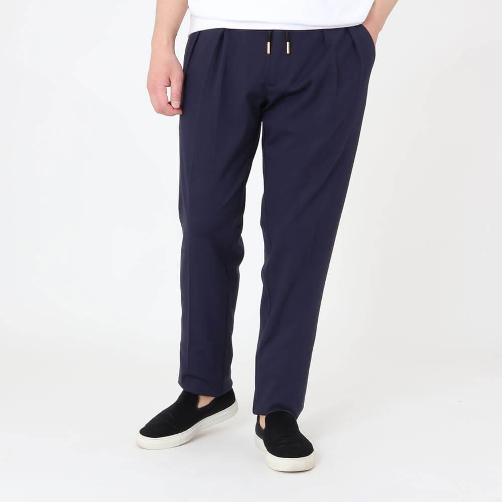 “とにかくラク”とリピーター続出のジャージー素材。抜群の伸縮性で、長時間の移動やデスクワークでもストレスゼロ。見た目はキレイめなのに、穿き心地はスウェット級というギャップが人気の理由です。こちらのパンツは42サイズを着用しウエストがしっかりとホールドされるサイズ感。 44サイズはウエストにゆとりがあり快適ですが、もも周りにややゆとりが出るため、私の場合は42サイズを選びます。