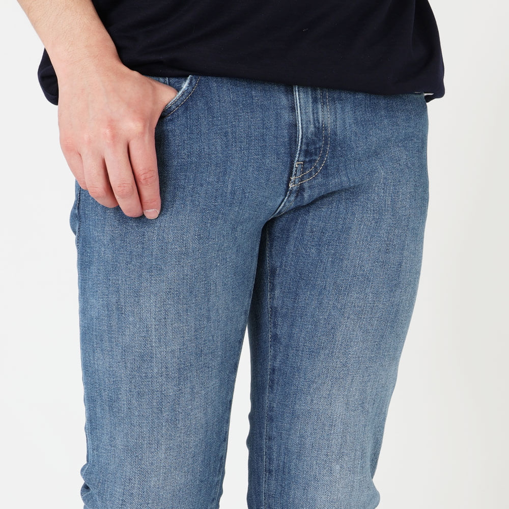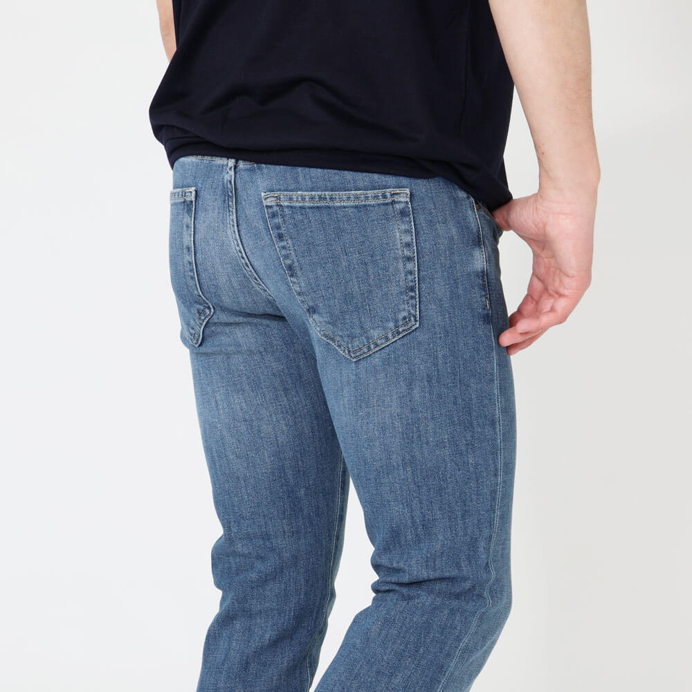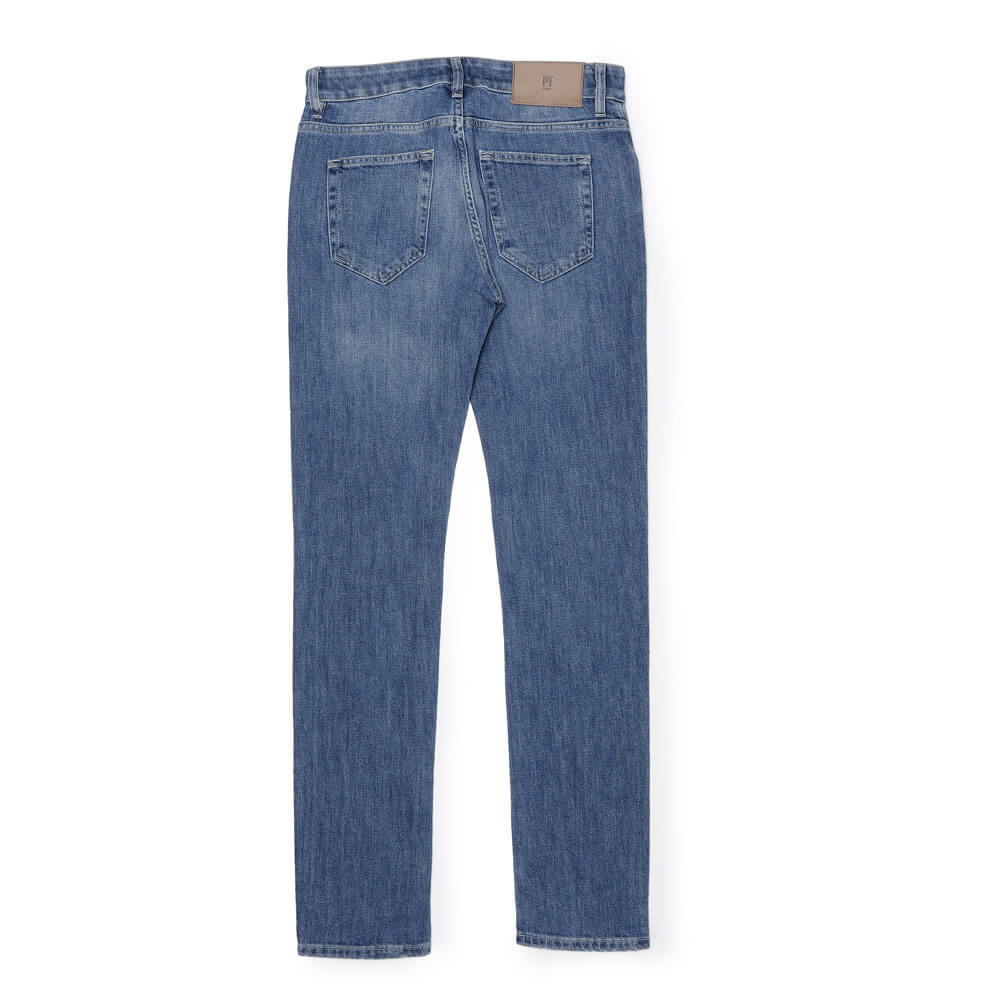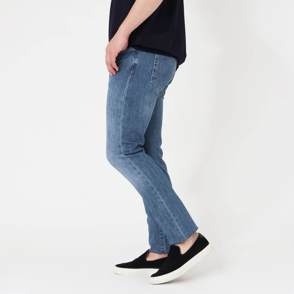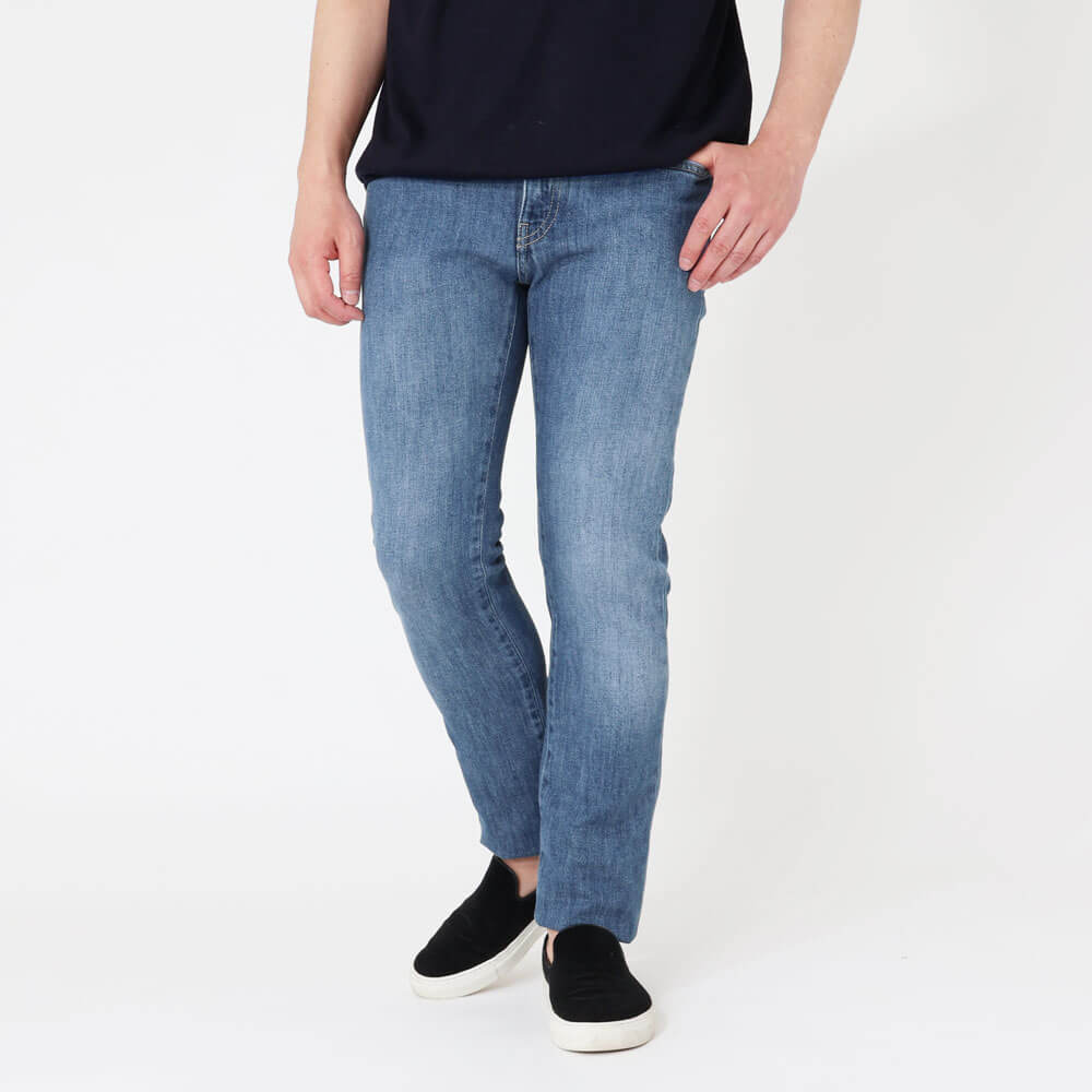 ・適度に加工が施されたブルーデニム生地は、ストレッチが効いており柔らか。淡すぎないブルーの色合いは年間を通して穿いて頂けます。