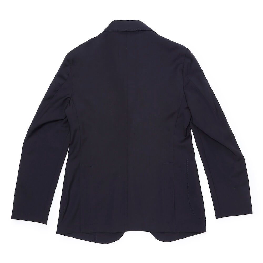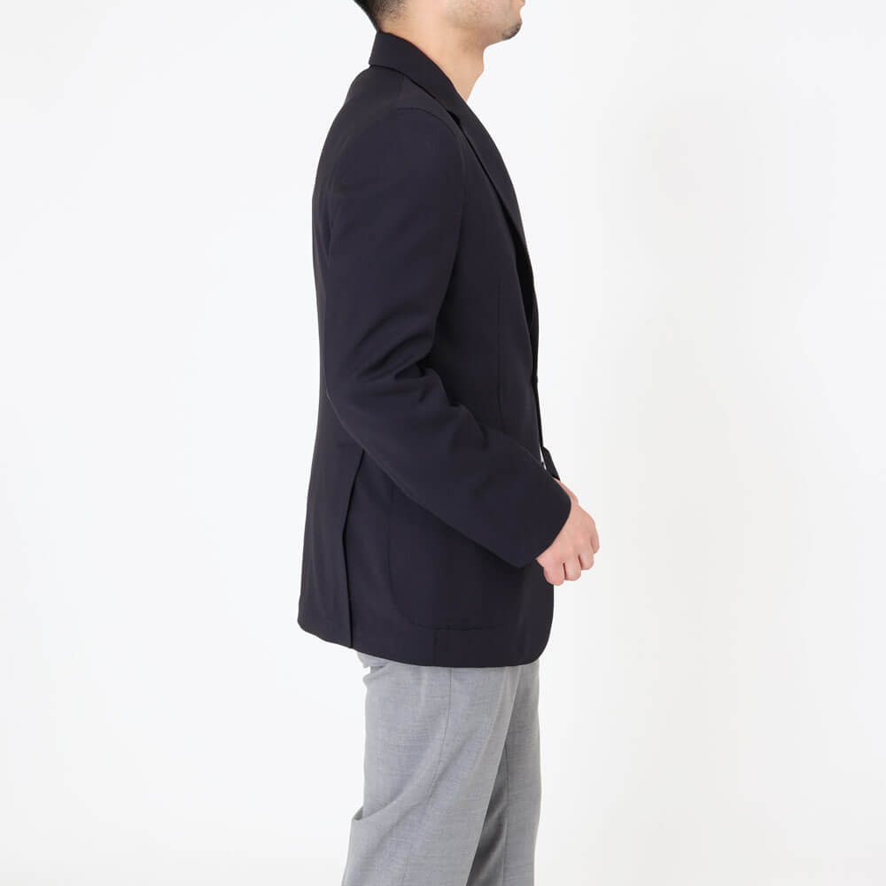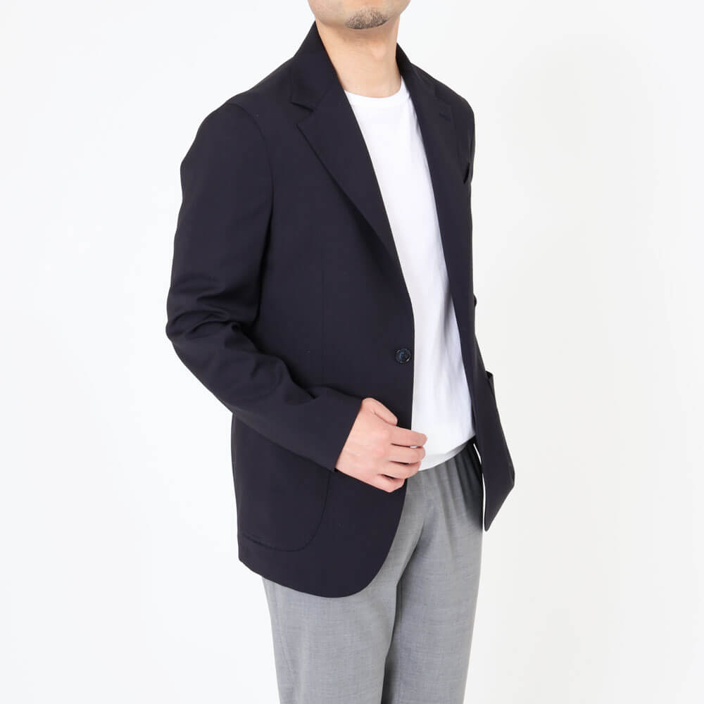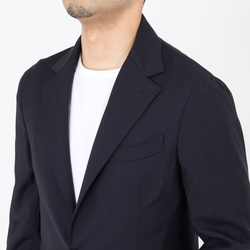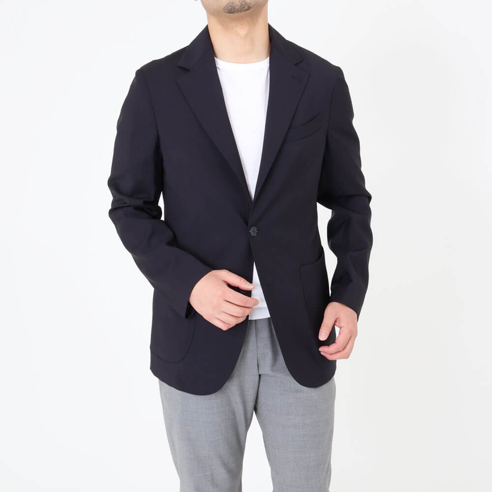 ・イタリアは"ZIGNONE(ジニョーネ)"社の高番手糸で織られたトロピカルウール生地を採用。微光沢が美しく、しなやかでドレープ感のある風合い、ナチュラルな伸縮性があることも特徴です。ダークネイビー/ブラックの2色をラインナップ。同生地のパンツもご用意しております。