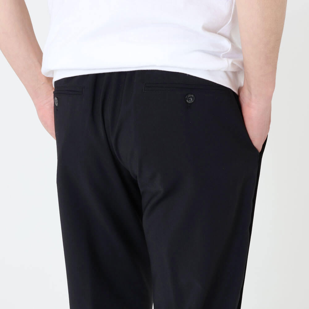 ・緩やかにテーパードするシルエットはリラックス感たっぷり。ゆとりがありながらもパイピング側賞により縦のラインが生まれ、脚長効果に繋がります。