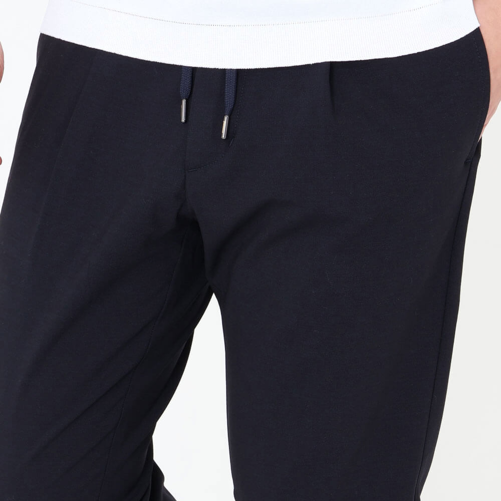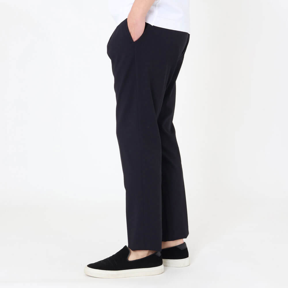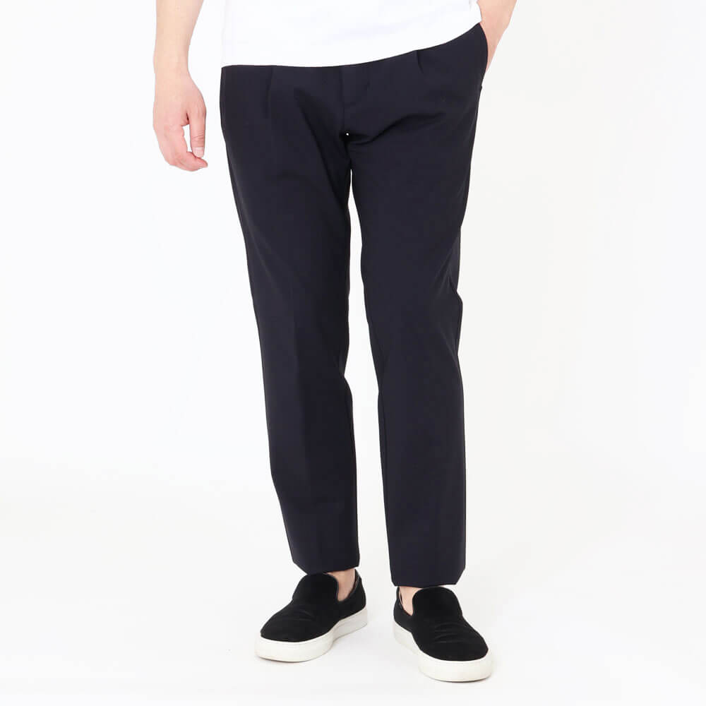 サイズXSを着用し、ちょうど良いサイズ感でした。サラッとした生地の質感が良く、深みのあるネイビーの色合いと艶が高級感を漂わせます。キックバックのある伸縮性もあって穿き心地は快適。日常使いはもちろん、ビジネスシーンにも対応できる一本です。