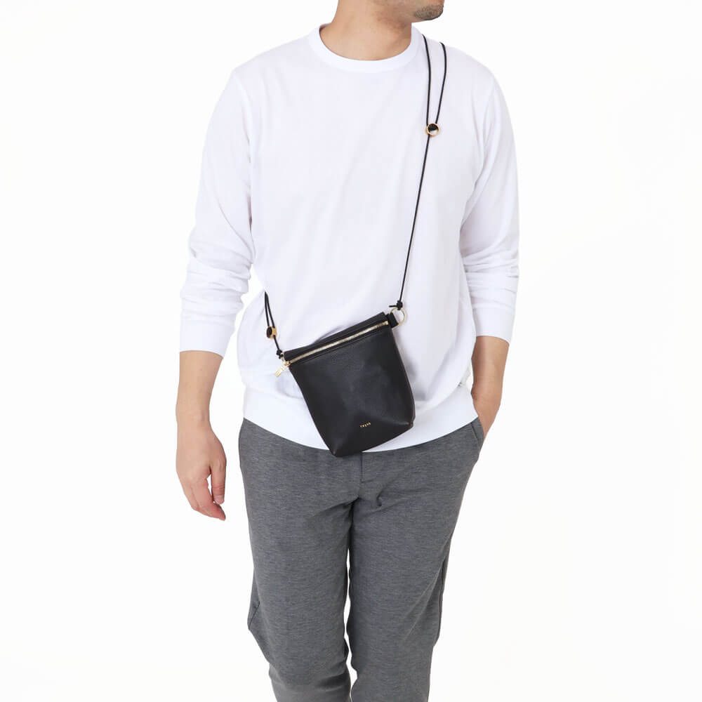 ・こちらは、スマホ / イヤホン / サイフ / カギ / メガネ / リップなど、必要な身の回り品だけを持ち運ぶための身体に寄り添うショルダーポーチです。