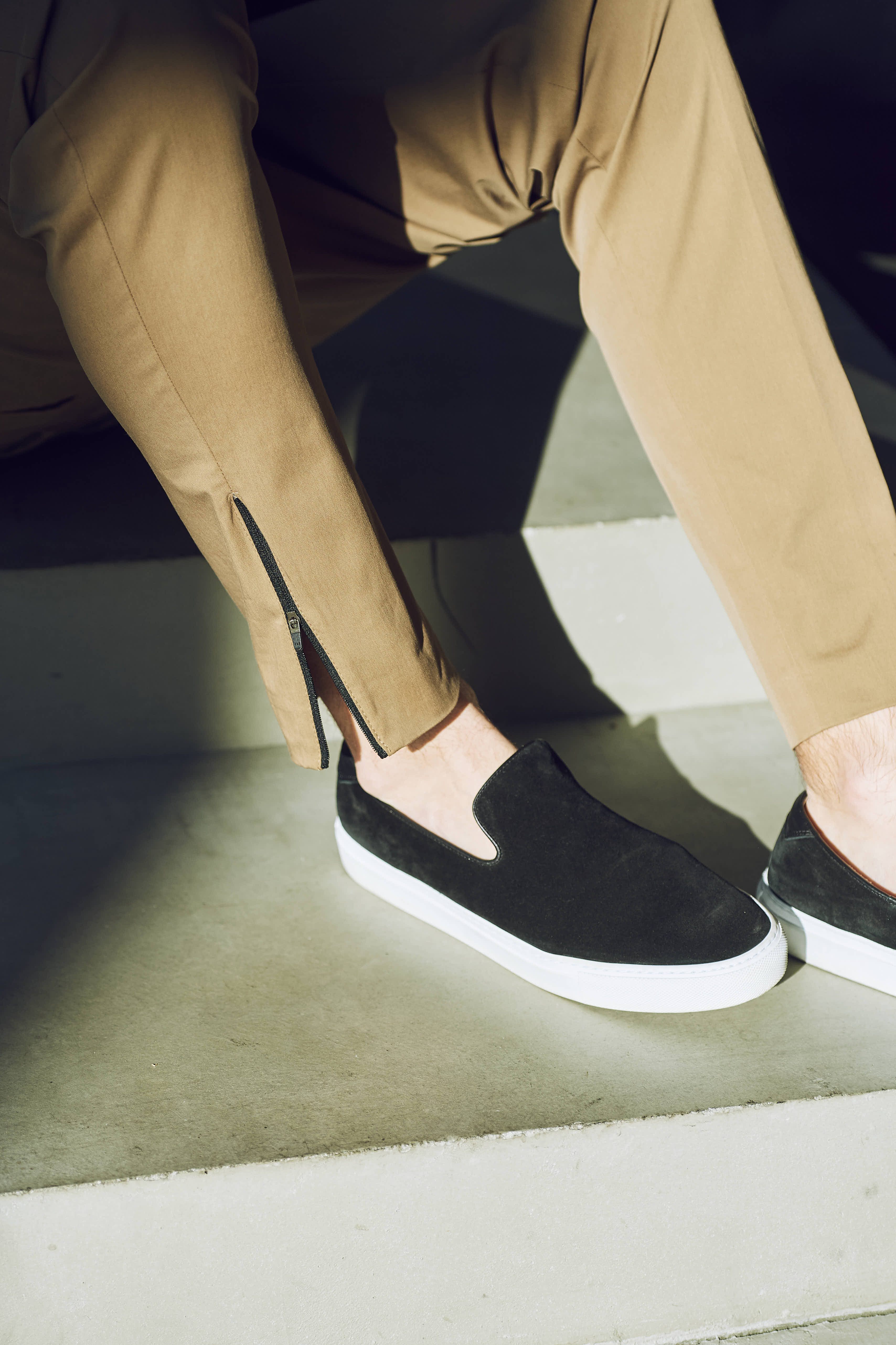 サラリとしたウール顔の生地でありながら、かなりストレッチが効いているので、履き心地が非常に楽チンです!車や自転車に乗る際、また長時間の移動などにはもってこいの一本に!そして、ポイントなのがスソのジップ。ジップを開く事で、ブーツやハイカットスニーカーの裾にモタつきがなく綺麗に合わせる事ができます!個人的にハイカットスニーカーを合わせて、スポーティなスタイルに仕上げたいなと思います!