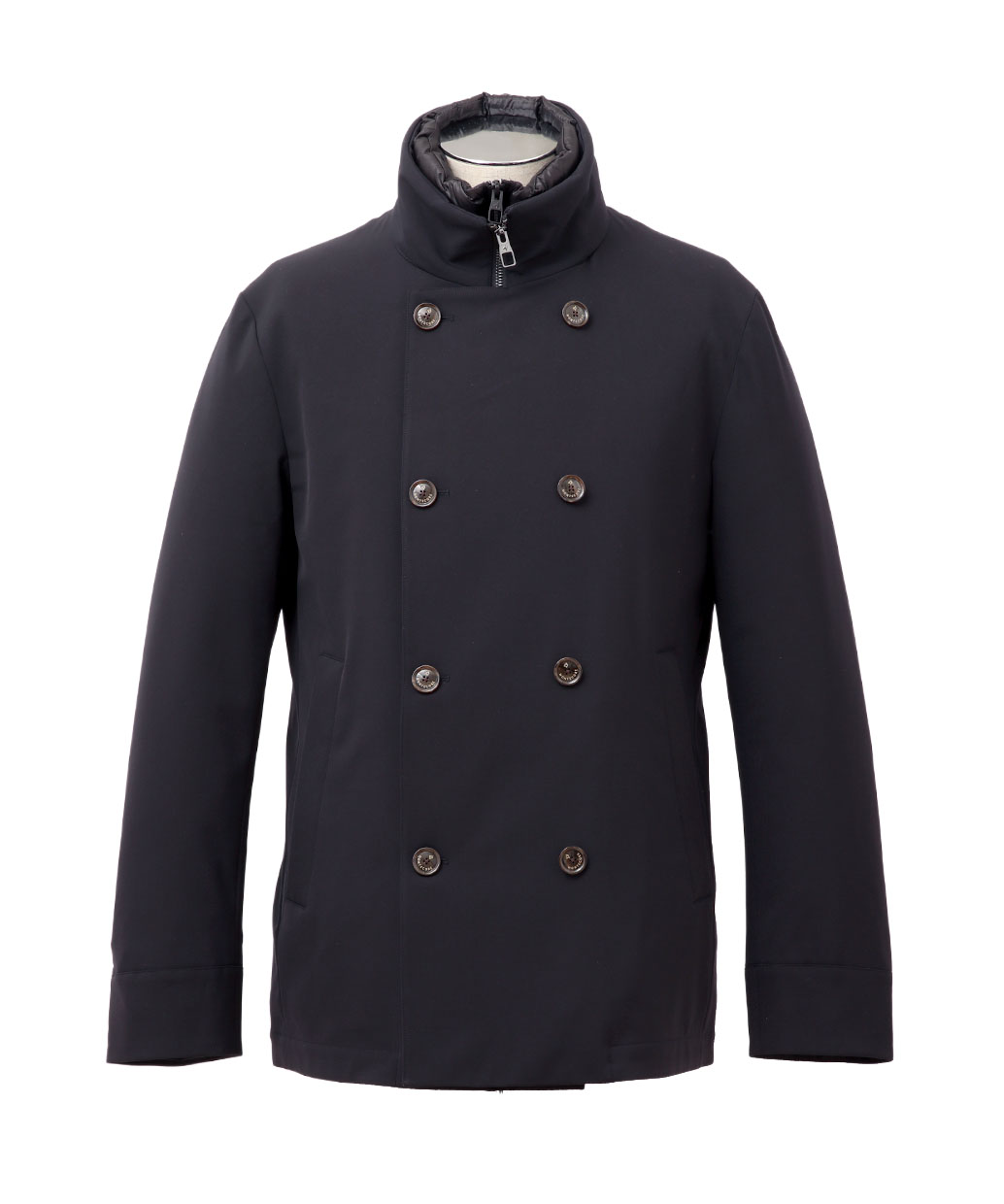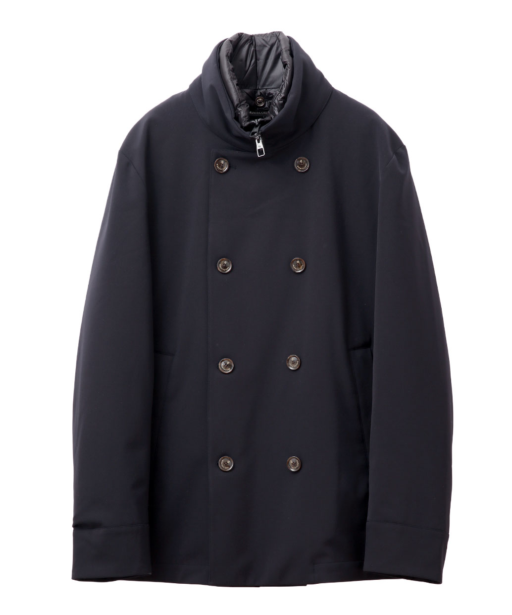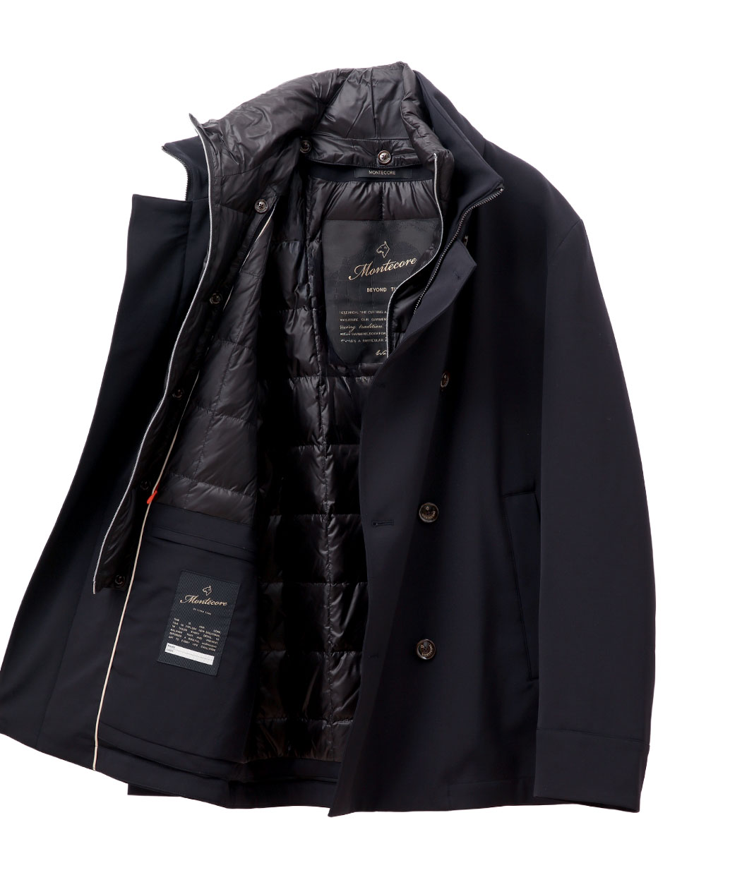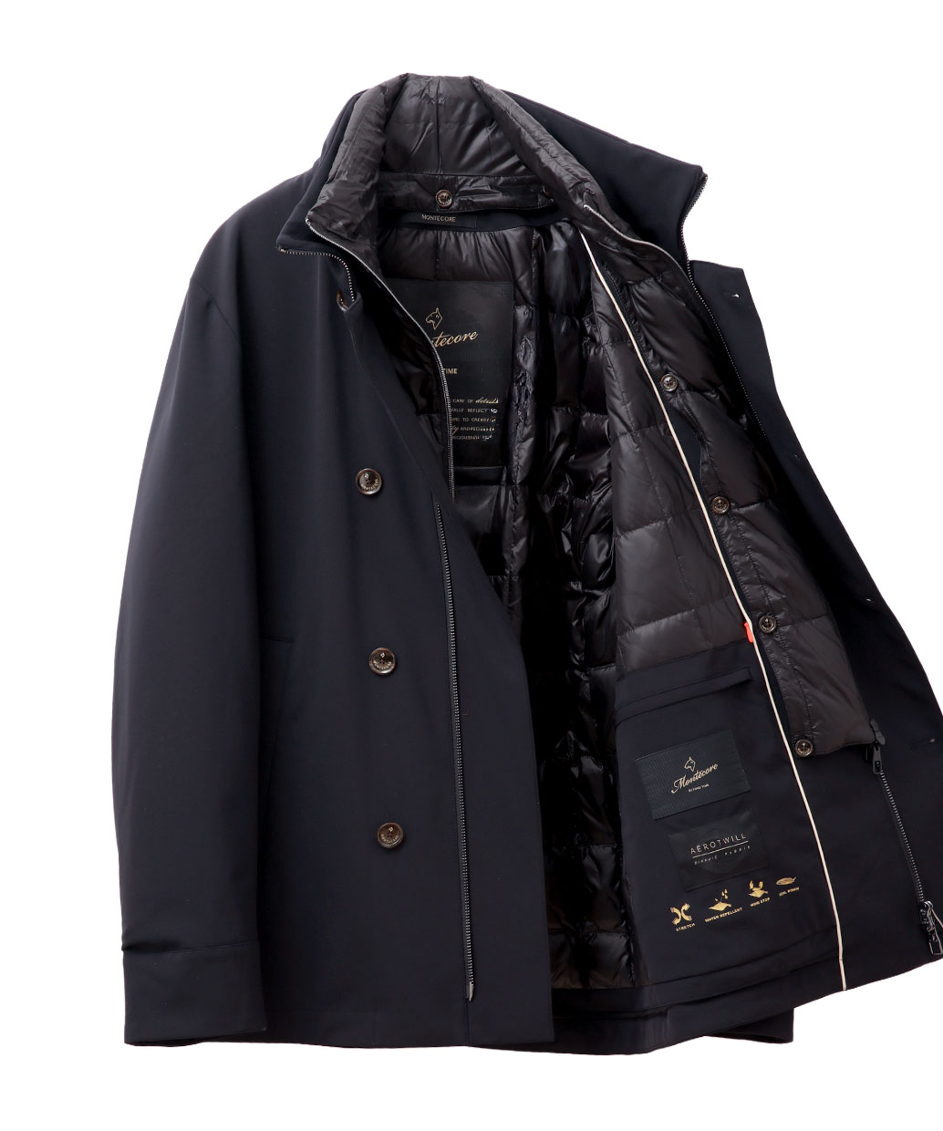 モンテコーレならではのテーラリング技術で仕立てた、ダブルフロントデザインのショートコートスタイルのダウンジャケット。ポリエステルをベースにポリウレタンをミックスした、サラリとしたストレッチ感のあるスポーティーな生地を使用。撥水加工により雨の日でも安心して着用でき、天候を気にせずアクティブに過ごせます。薄手ながら高い保温性を持つダウンライニングを採用し、フロントには着脱可能なダウン前立てを配することで、レイヤードスタイルのような着こなしも楽しめる一着です。