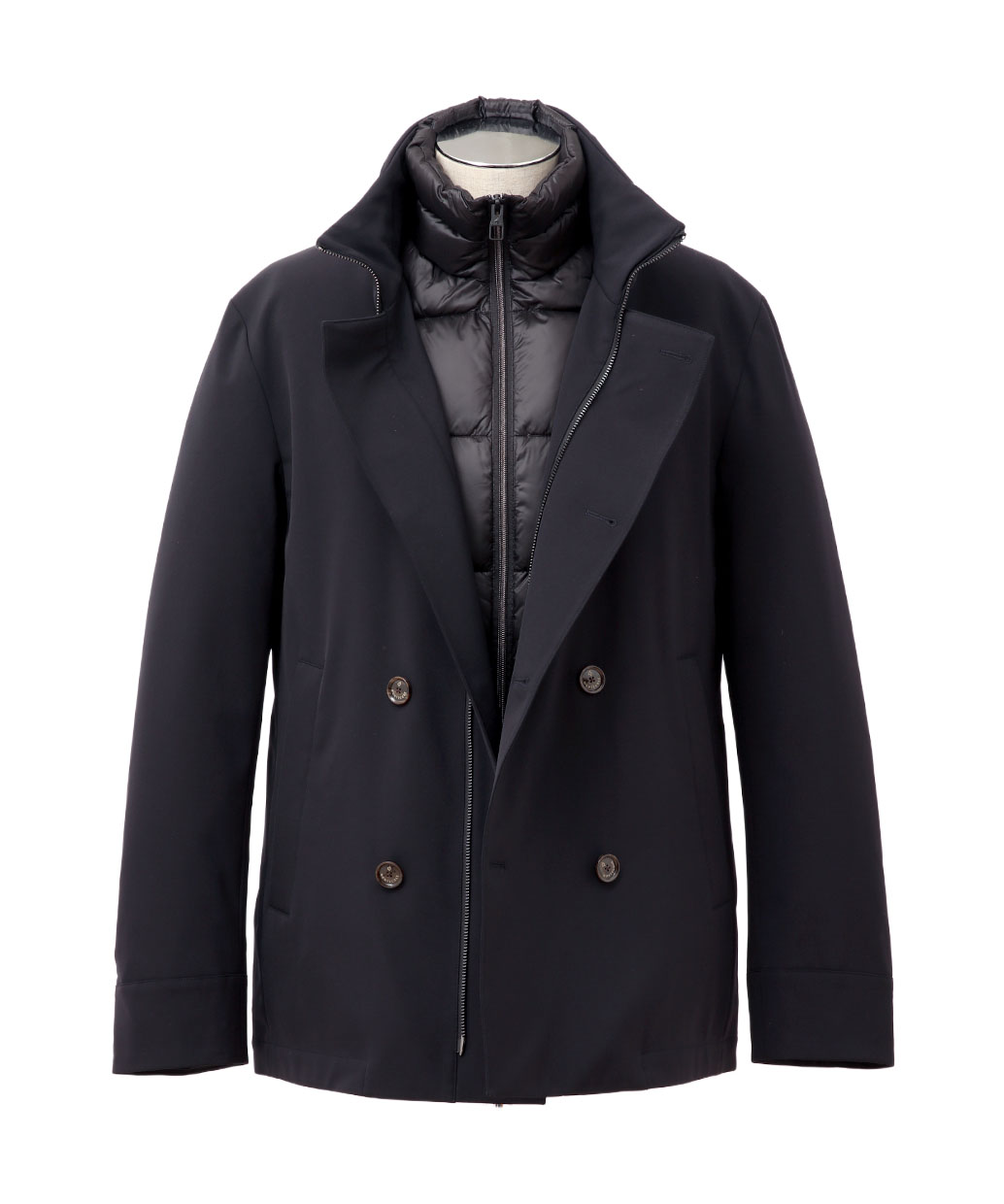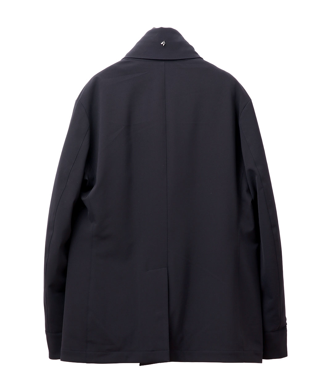 テーラリング技術光るストレッチ&撥水生地で仕上げたレイヤードも楽しめるダブルフロントジャケット。