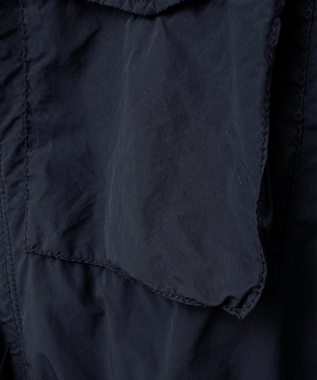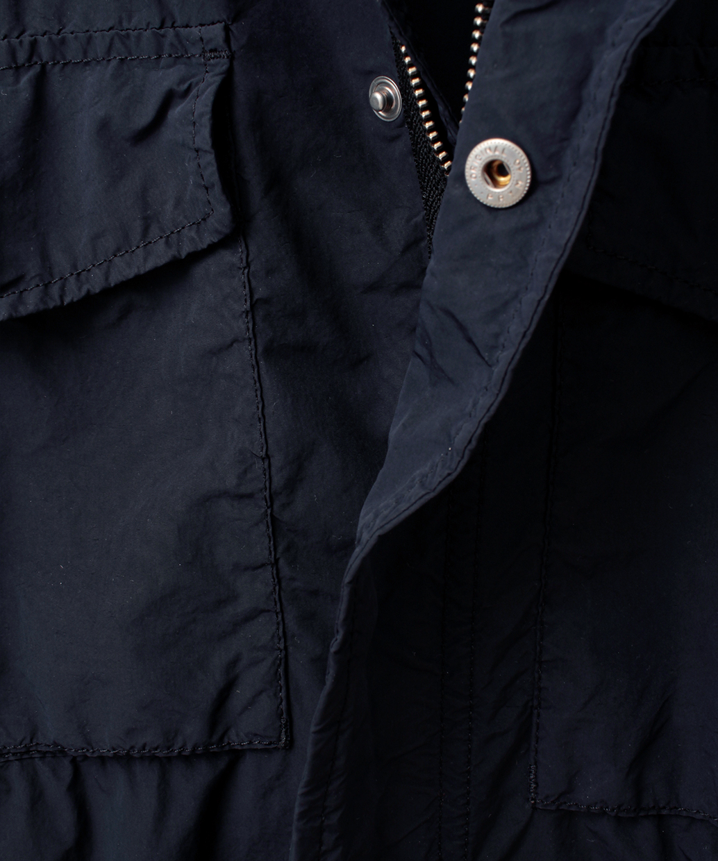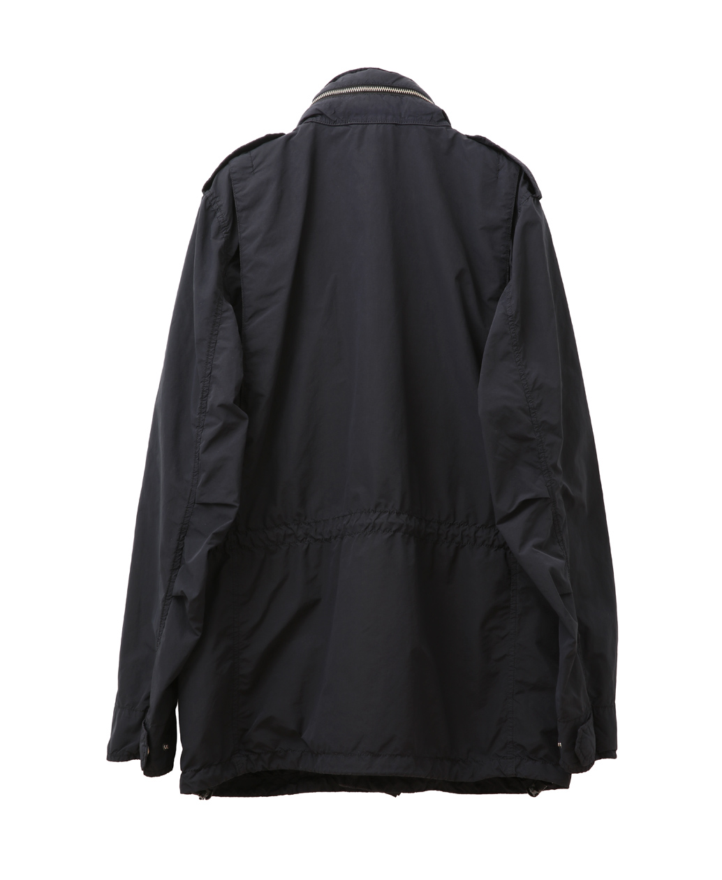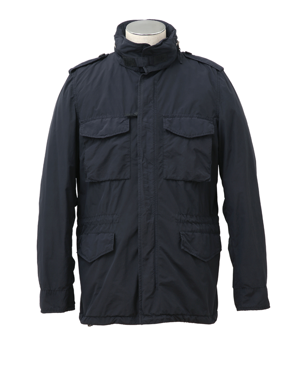 ポリエステルをベースにナイロンを混紡した高密度な生地に熱処理を施し、雨や風に強いハイテク素材へと昇華させた生地を使用した一着。ポリエステル比率を高めることでシャリ感と張り感のある上質な質感を実現しました。デザインはM-65スタイルを踏襲したフードを収納した立ち襟と、フロントに4つのポケットを配したハーフ丈フィールドジャケット。