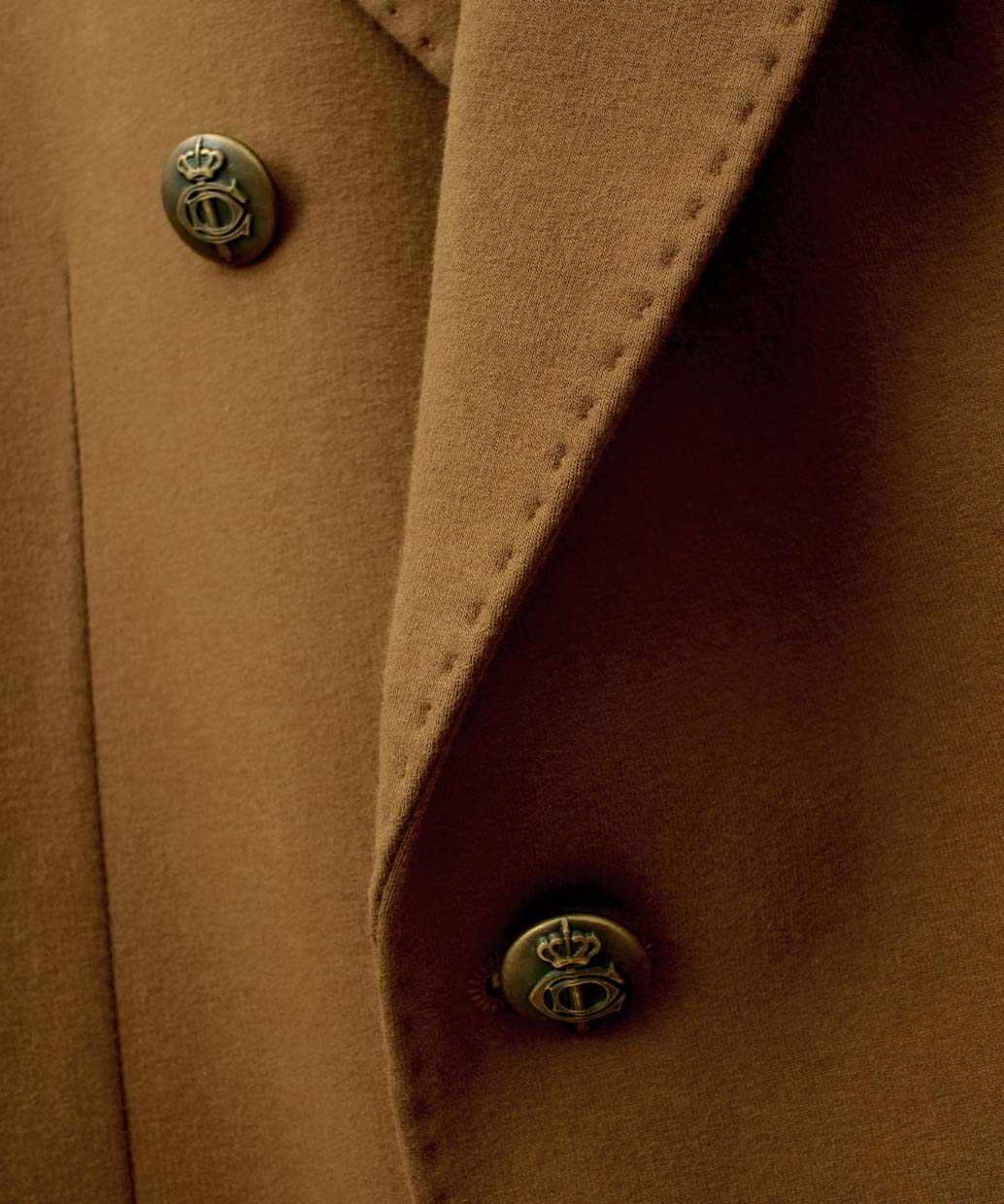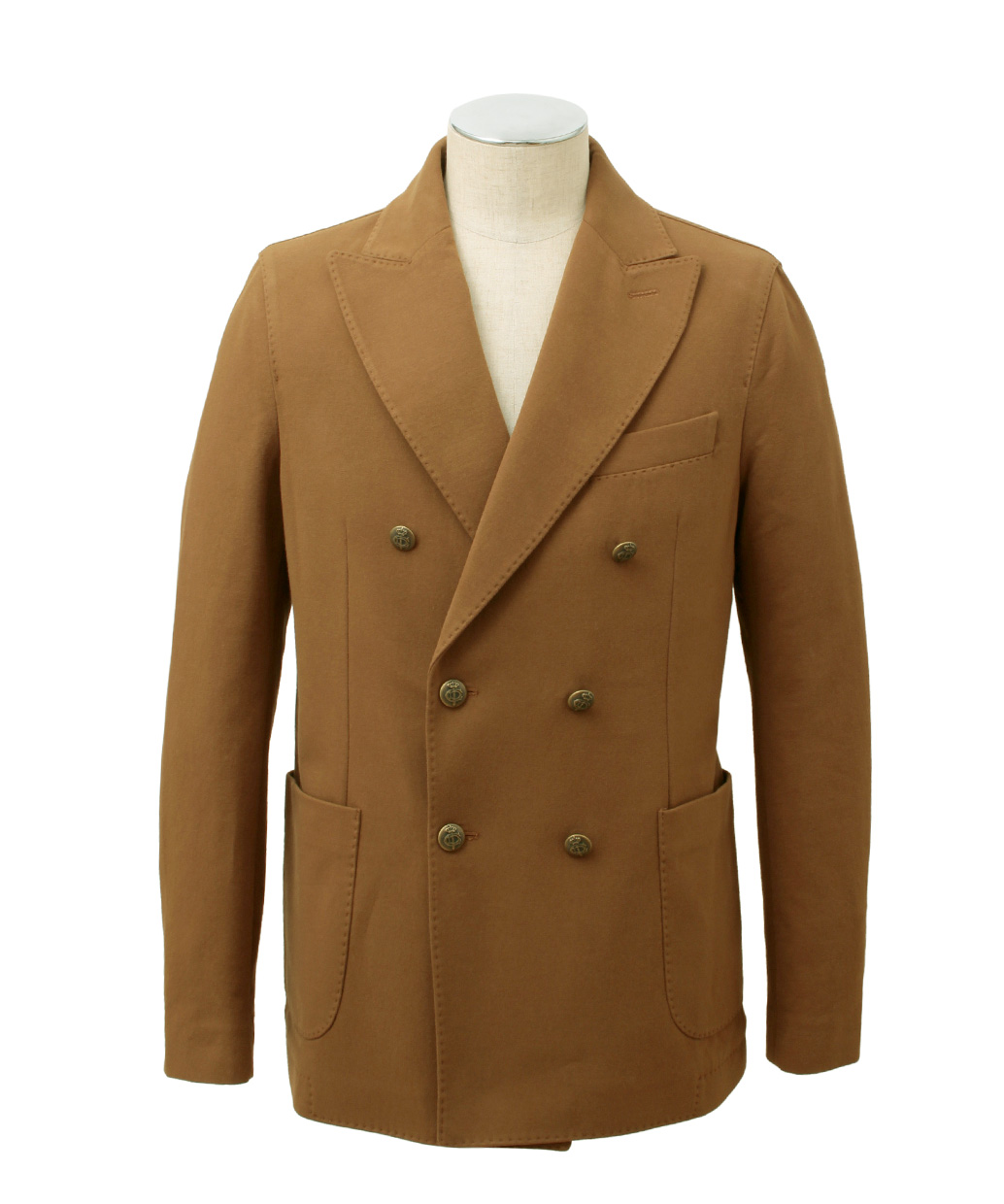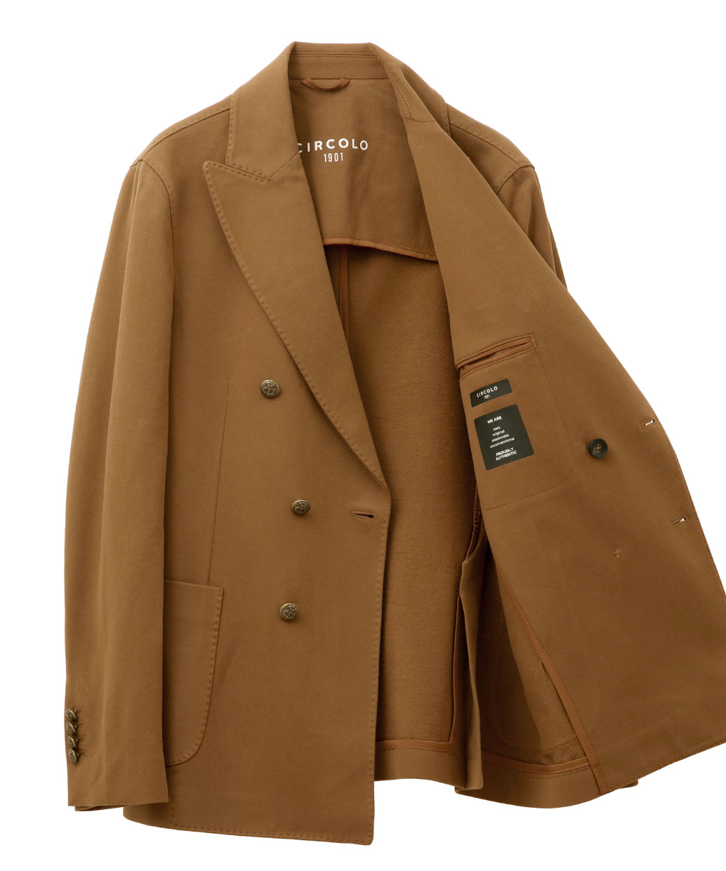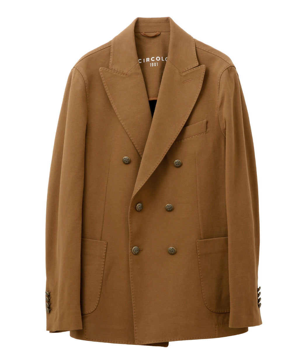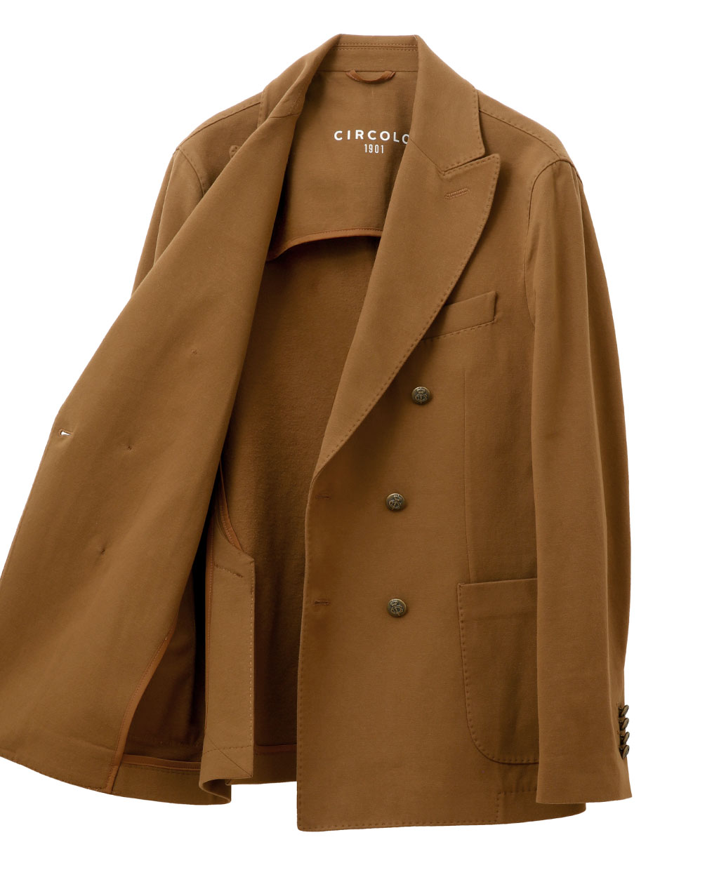 コットンをベースにポリウレタンをミックスした、チルコロが独自に開発したストレッチ性、保温性の高いコットンモールの様なジャージ生地で仕立てたジャケット。計算されたカッティングと丁寧な縫製でジャージ生地を使ったとは思えない美しいシルエットを作り出しています。ダブルフロントにメタルボタンをあしらい、重厚感とトラディショナルなムードを演出。見た目のクラシカルさと素材のリラックス感が絶妙に融合した一着です。デニムでカジュアルに、ウールパンツで品よく――幅広いスタイリングに対応する、ワードローブに加えたい万能ジャケットです。