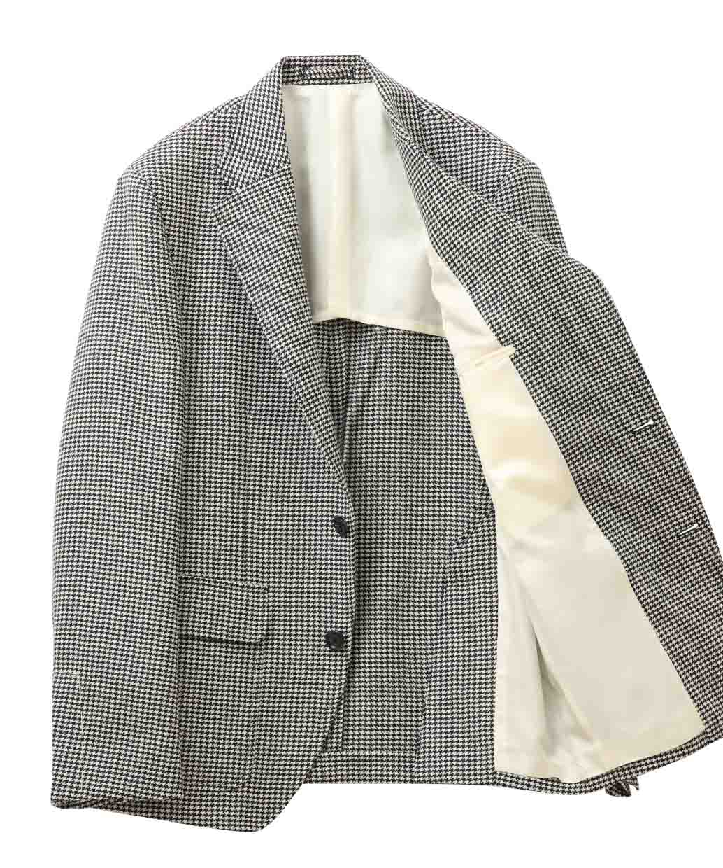 上質なメリノウールで織り上げた、ハウンドトゥース柄のエレガントなジャケット。