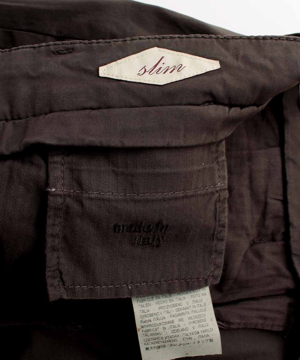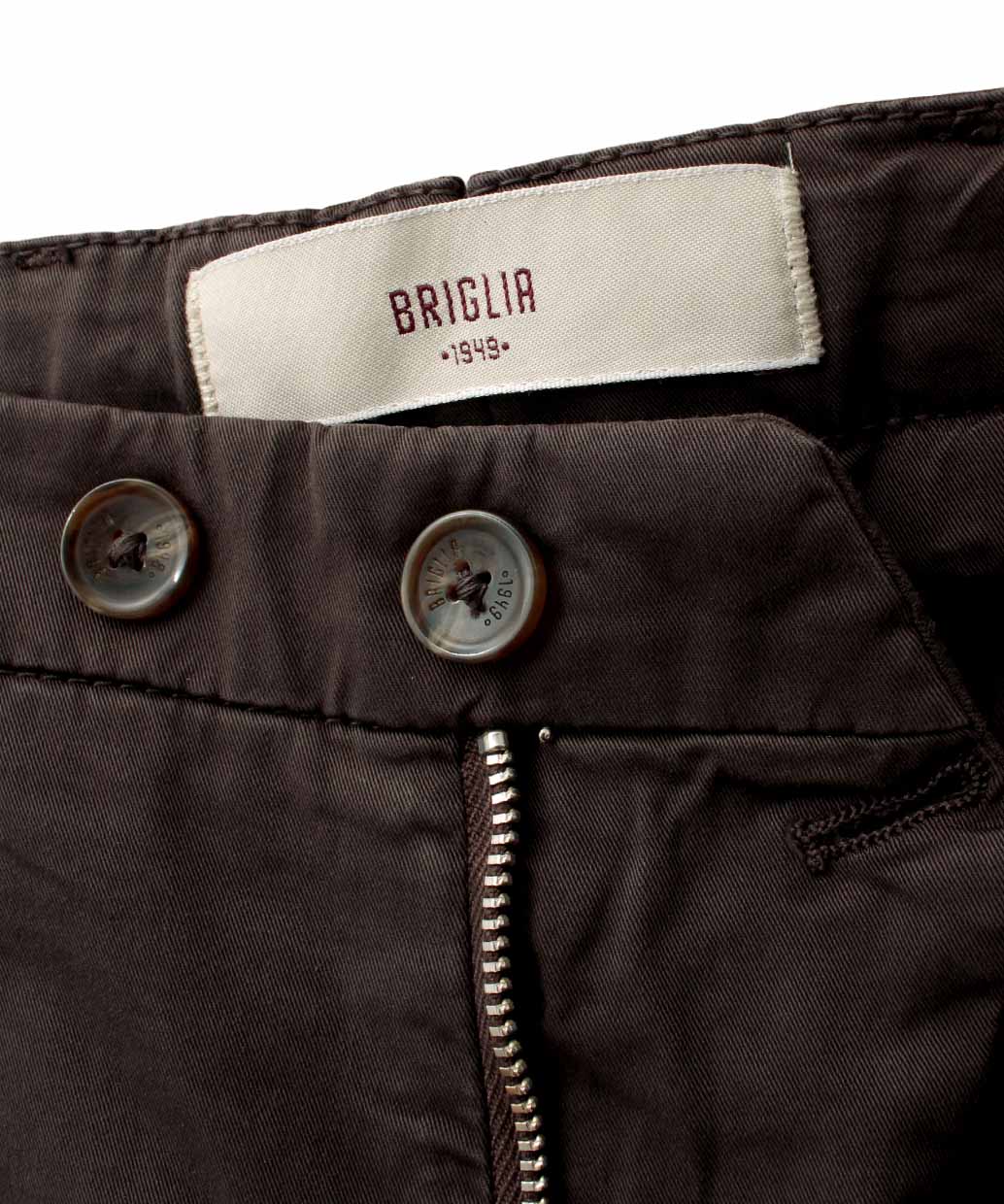 片玉縁ポケットとコインポケットを配したスラックスライクな表情に、BRIGLIA刻印のオリジナルボタンがさりげないクラス感を添えます。