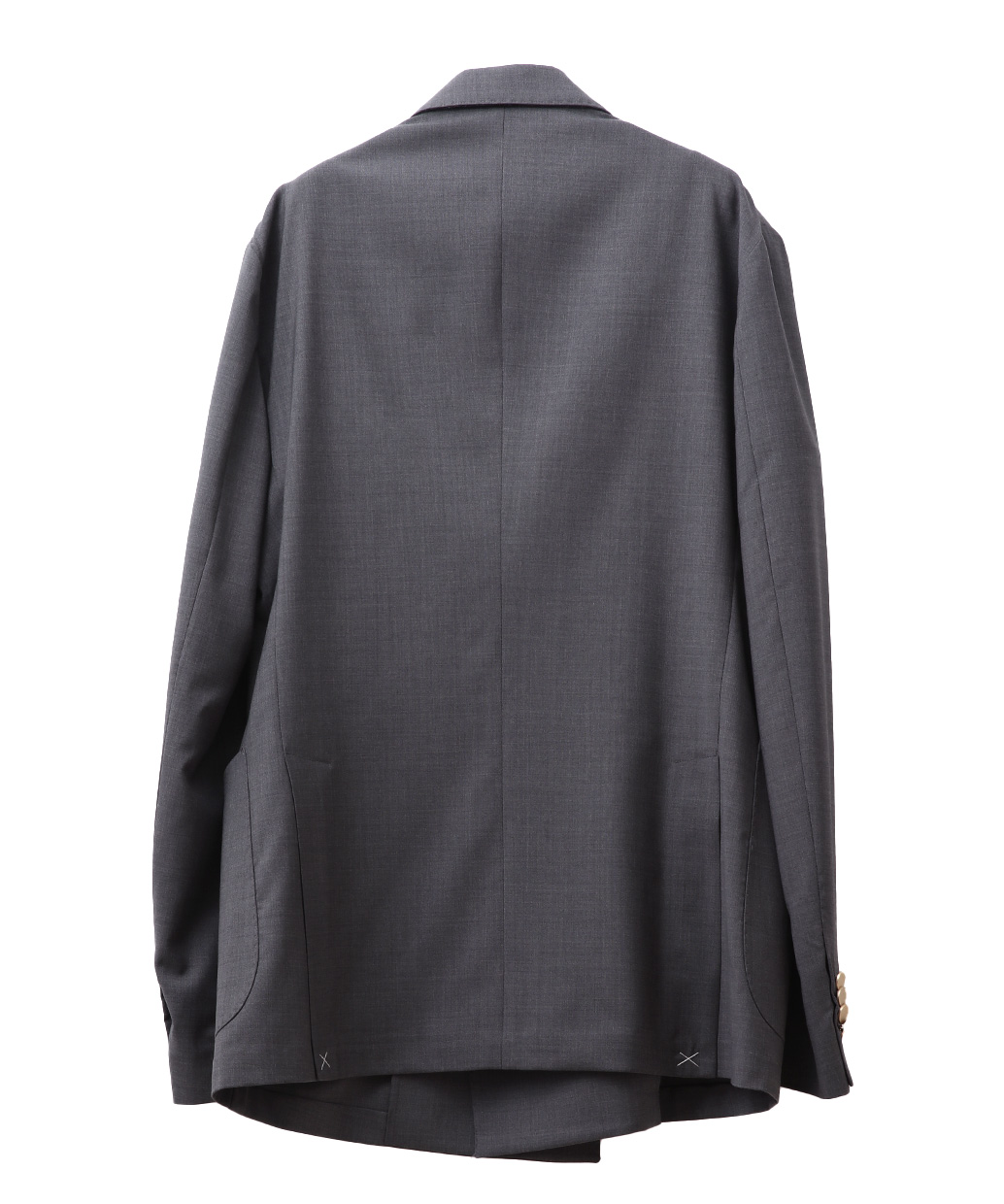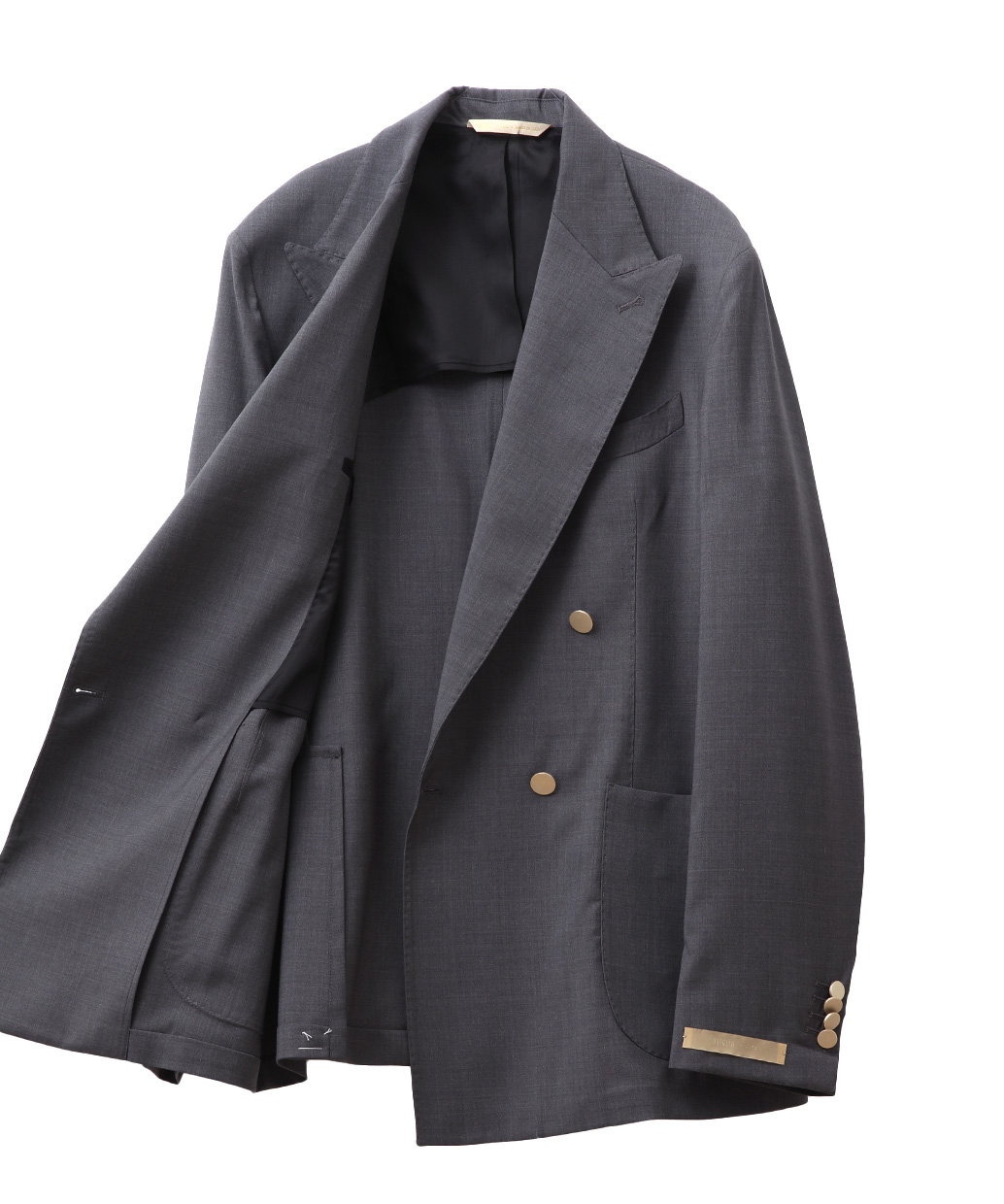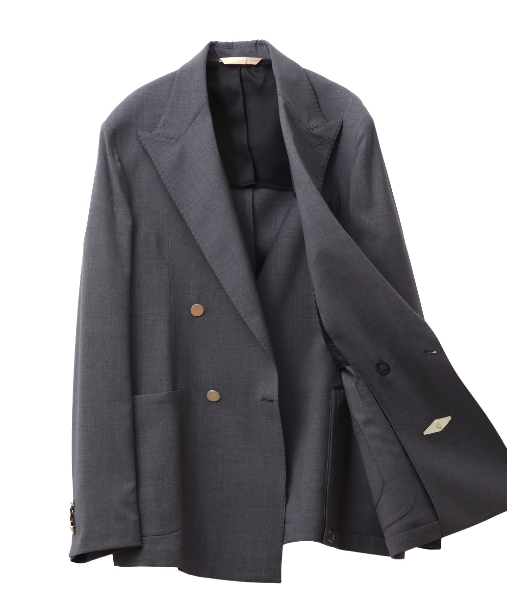 ラペルは凛とした表情を演出するピークドラペルを採用し、ダブルブレストならではの貫禄を上品に昇華。フロントにはメタルボタンを配し、クラシックなムードの中に程よい華やかさを添えています。胸元はバルカポケット、腰はパッチポケットを組み合わせ、ドレス感と軽快さのバランスを調整。背面はサイドベンツ仕様で可動域を確保し、着用時の立ち姿も美しく整えます。