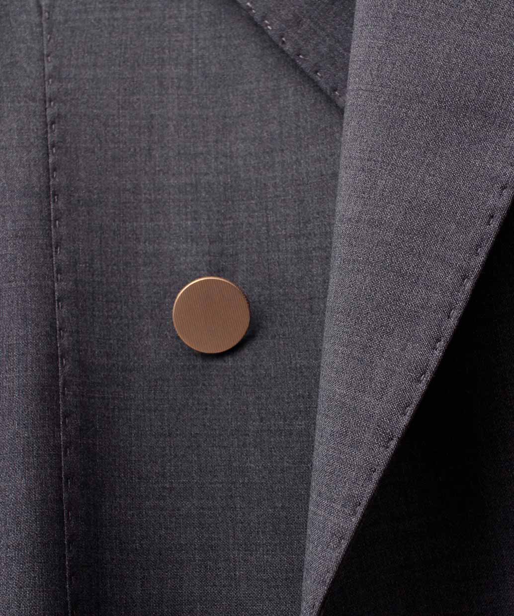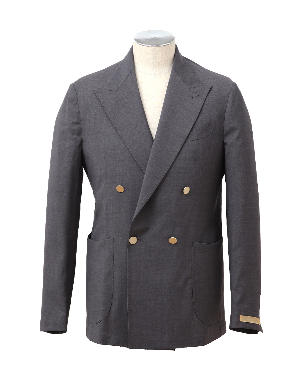 ・ピークドラペル×ダブル4ボタン(メタルボタン)で、端正さと華やかさを両立