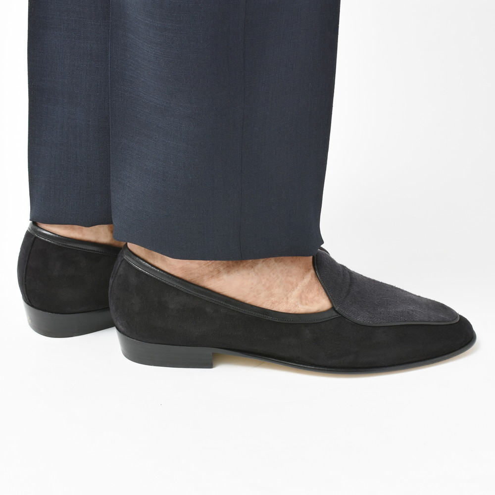 本来ベルジャンシューズは貴族の室内履きがルーツなので上品さが肝ではありますが、そこに敢えて粗野なシルクキャンバスを合わせるセンス、そこに逆に現代のモダニズムが凝縮されているように思います。