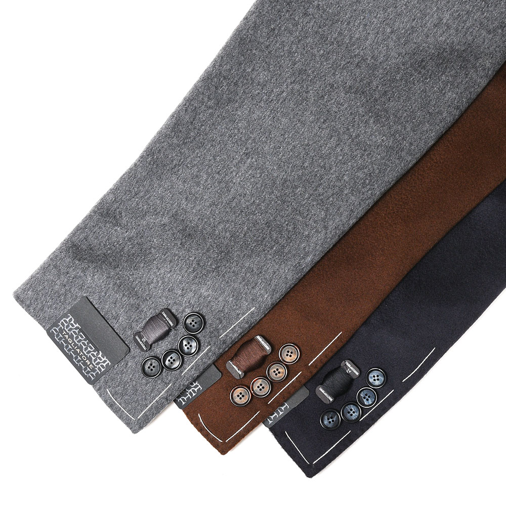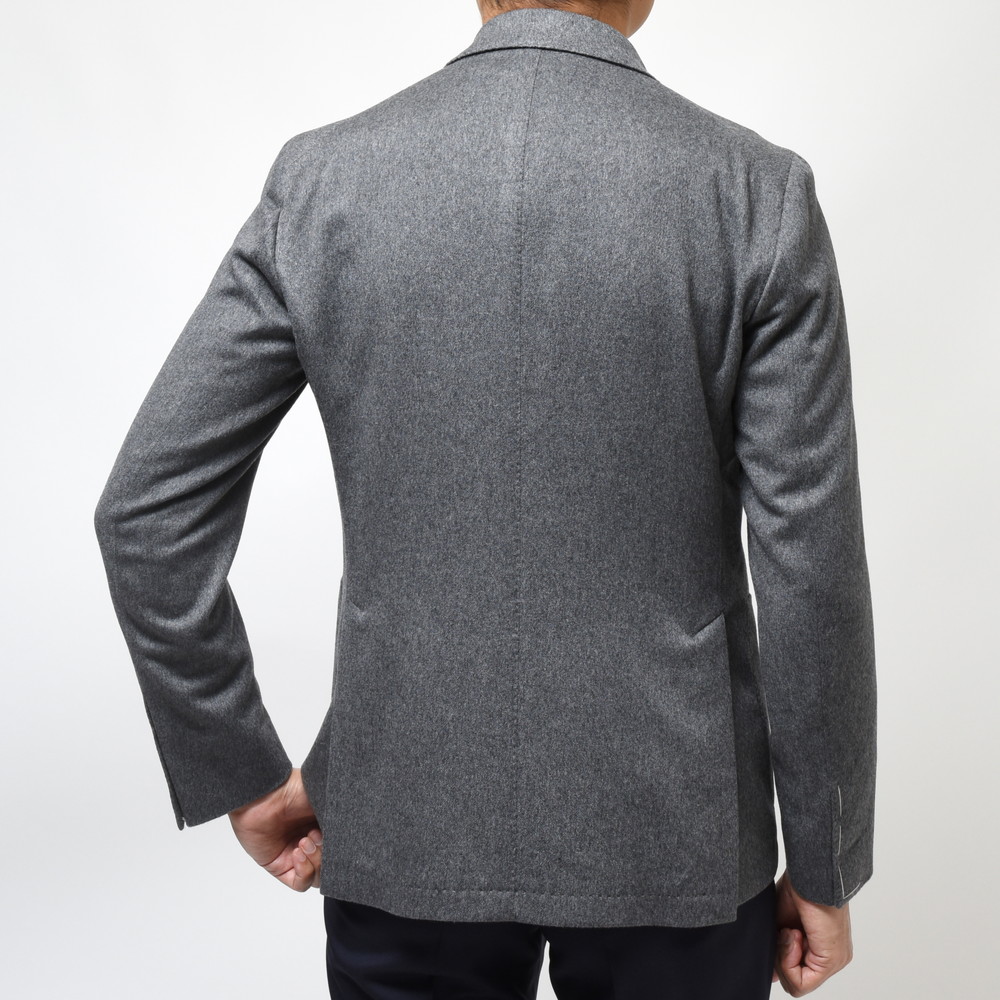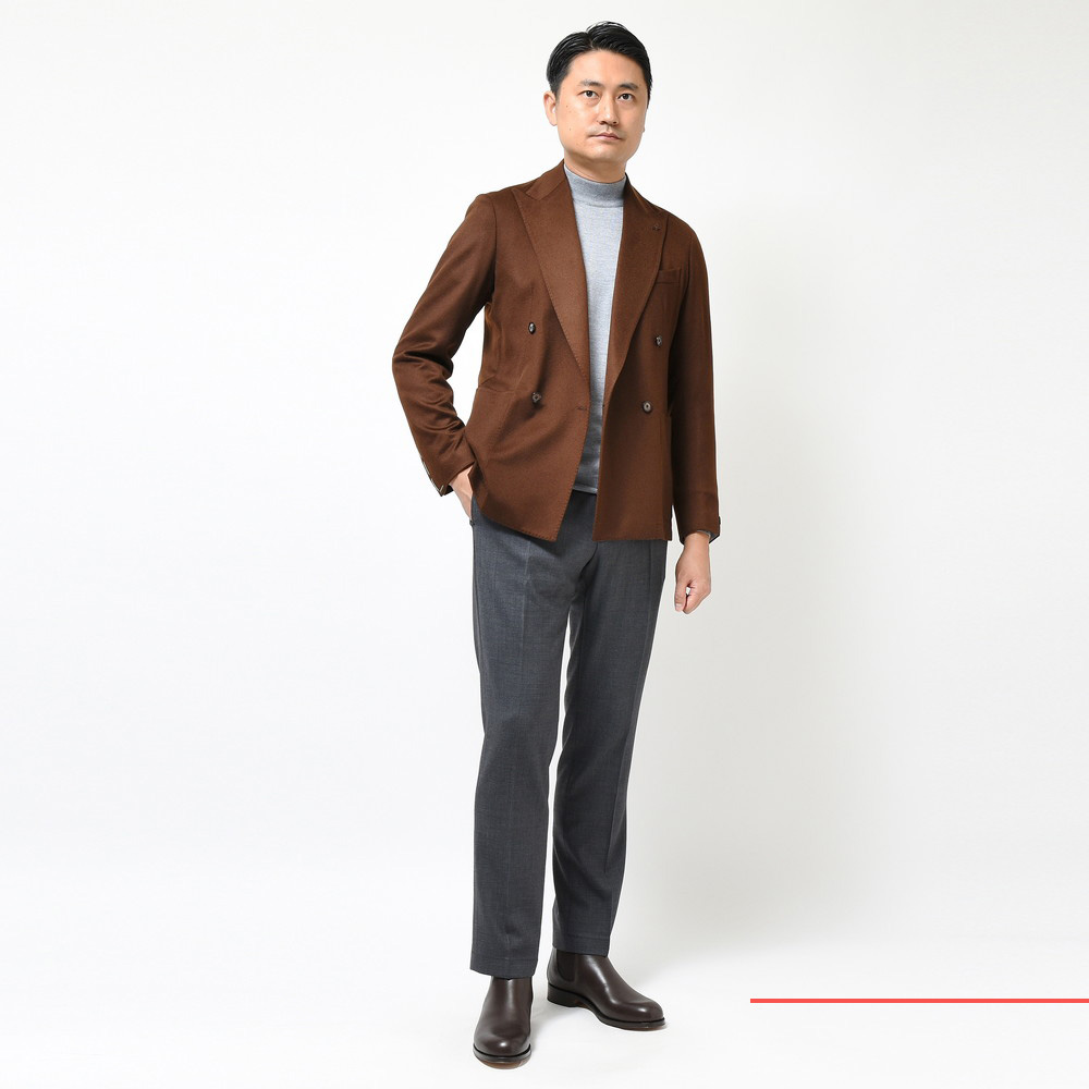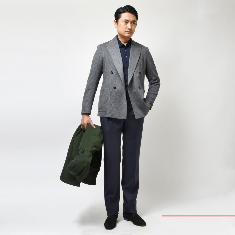 羽織った時にシングルにはない貫録があり、従来のダブルの重さや勢いを感じさせないモダンな仕上がりになっており、毎度お馴染みカシミアフランネルの雰囲気も手伝って、突出した今までにない新しいエレガンスを漂わせる仕上がりになっています。