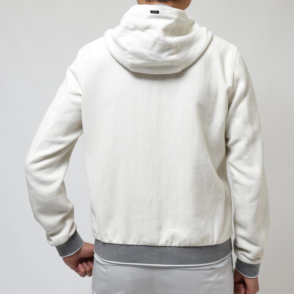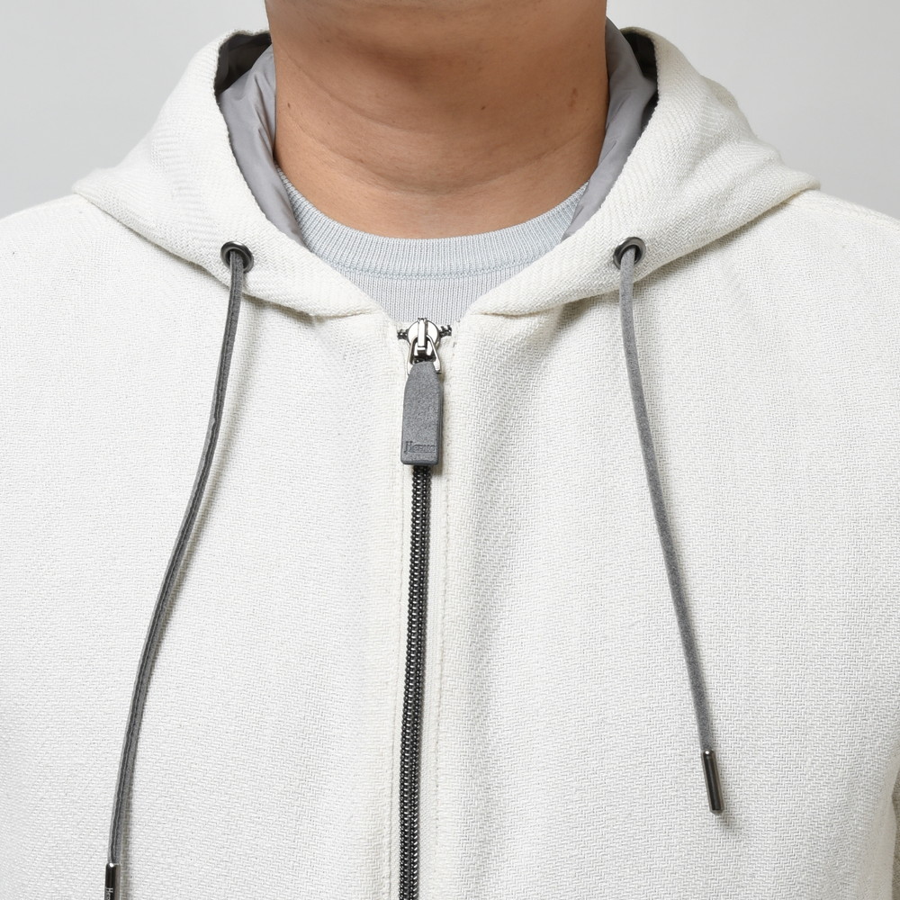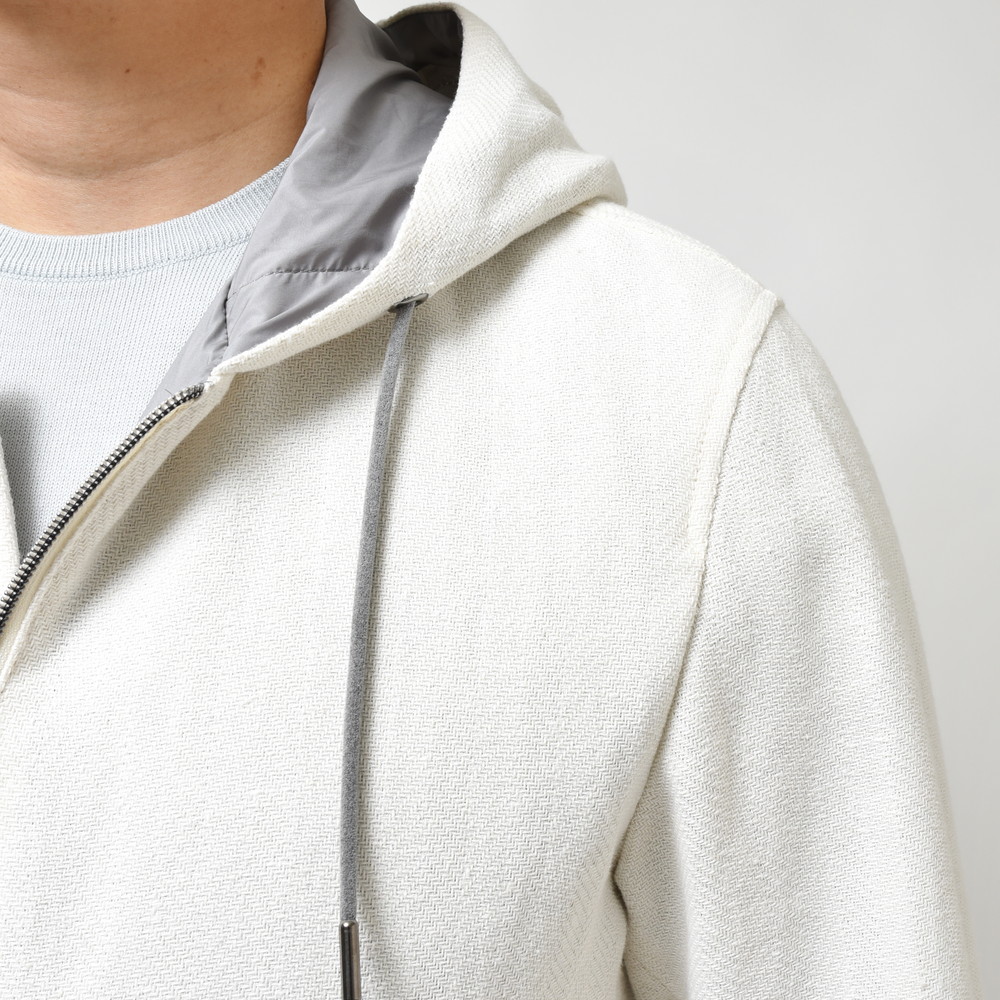 HERNO(ヘルノ)が提案するサステナブルファブリックを用いたコレクション“Globeグローブ”ラインのジップフーディーは、一見してサステナブル感を全く感じさせない、エレガント極まりない仕上がりになっています。