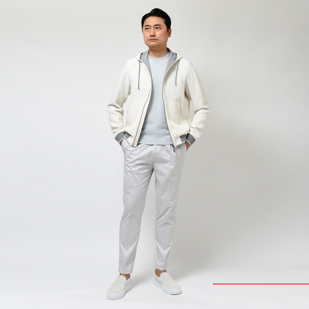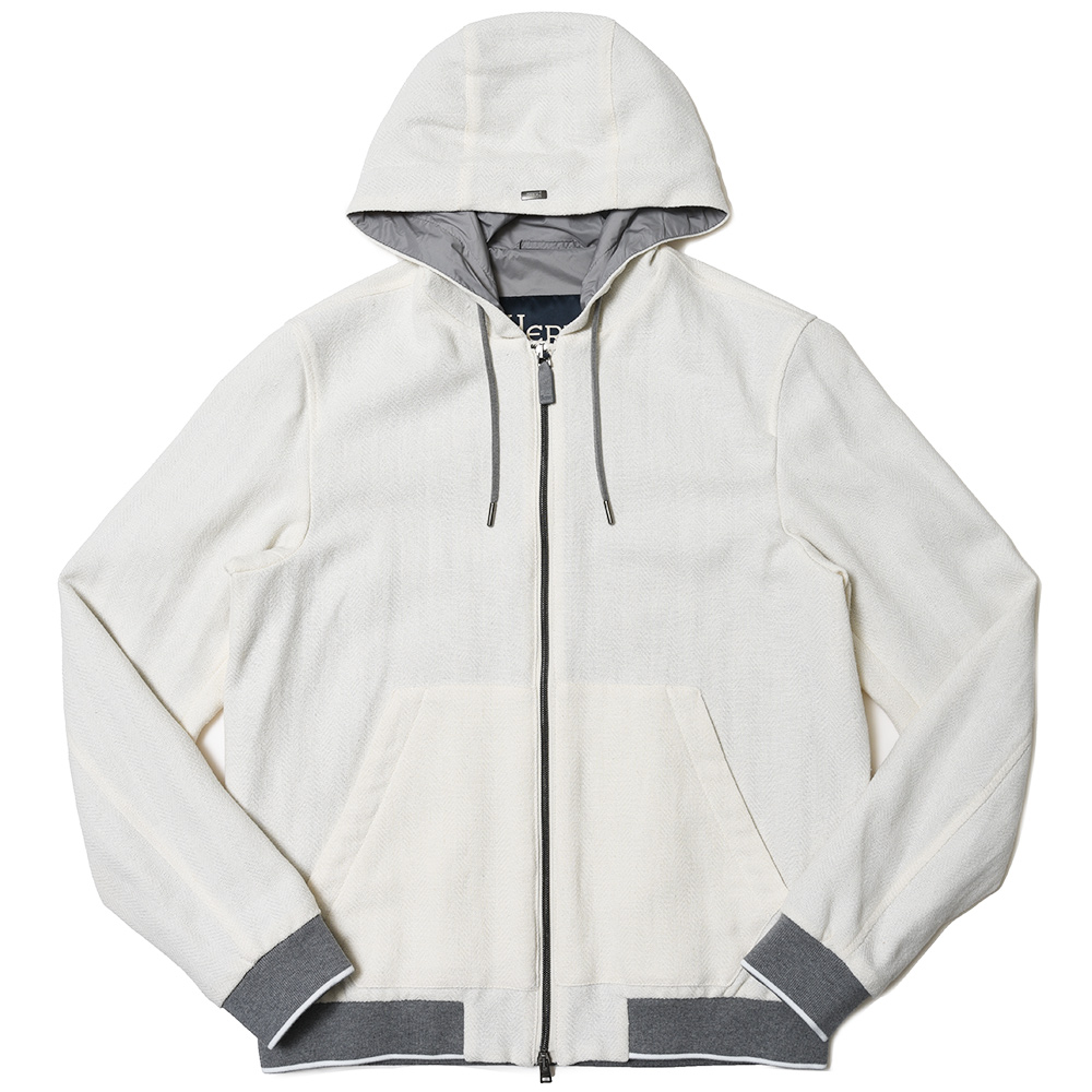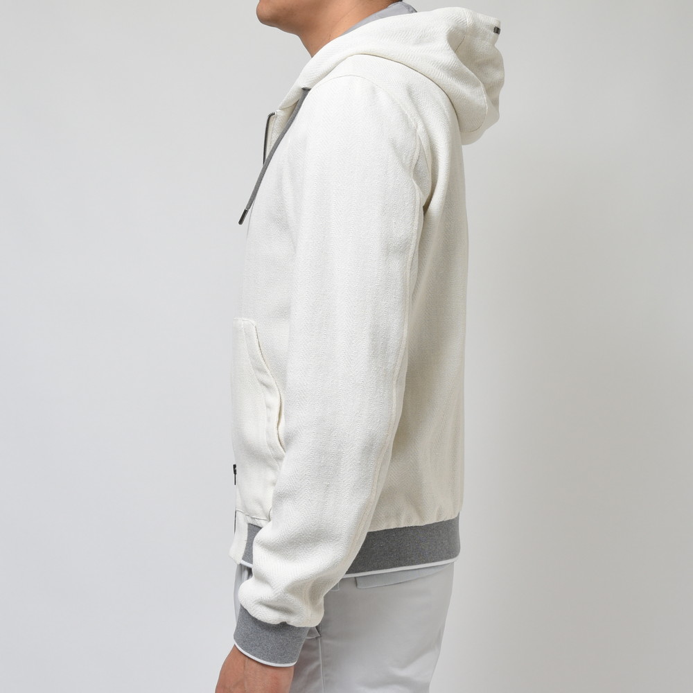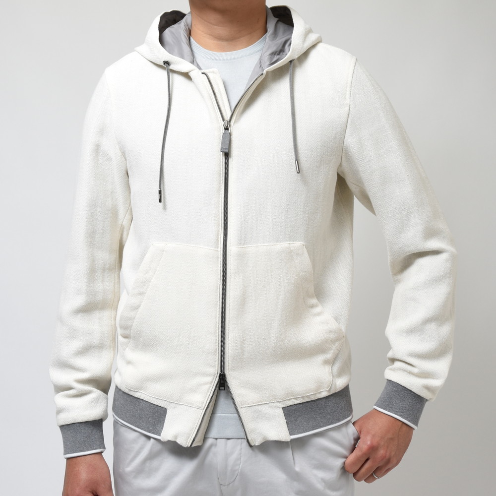 HERNO(ヘルノ)が提案するサステナブルファブリックを用いたコレクション“Globeグローブ”ラインのジップフーディーは、一見してサステナブル感を全く感じさせない、エレガント極まりない仕上がりになっています。