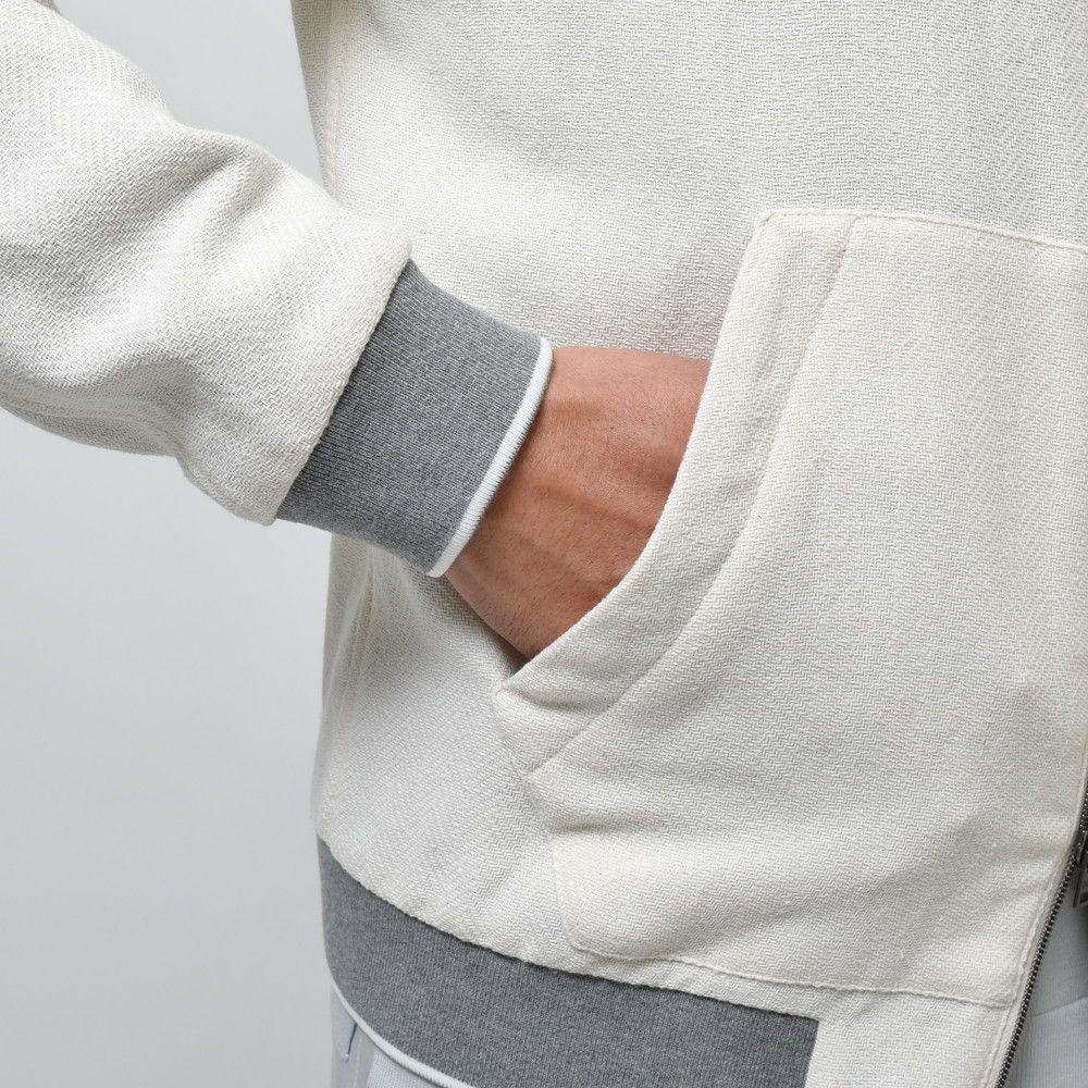 とにかく手が込んでいます。生地をヘリンボーンに織る必要はないと思いますし、リブにラインを入れる必要もありません。さらにジップの持ち手やフードのドローコードがアルカンターラである必要もないんです。