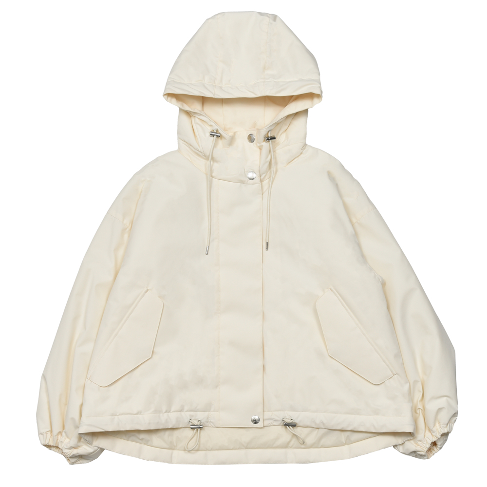 オーバーサイズのコートやショートブルゾンと合わせて頂くとバランス良く収まりますし、一枚で着てもフードを絞る平紐が絶妙なアクセントになり、スタイルがキリッと引き締まるんです。