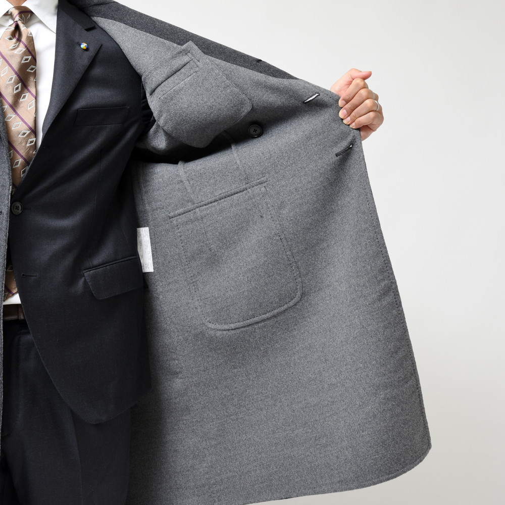 別注というわけではありませんが、日本でgujiだけが取り扱うBelvest(ベルベスト)のダブルフェイス生地を用いたダブルブレストコートがこちらです。