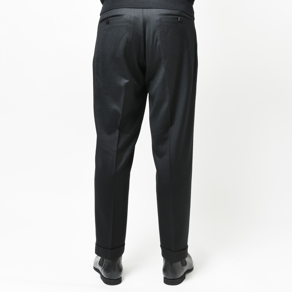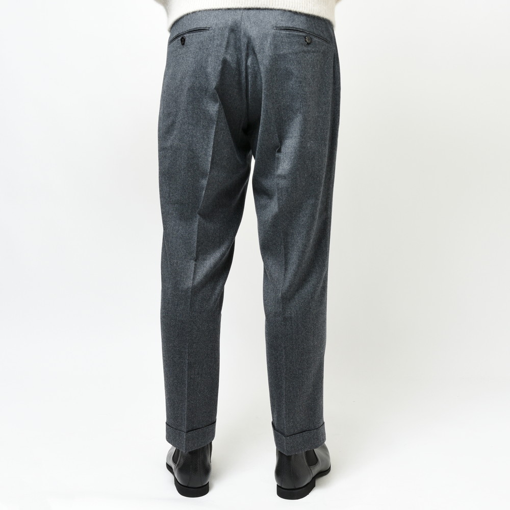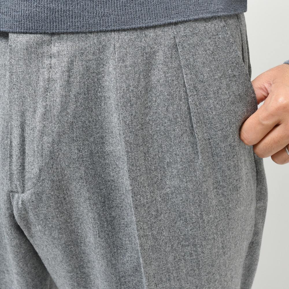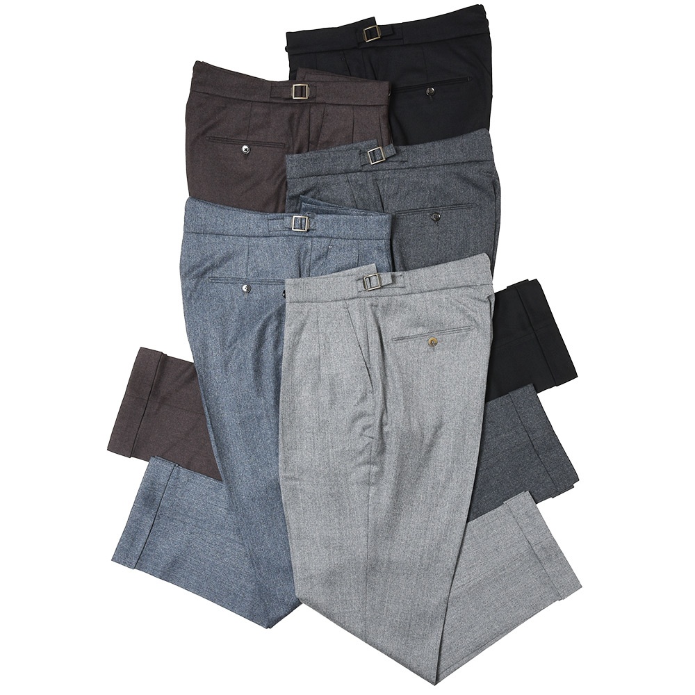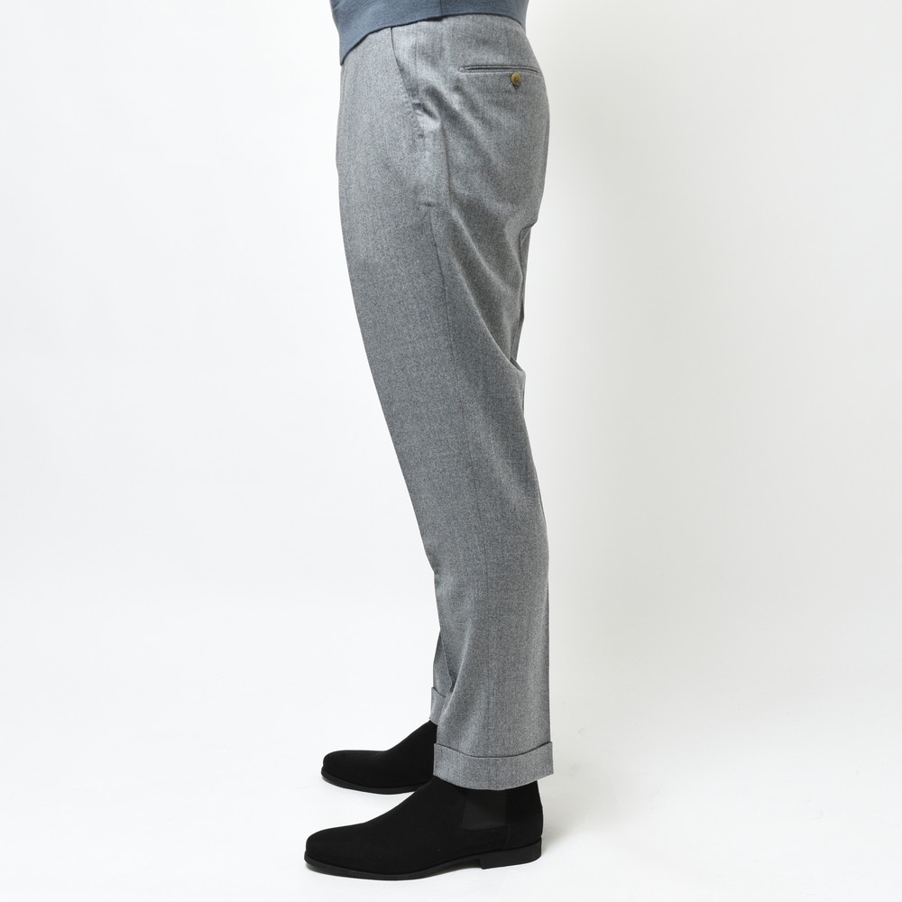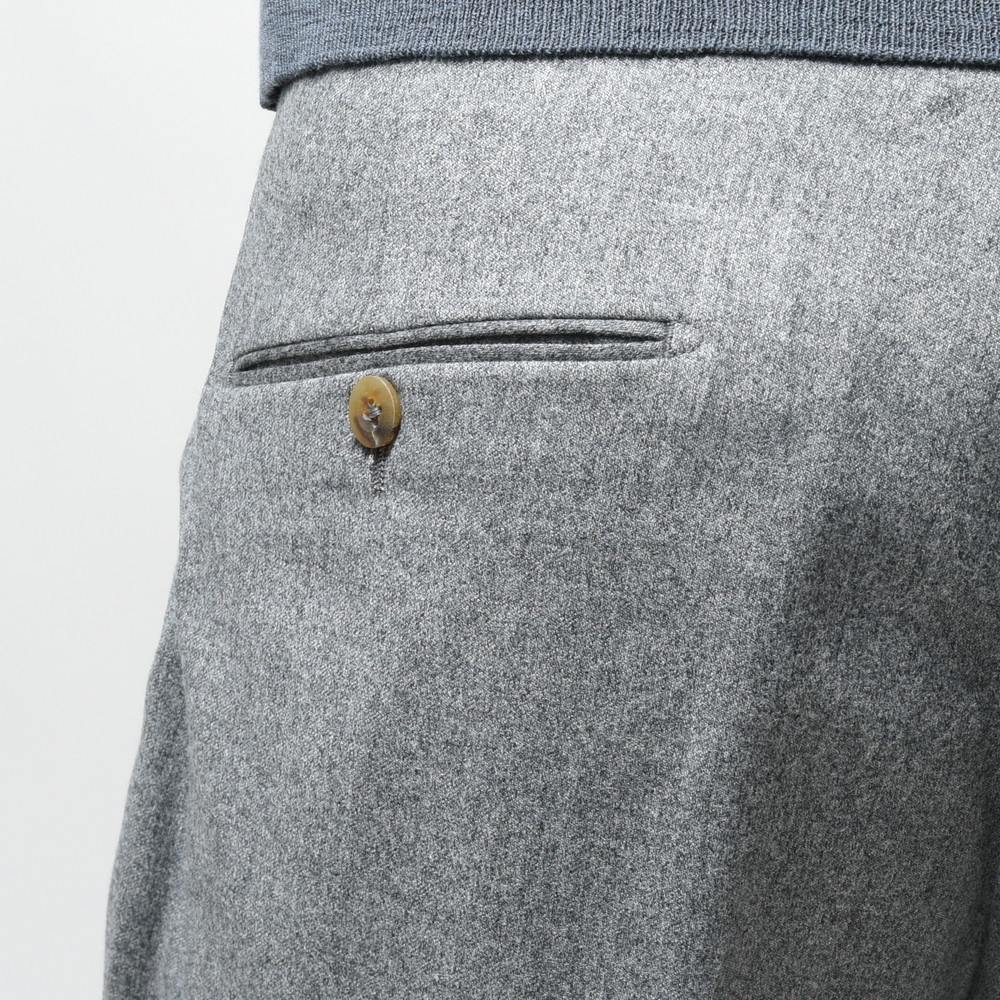そしてクラシカルな2プリーツ、サイドアジャスター仕様。これらの要素により様々な脚の形に合わせることができるベーシックパンツです。