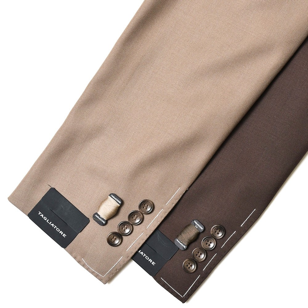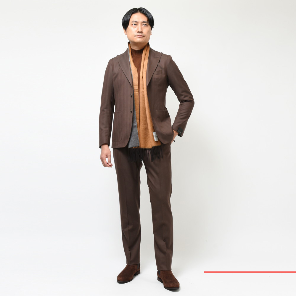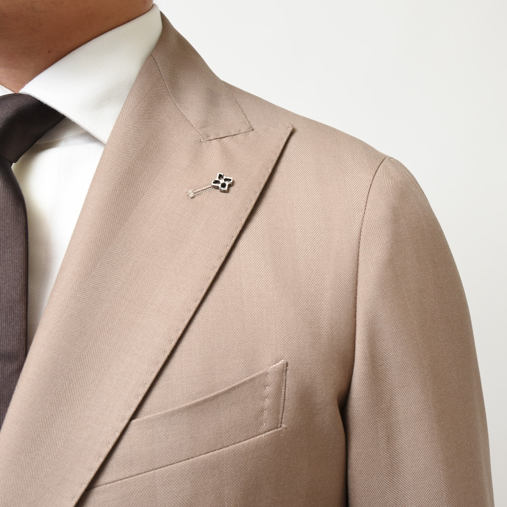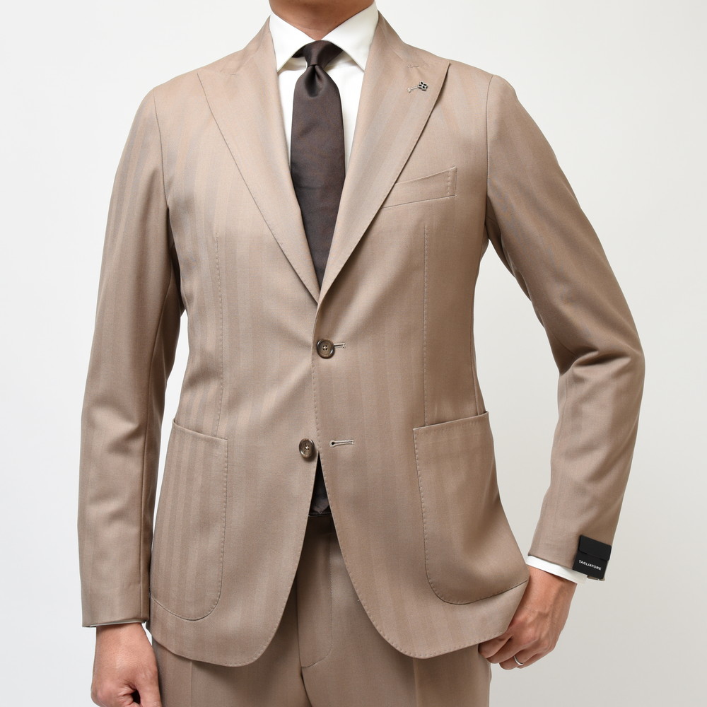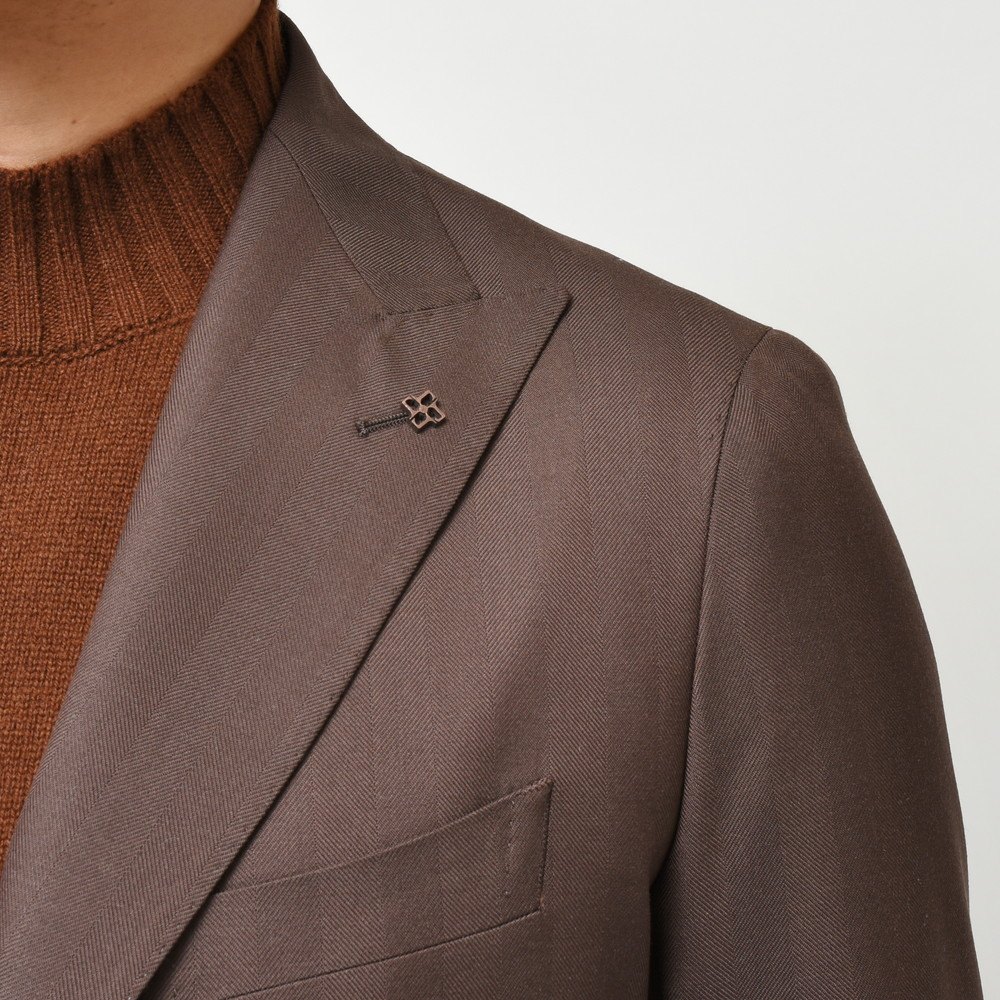 TAGLIATOREらしいヘリンボーンの表現と言いますか、イタリアブランドが得意とする感じですよね。奇をてらわずストレートに華やかな印象を付加できるジャケットだと思います。