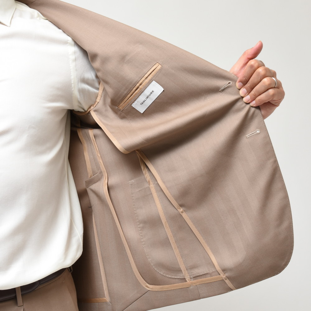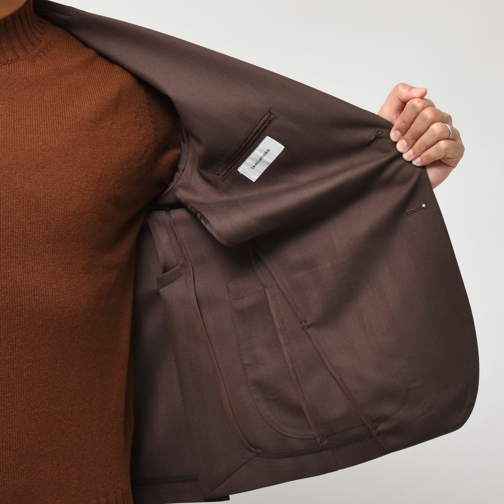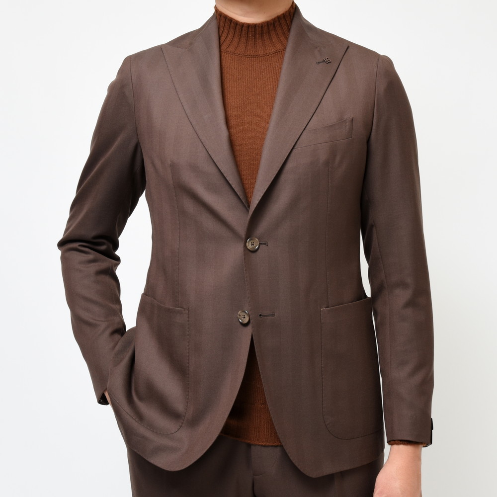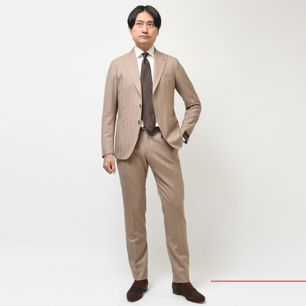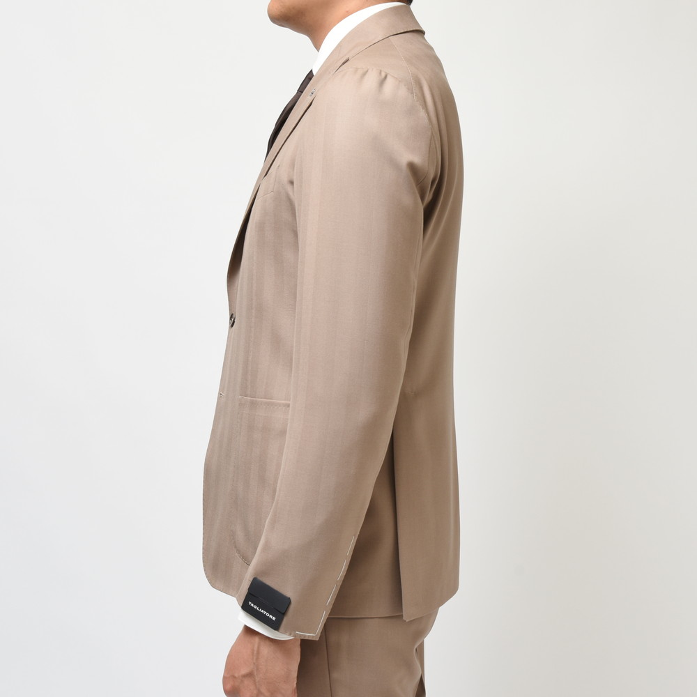 TAGLIATOREらしいヘリンボーンの表現と言いますか、イタリアブランドが得意とする感じですよね。奇をてらわずストレートに華やかな印象を付加できるジャケットだと思います。