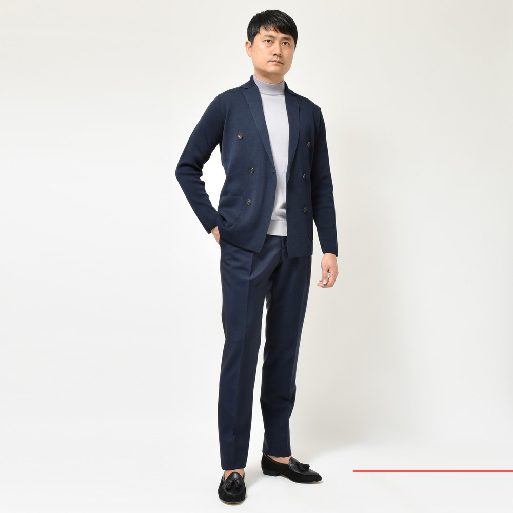 ニット特有のリラックス感がありながら、ジャケットライクなカッチリ感があり、そのハイブリッドなムードがニットジャケットの魅力。FILIPPO DE LAURENTIISはニット仕立てがベースなのでリラックステイストがあり、カジュアルビジネススタイルからオフシーンのスマートカジュアルまで幅広くカバー可能です。