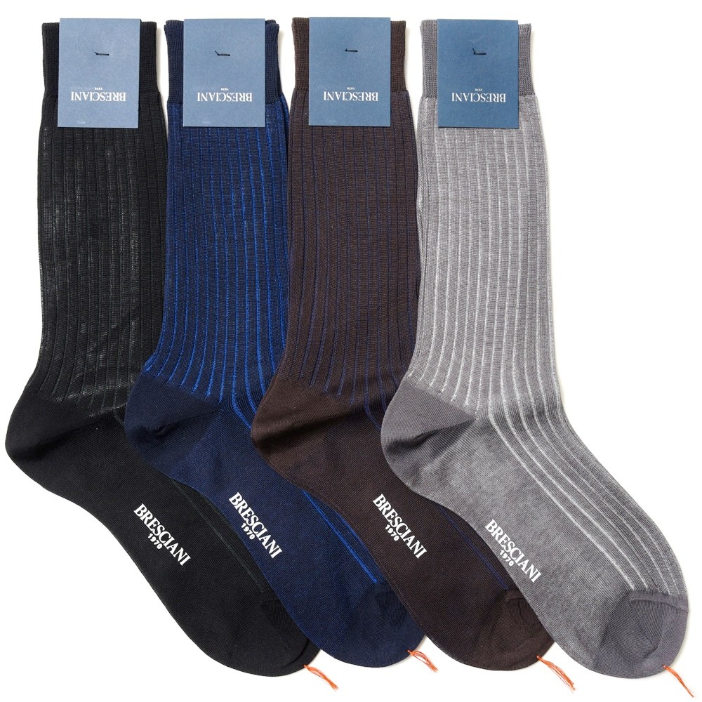 二色の糸を表裏に配し、畝部分を配色にしているBRESCIANI(ブレッシアーニ)のプレーティングリブソックス、履くとストライプ調に見えるクラシカルなスタイルです。