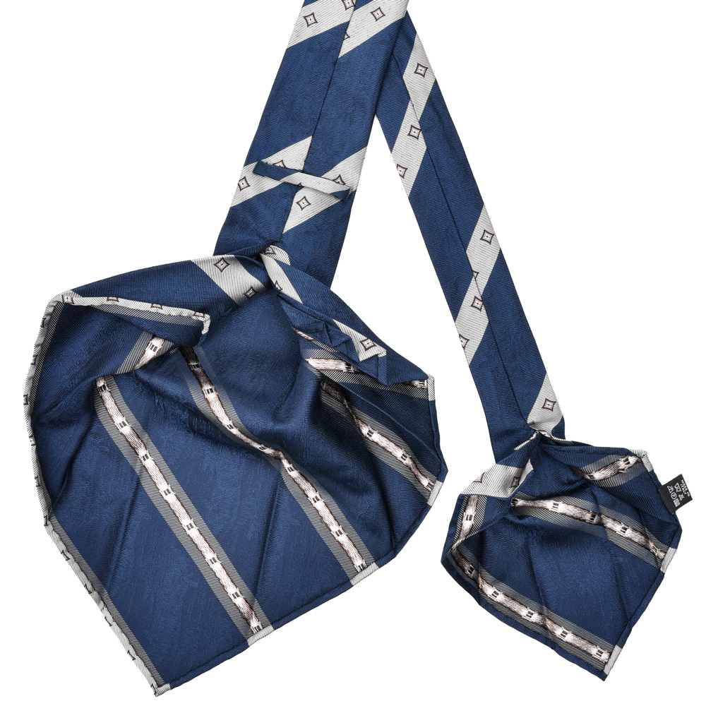 遠目にはダイナミックなストライプネクタイ、近くで見ると細かなスクエアモチーフやグラウンド部分の同色の織柄が施され、見どころたっぷりの一本となっています。